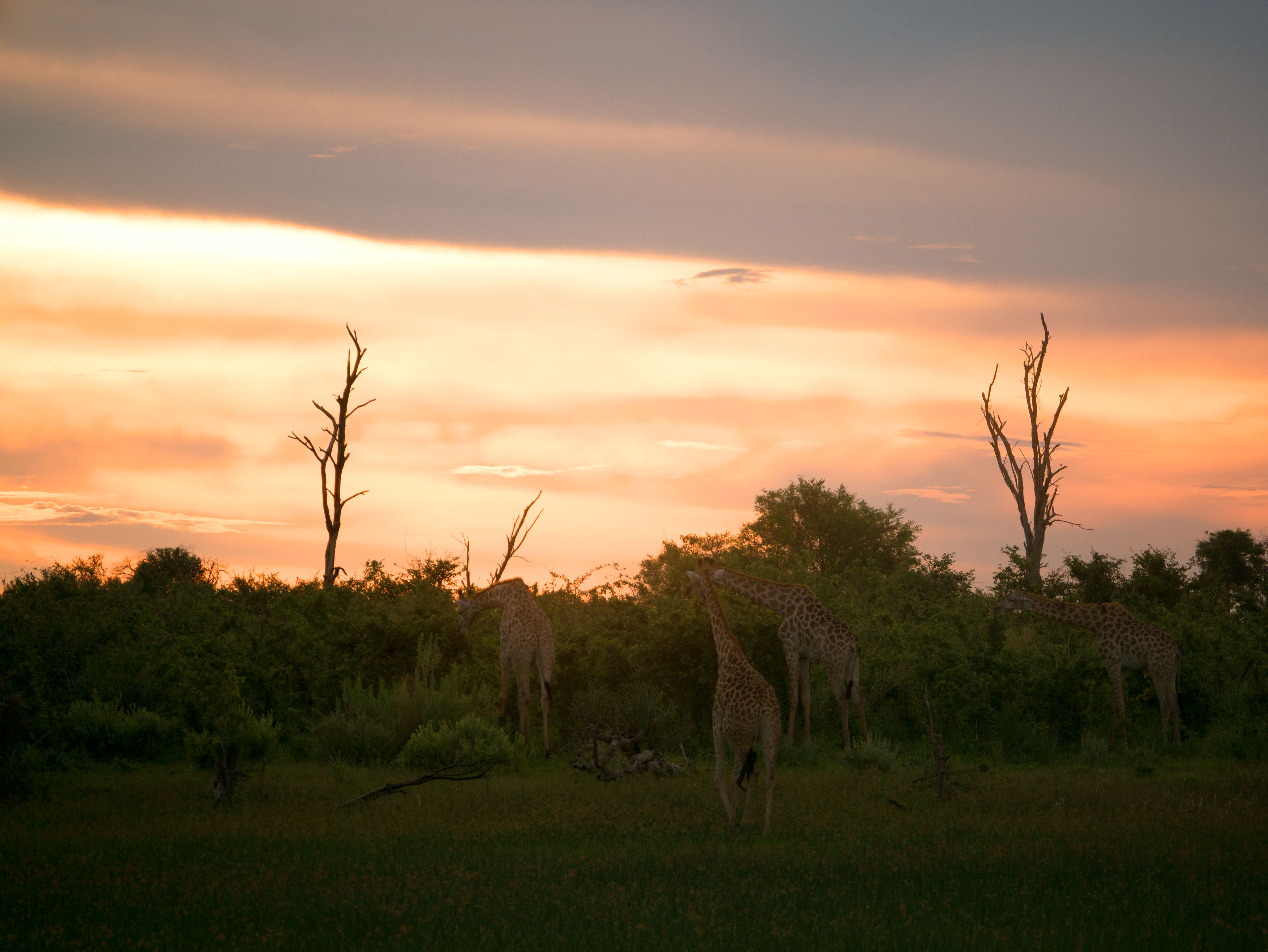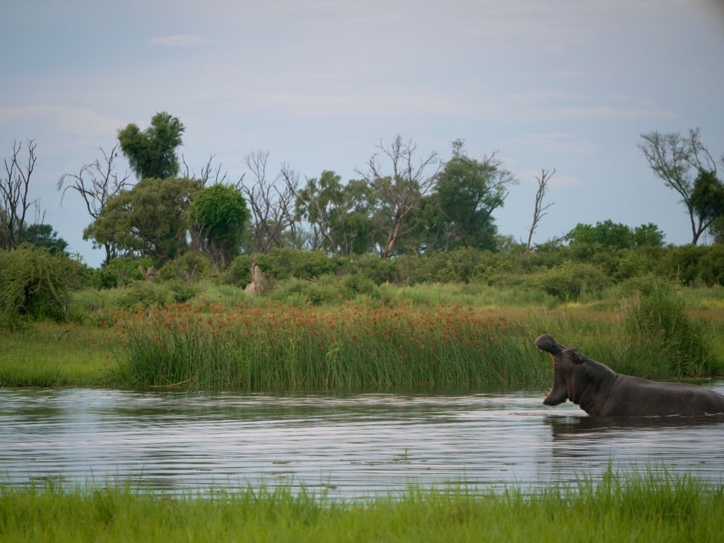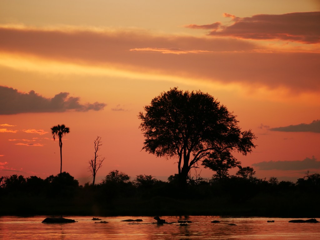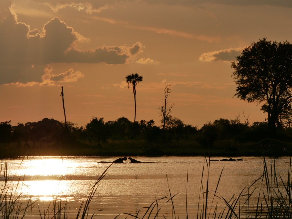Le soir, nous avons eu droit à une magnifique croisière en mokoro afin d’admirer le magnifique coucher de soleil depuis un petit lac accompagné d’hippopotames. Une fois le soleil couché, nous sommes rentrés au camp et les locaux ont partagés leurs traditions en chantant des chants locaux. Performance à couper le souffle !