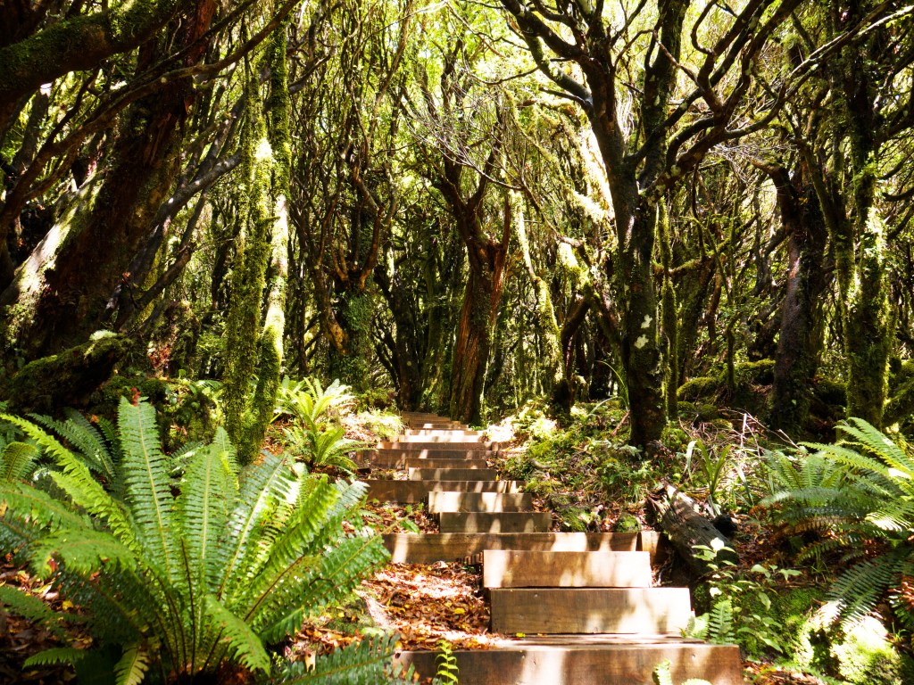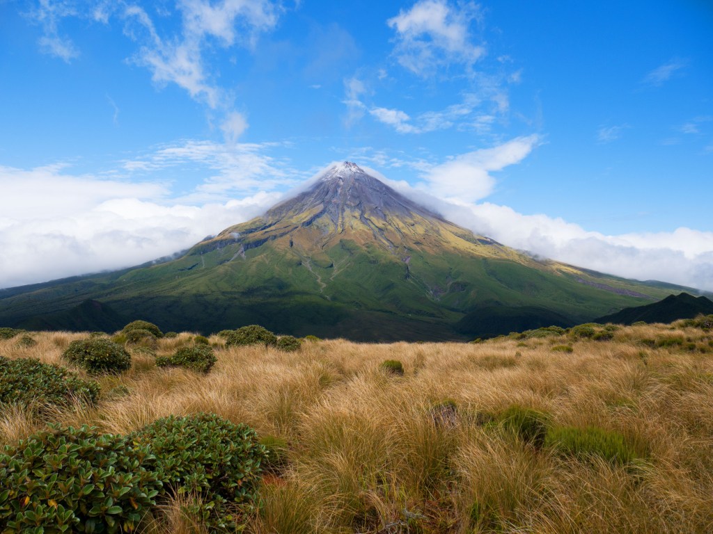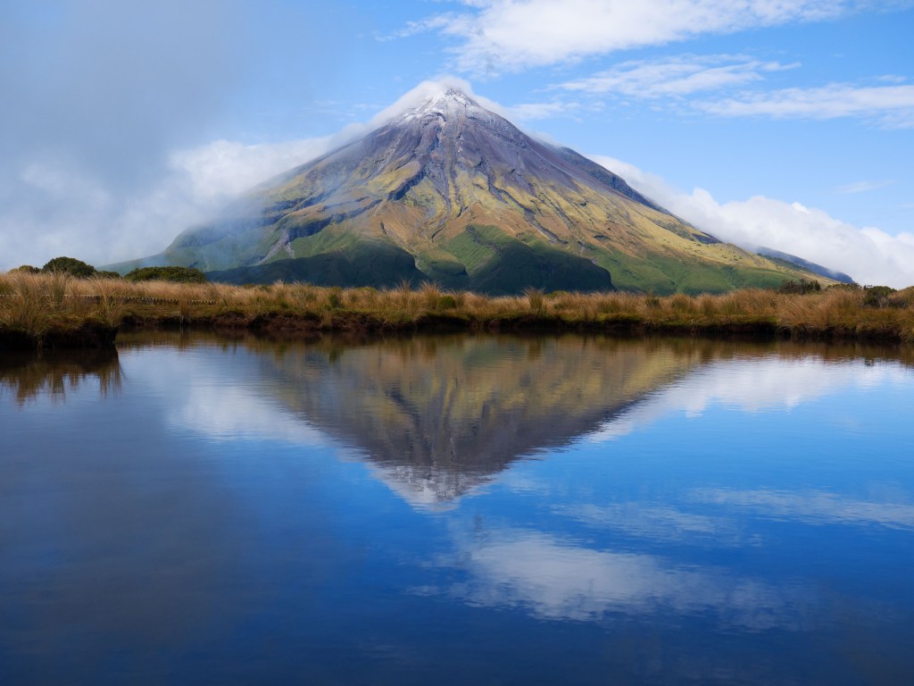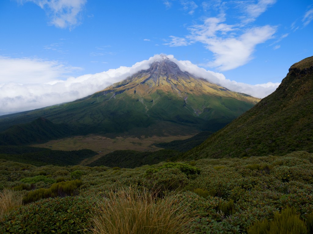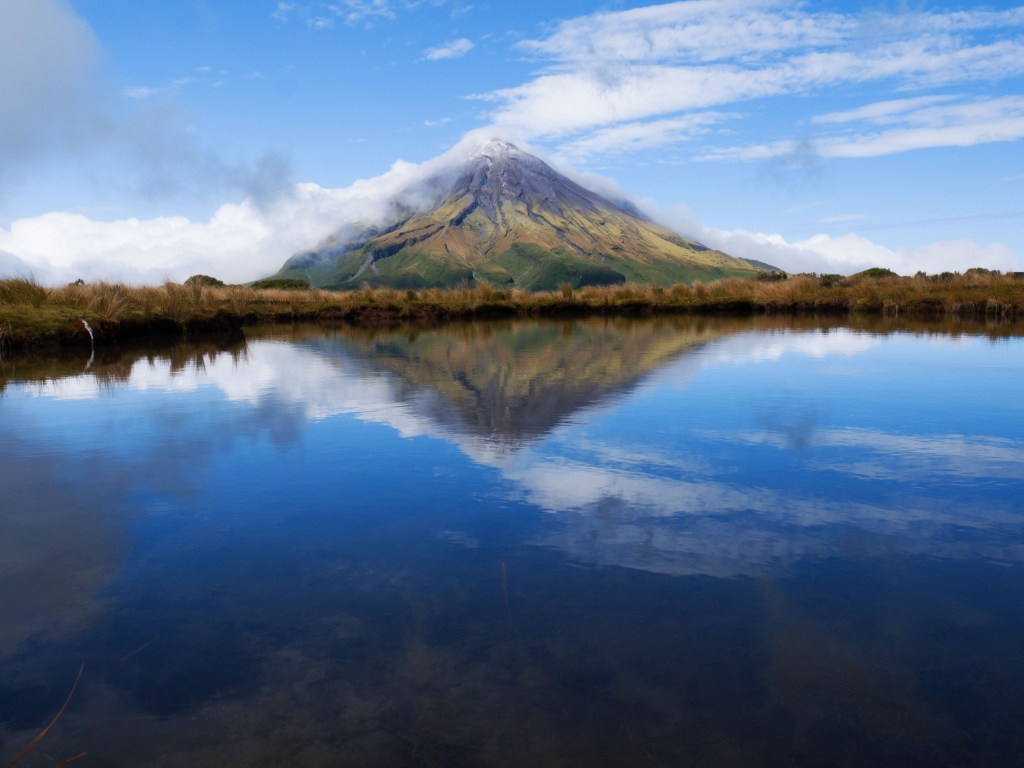 Après notre petit interlude, nous arrivons à Stratford où nous passerons deux nuits. Le lendemain matin nous entamons une marche de 13 km allez-retour afin de nous rendre jusqu’à un lac situé dans le parc national Egmont. Enfin soyons honnête un étang plutôt. Nous espérons y voir le reflet du volcan Taranaki. Bien entendu il ne s’agit pas du meilleur jour pour prendre ce genre de photo car il y a passablement de vent ainsi que des nuages qui cachent le volcan par intermittence.