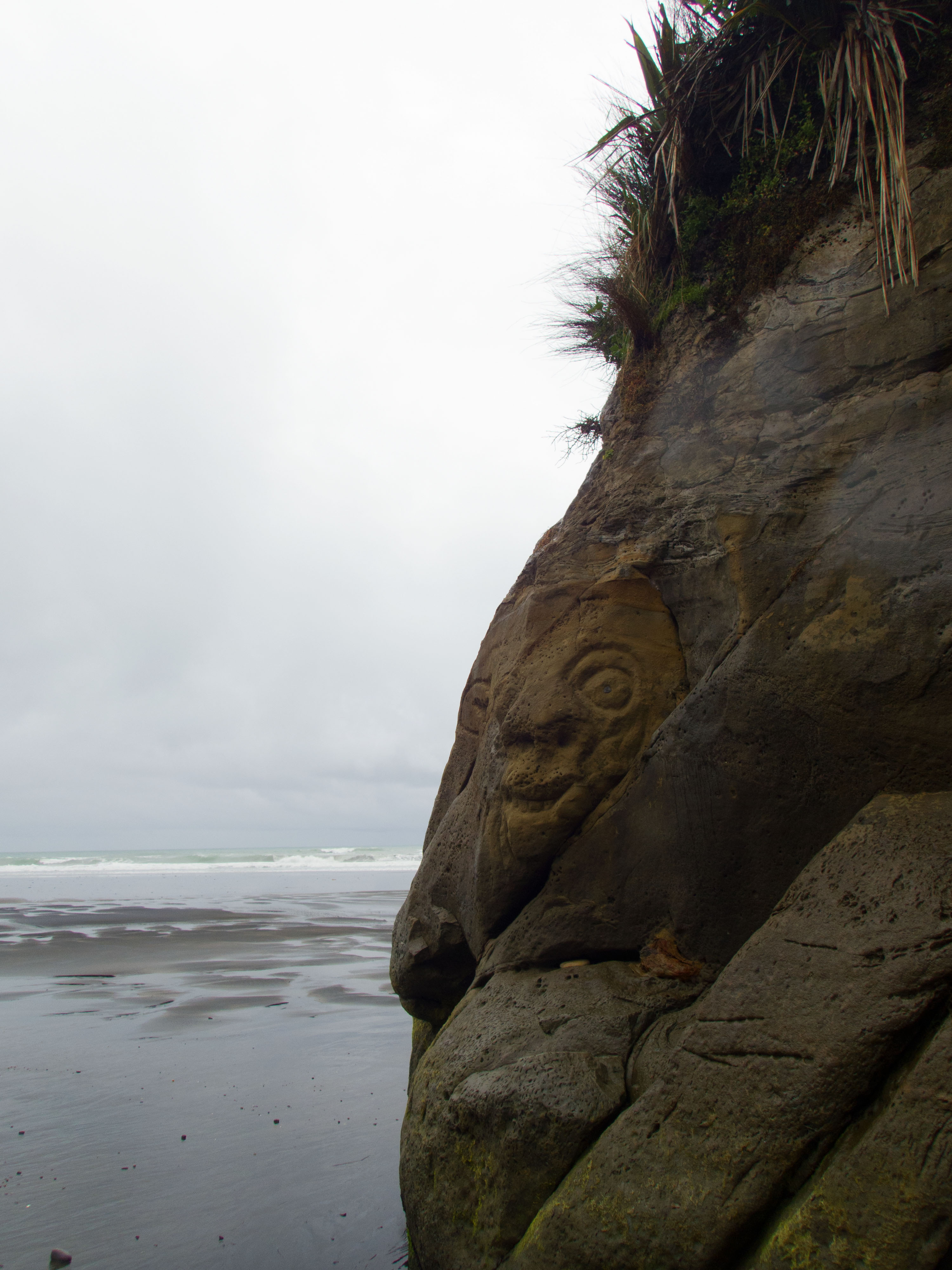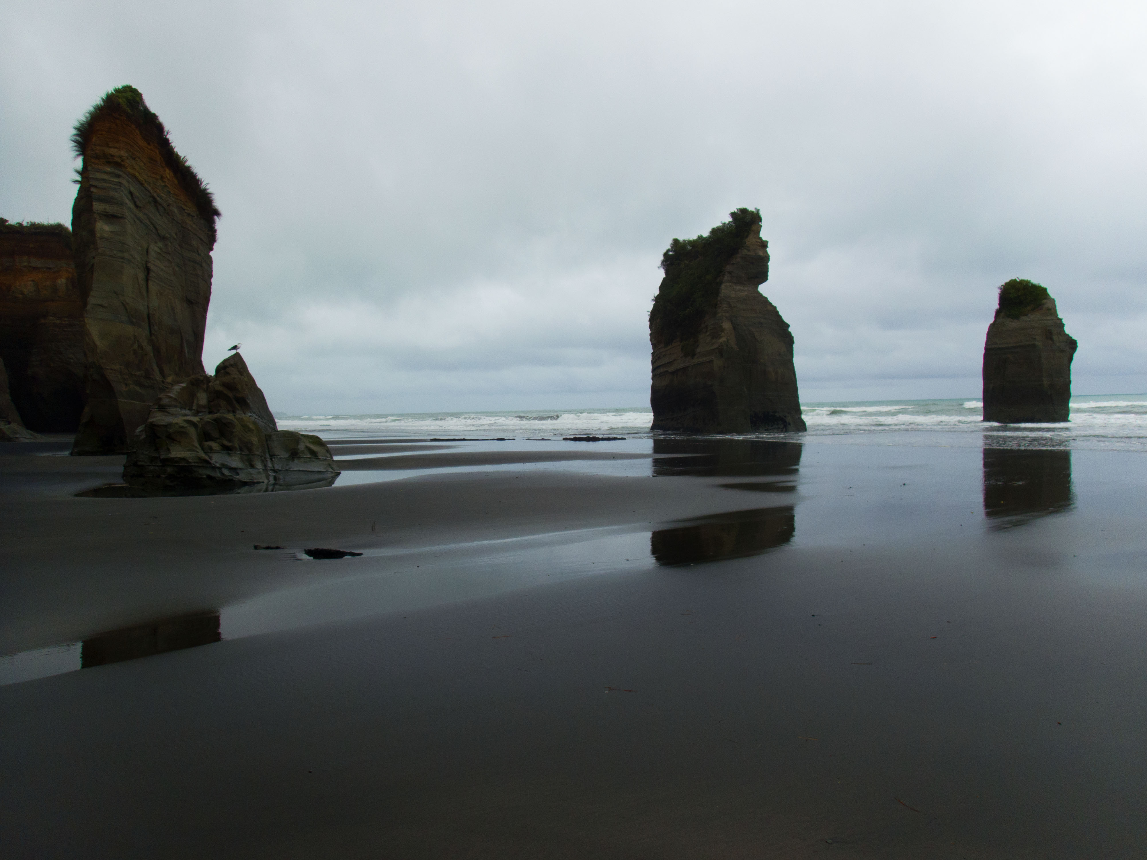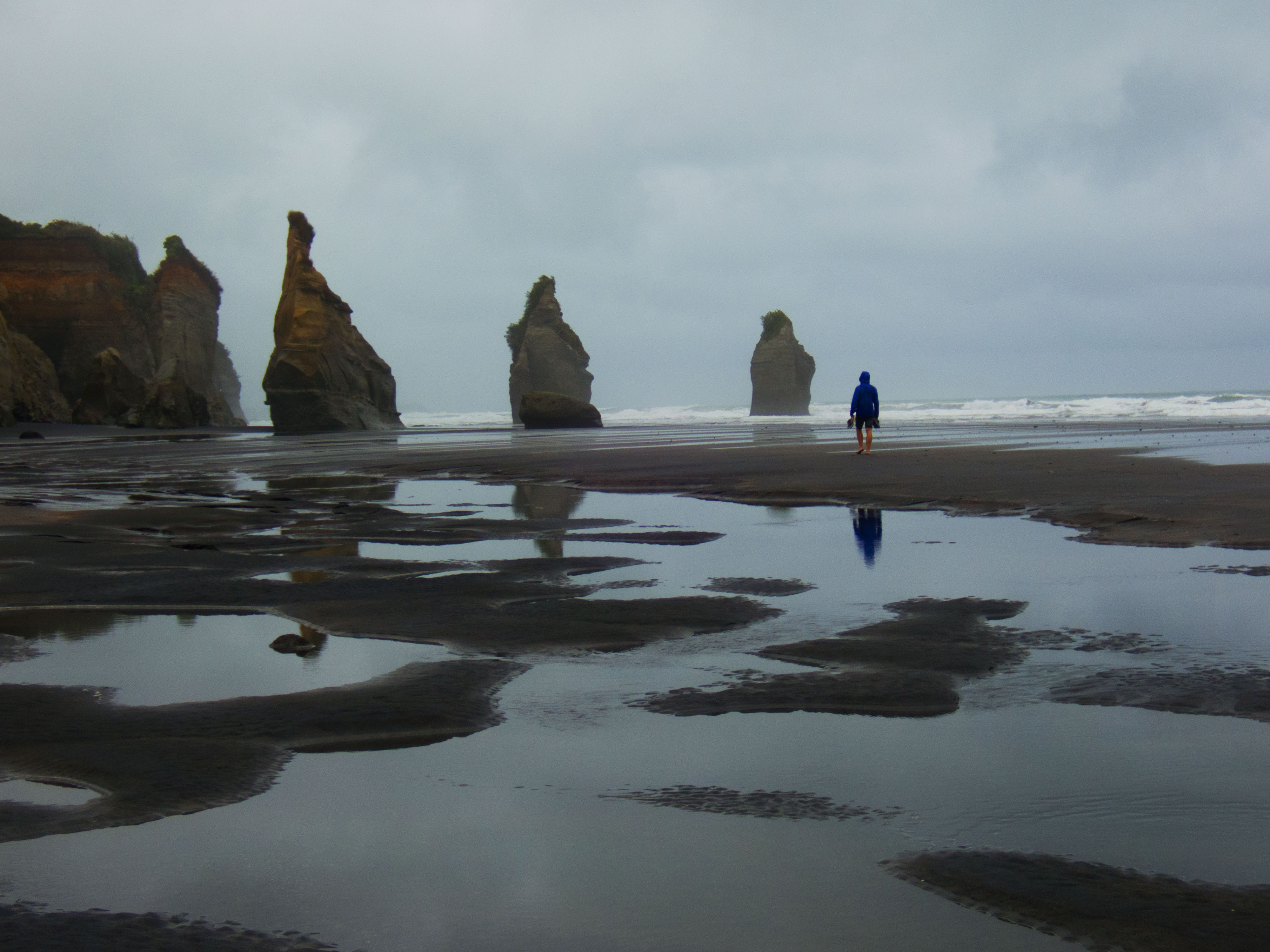 Depuis Matamata une longue route nous attend pour rejoindre Taranaki. Sur la route, nous voyons un panneau indiquant « The three sisters », nous décidons donc de nous y arrêter. Apparemment nous pouvons y accéder seulement durant marée basse, mais heureusement pour nous la marée basse est prévu dans deux heures. Nous nous mouillons un peu les pieds mais bon c’est pas grave le décor est splendide.