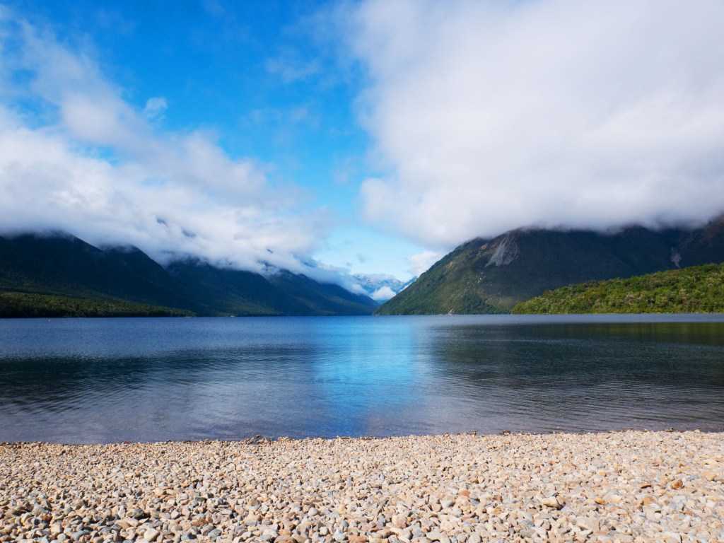 Aujourd’hui nous nous rendons sur la côte ouest. Sur la route se trouve le lac Rotoiti, nous en profitons donc pour y admirer la vue avant de nous rendre à notre camping à Punakaiki.