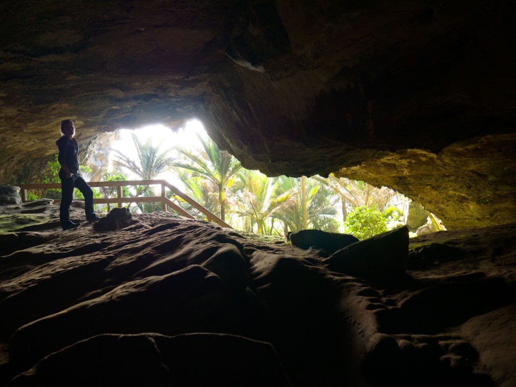 Arrivés à notre camping, nous nous installons et marchons pour nous rendre aux fameux Pancakes Rocks. Sur le chemin, se trouve une cave que nous explorons à peine car n’étant pas prévue au programme nous n’avions pas de lampe frontale avec nous pour aller plus loin.
