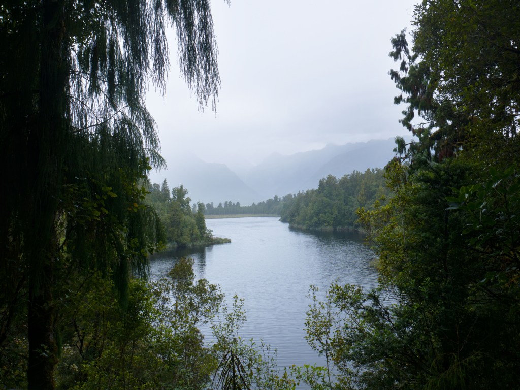Lendemain matin, nous quittons Hokitika pour nous rendre à Fox Glacier. Avant d’aller à notre Backpacker nous faisons une halte au lac Matheson qui offre une jolie vue sur le mont Cook.