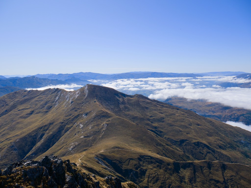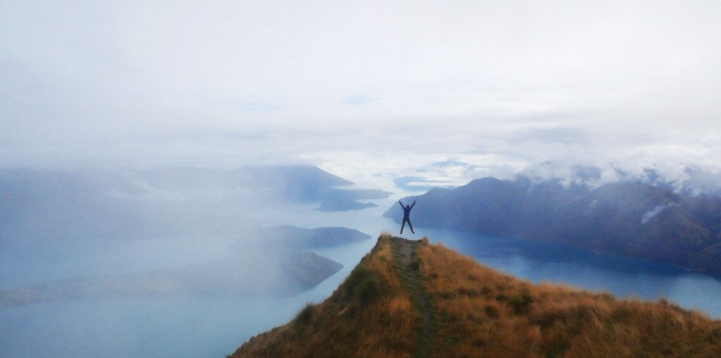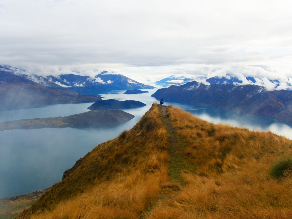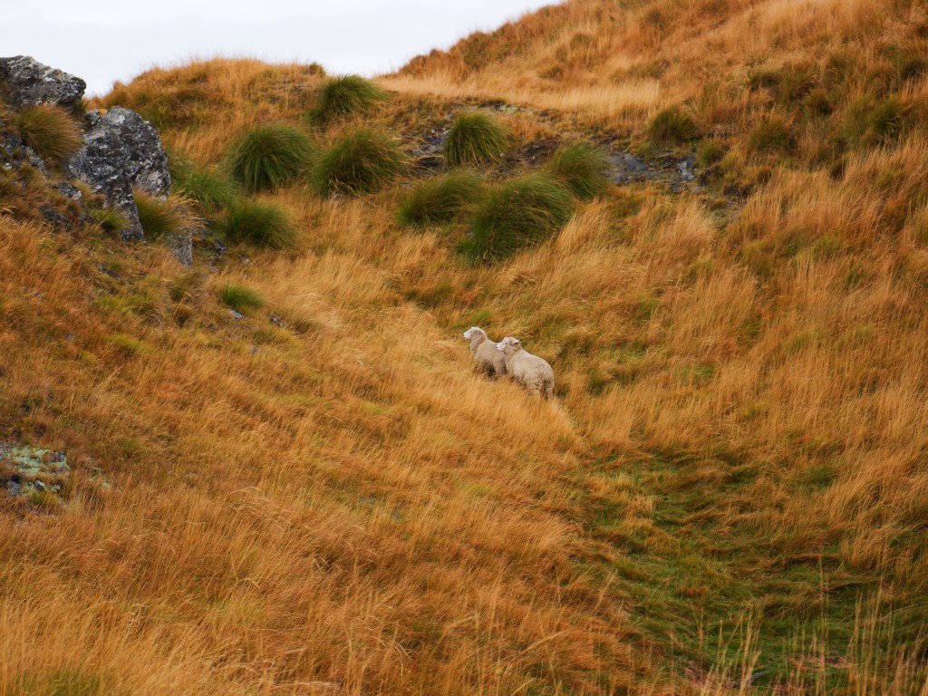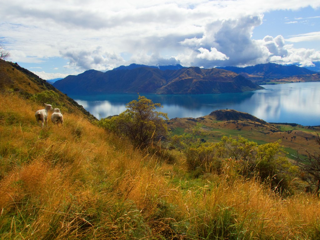 Les 45 premières minutes de marches se font sur le même sentier qui mène au Roy’s Peak. Arrivés à une table de pique-nique, il est temps de quitter le chemin et d’escalader la montagne à travers les hautes herbes et les moutons. Oui, il n’y a absolument aucun chemin pour s’y rendre. Après une heure de marche vraiment intensive et semée d’embûches, nous arrivons enfin au sommet ! La vue est juste incroyable et, le must, nous sommes seuls 🙂