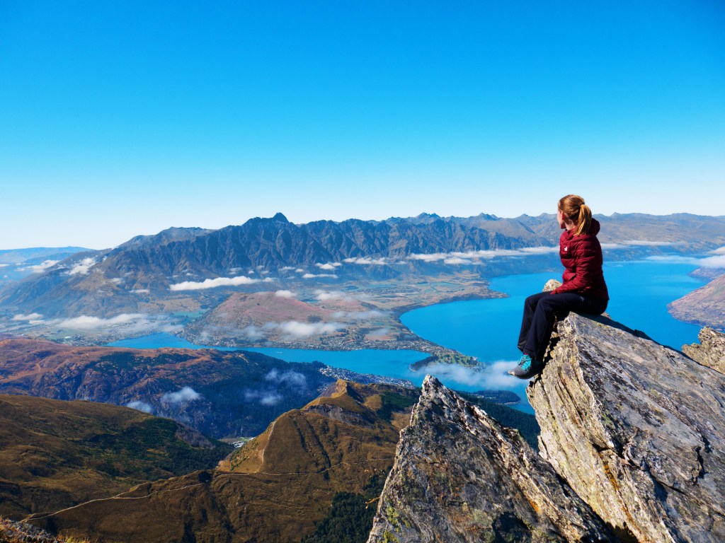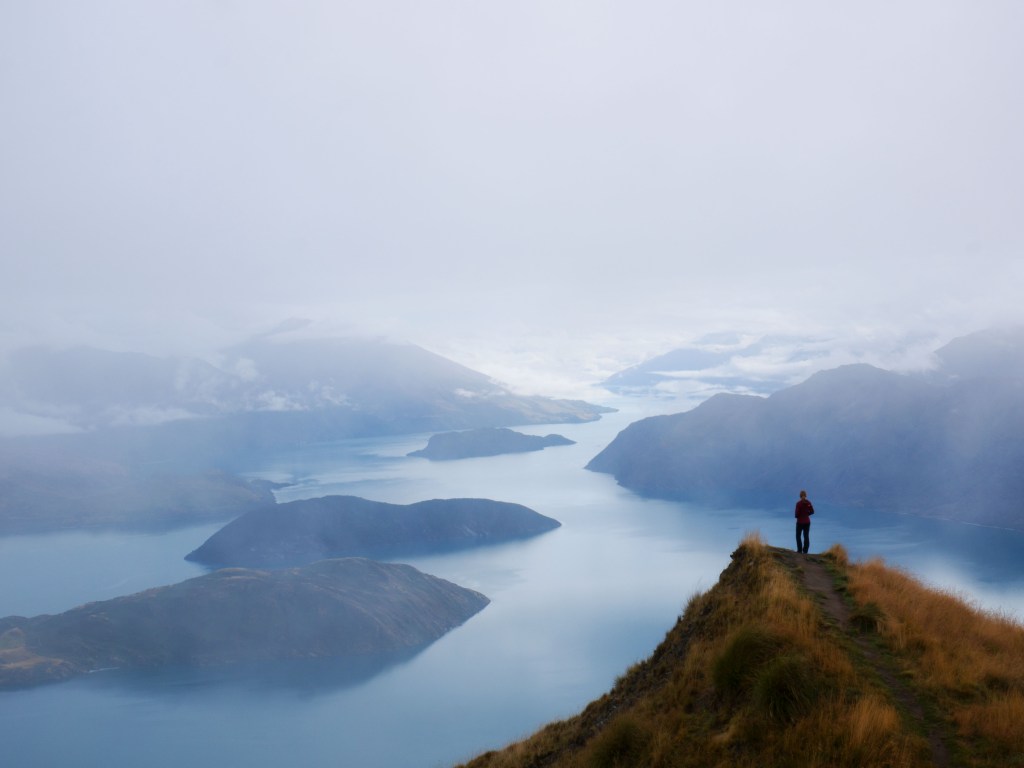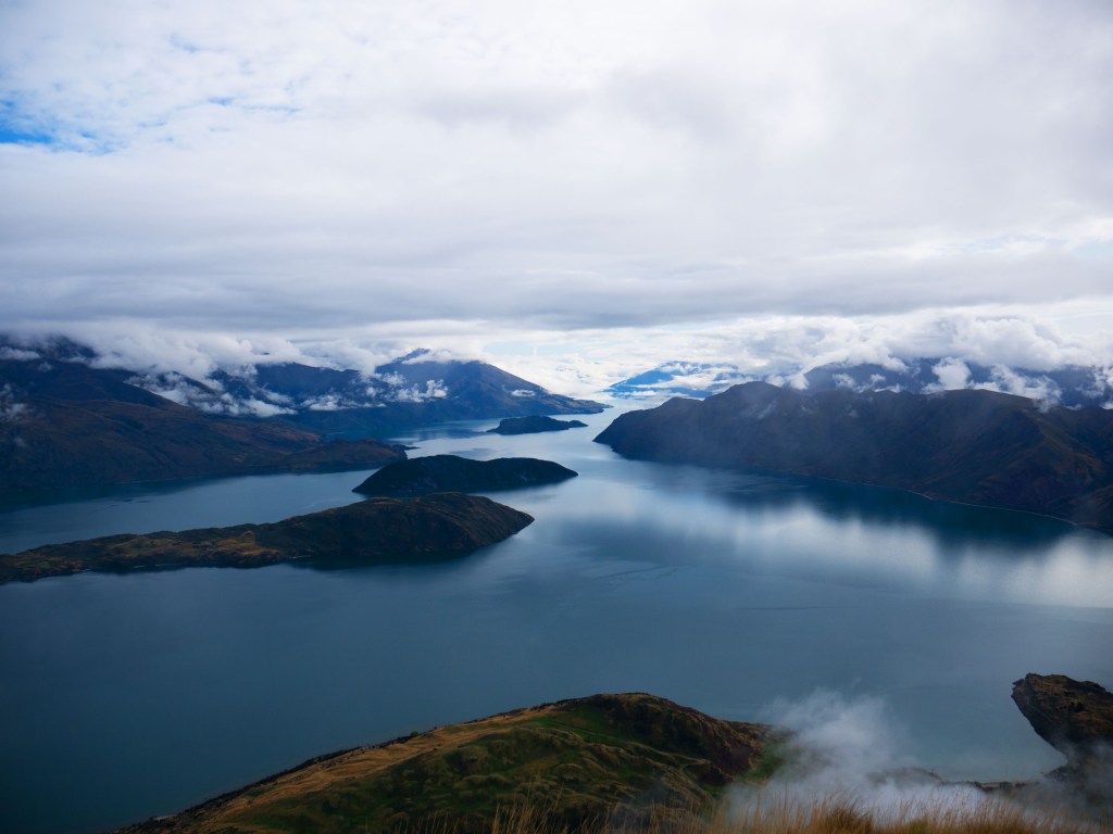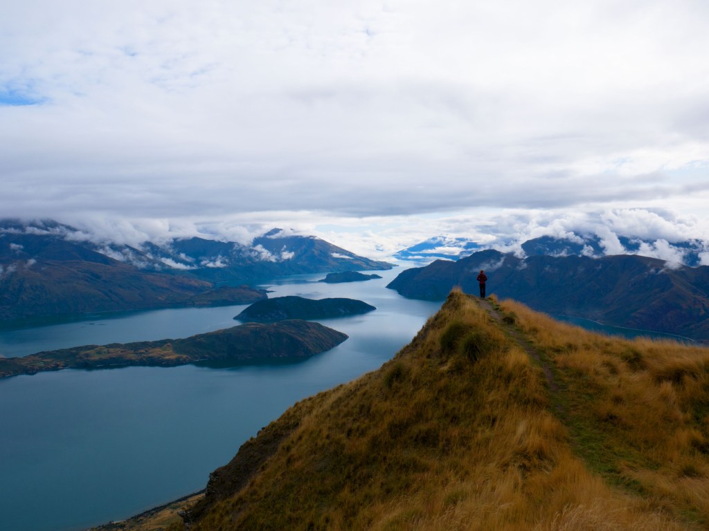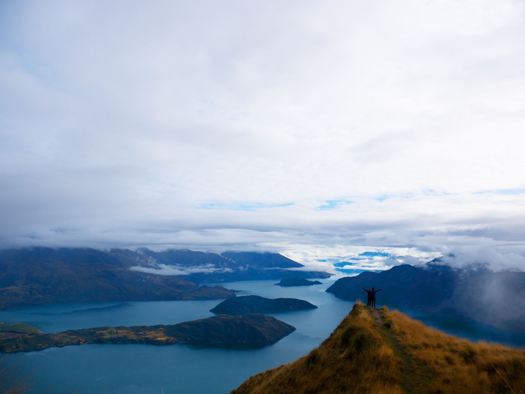 Les 45 premières minutes de marches se font sur le même sentier qui mène au Roy’s Peak. Arrivés à une table de pique-nique, il est temps de quitter le chemin et d’escalader la montagne à travers les hautes herbes et les moutons. Oui, il n’y a absolument aucun chemin pour s’y rendre. Après une heure de marche vraiment intensive et semée d’embûches, nous arrivons enfin au sommet ! La vue est juste incroyable et, le must, nous sommes seuls 🙂