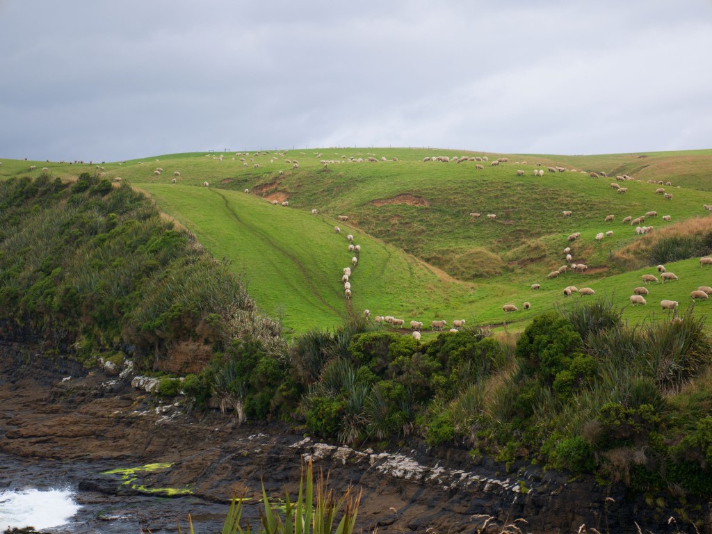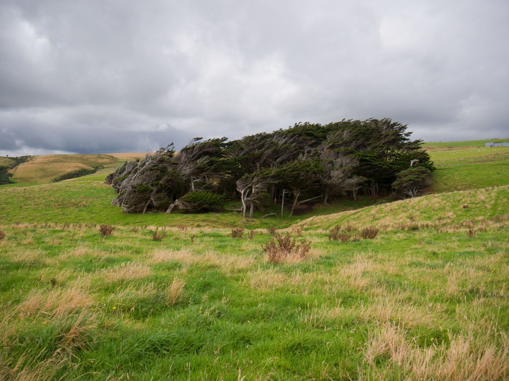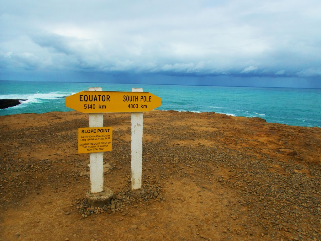 Nous nous rendons ensuite à Slope Point (point le plus au sud de l’île de Sud de Nouvelle-Zélande) où l’on peut voir des arbres qui ont subi un « brushing » et où nous avons une vue imprenable sur la côte.