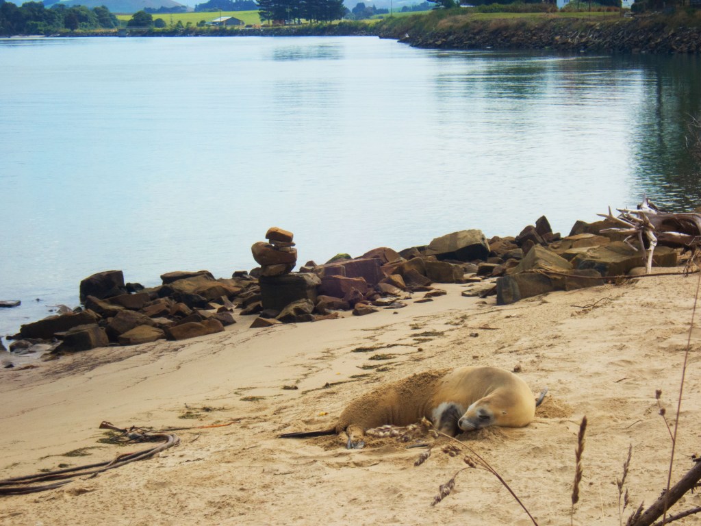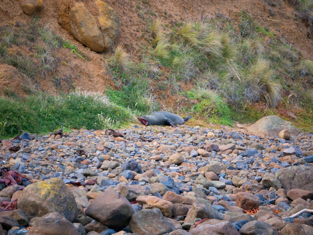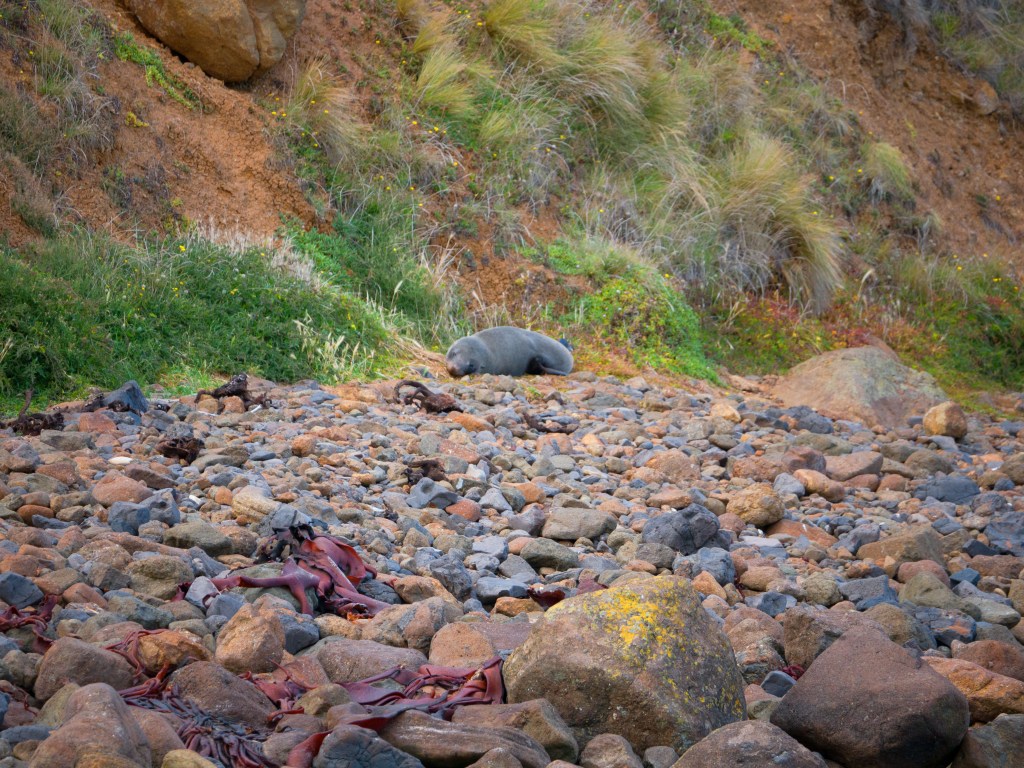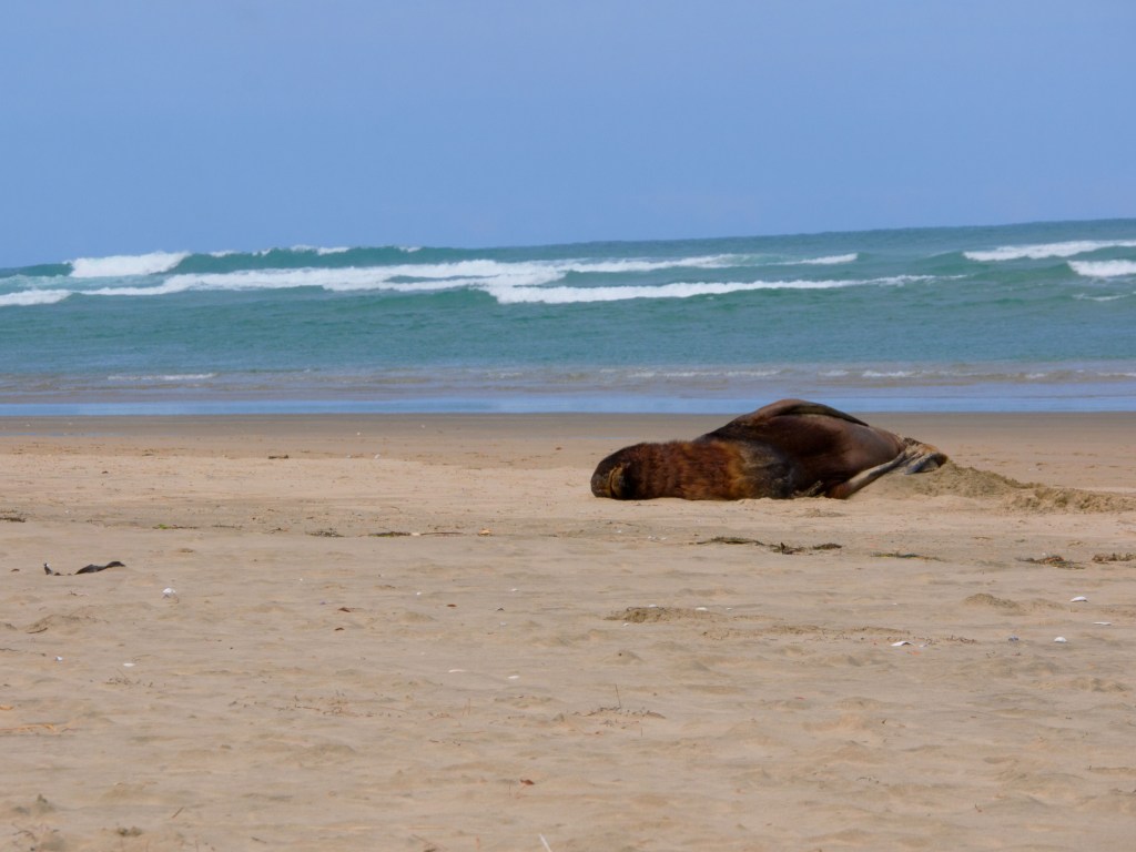 Il est déjà midi du coup nous nous arrêtons à Okawa pour manger. Non loin de là se trouve Surat Bay où nous pouvons voir des lions de mer se prélasser sur la plage. Du coup nous faisons un petit détour pour nous y rendre. Nous commençons à peine à marcher que nous croisons notre premier lions de mer ! Attention au moins 10m de distance (quand ils dorment) ou plus si nécessaire.