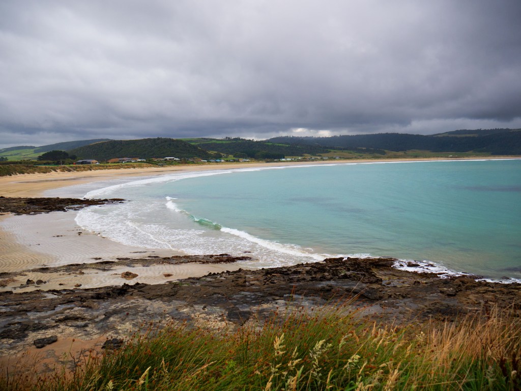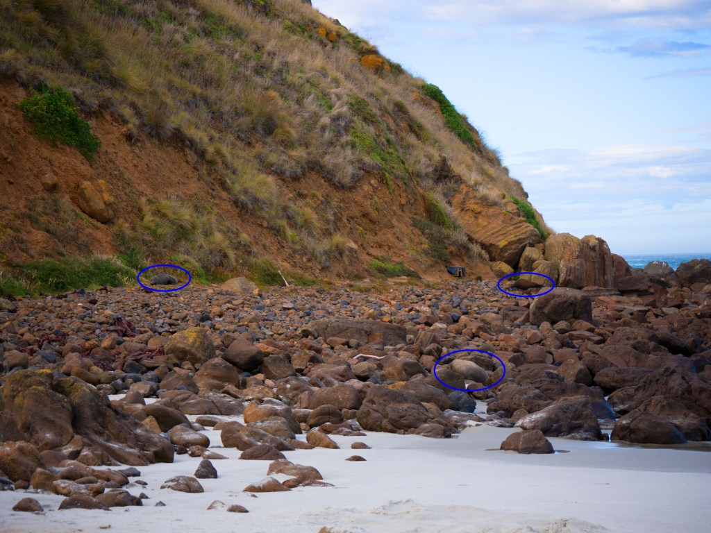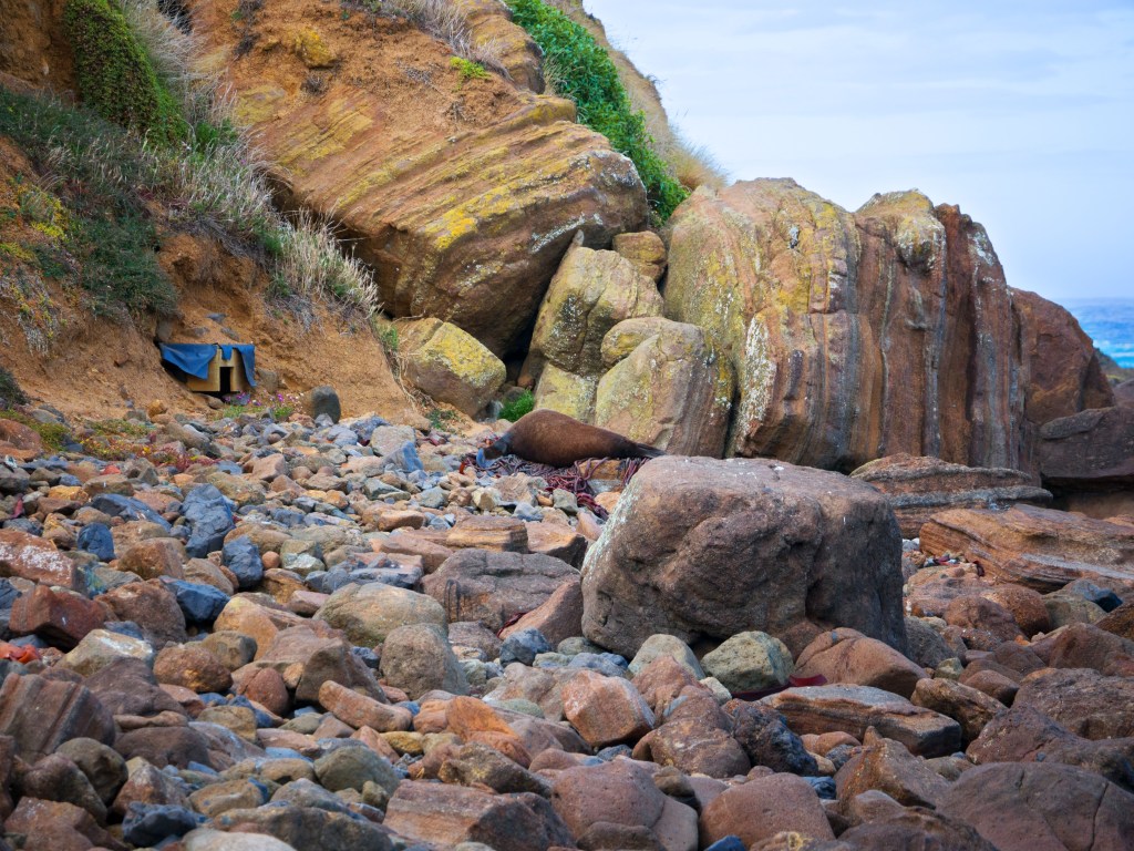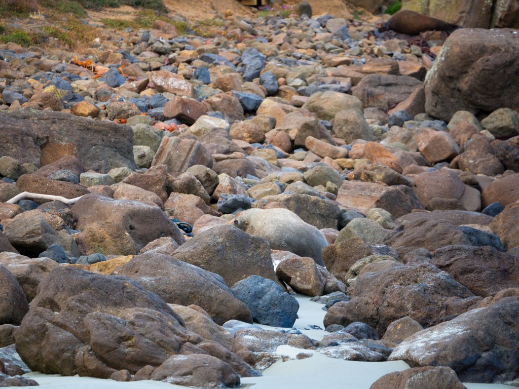 Il est déjà midi du coup nous nous arrêtons à Okawa pour manger. Non loin de là se trouve Surat Bay où nous pouvons voir des lions de mer se prélasser sur la plage. Du coup nous faisons un petit détour pour nous y rendre. Nous commençons à peine à marcher que nous croisons notre premier lions de mer ! Attention au moins 10m de distance (quand ils dorment) ou plus si nécessaire.