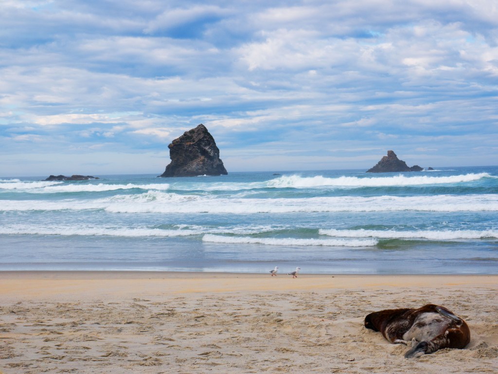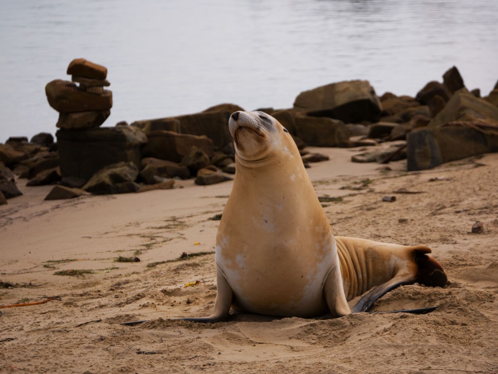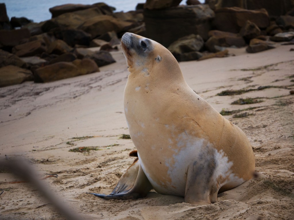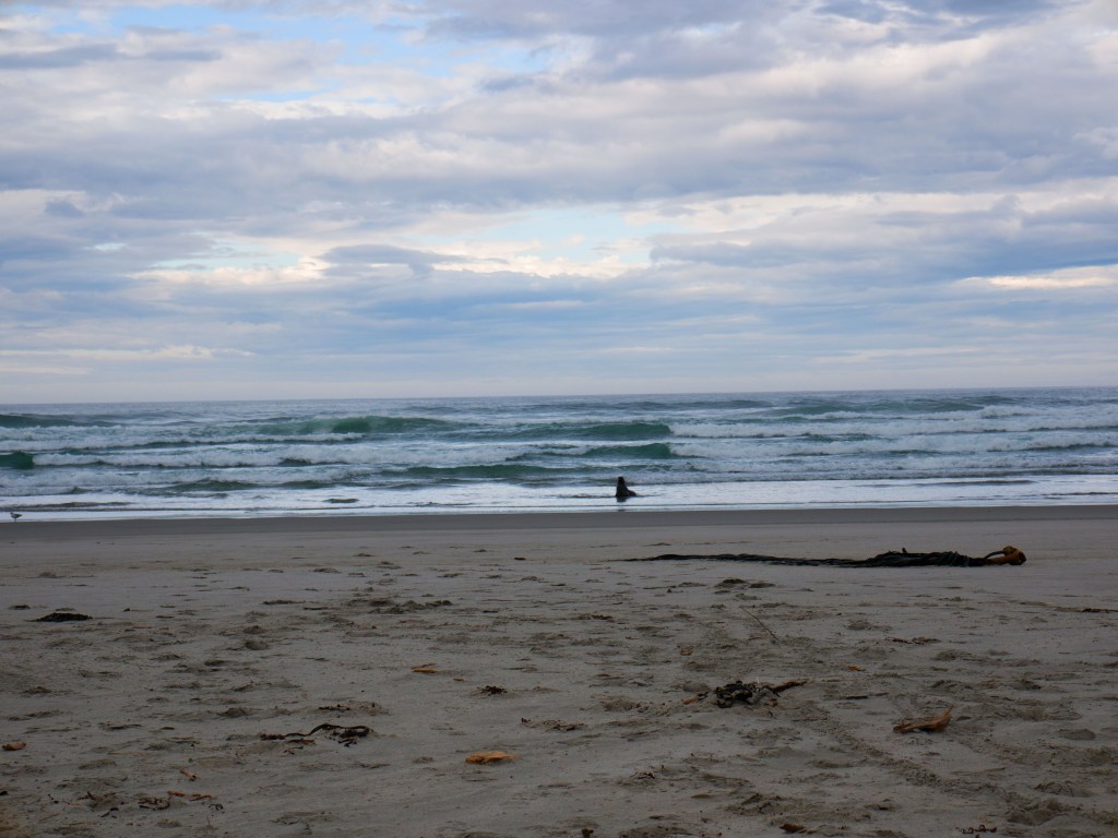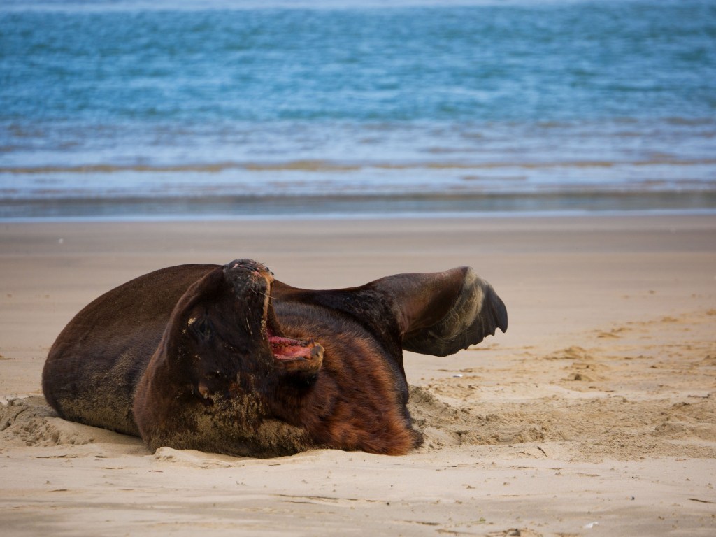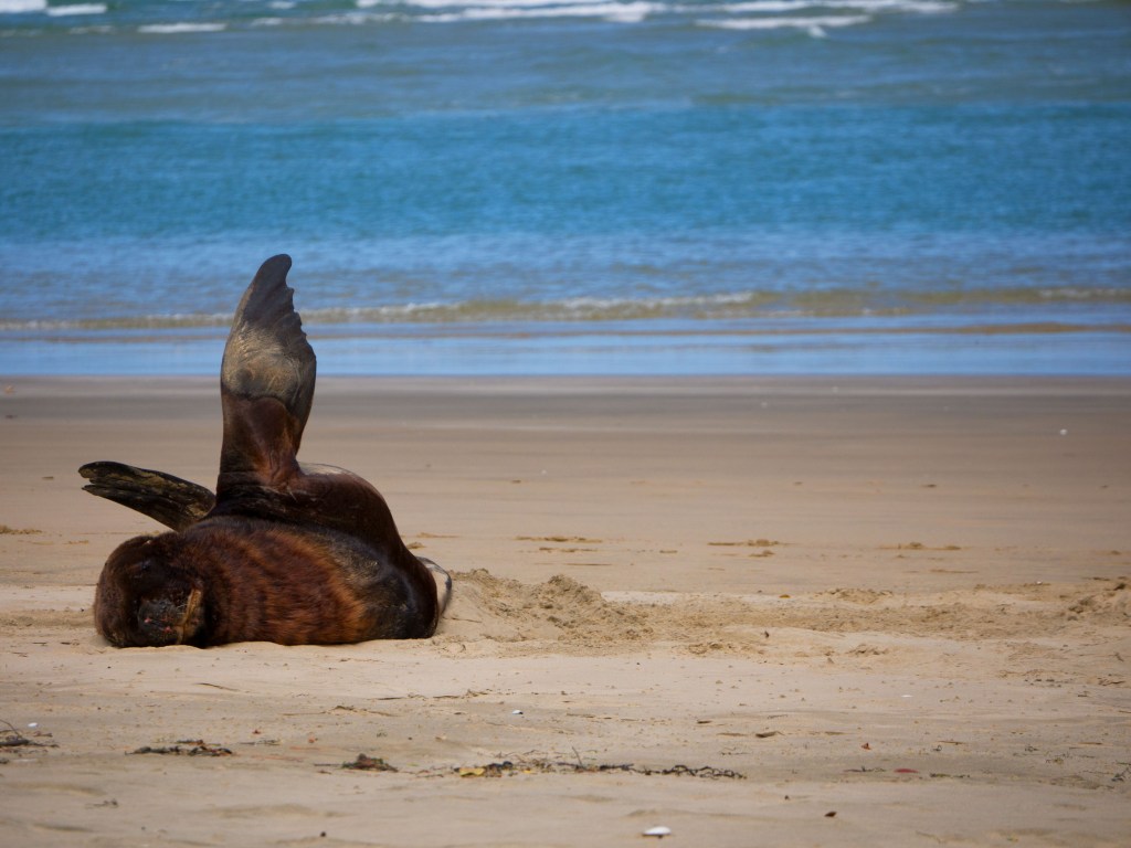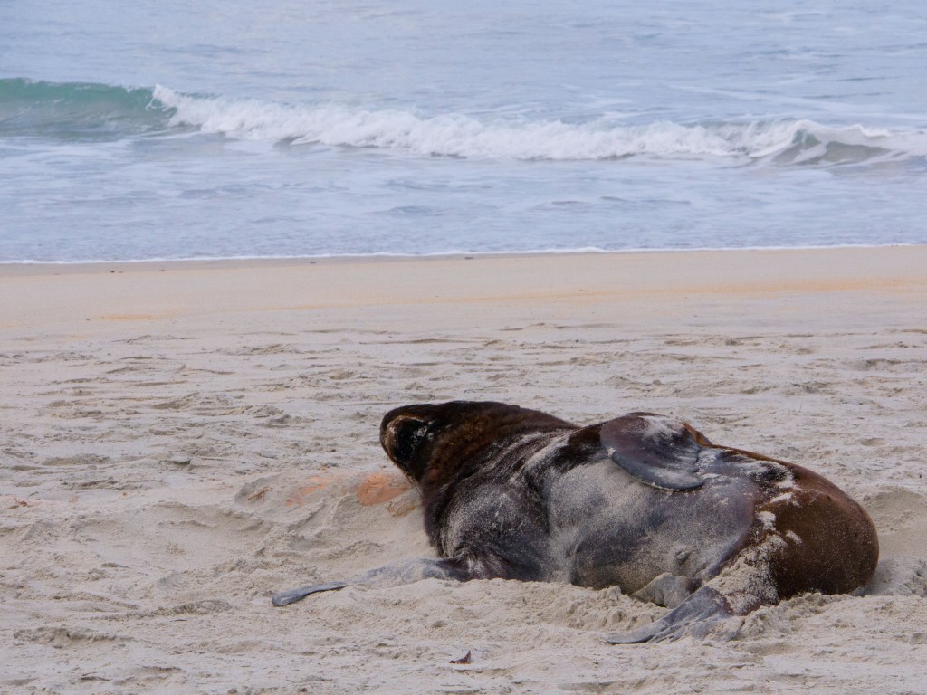 Nous continuons de marcher le long de la plage et voyons un autre lion de mer. Apparemment la vie d’un lion de mer se résume à manger et bronzer. Il n’est pas du tout dérangé par notre présence et se jette de temps à autre du sable sur le corps avec ses nageoires pour se protéger du soleil.