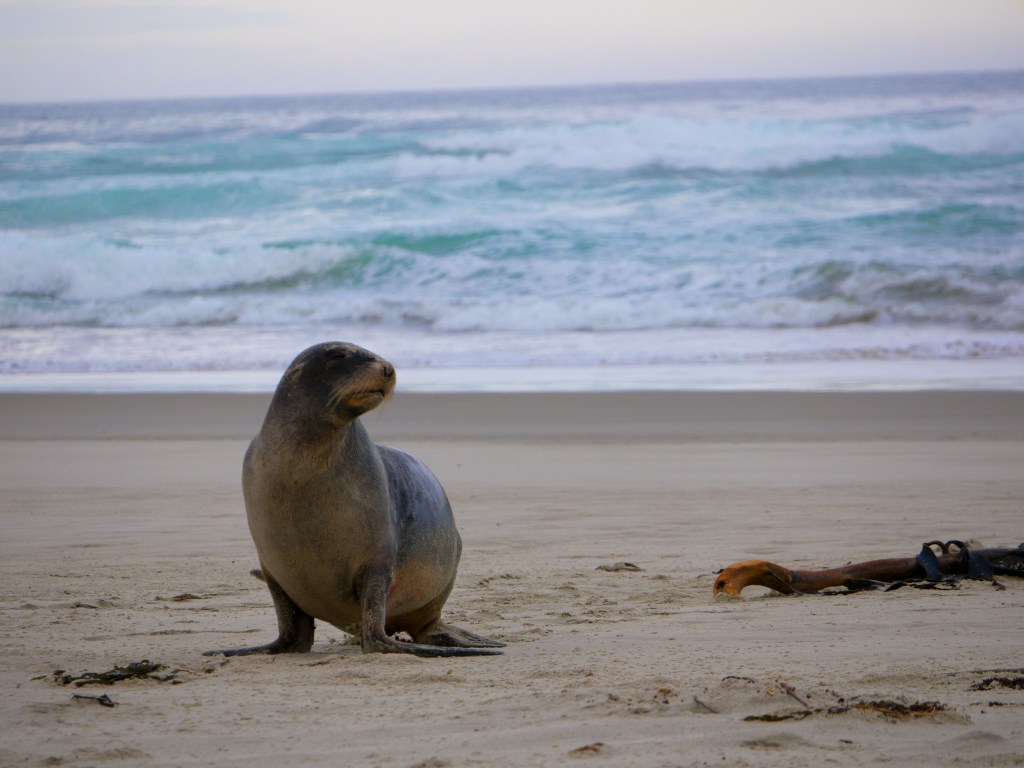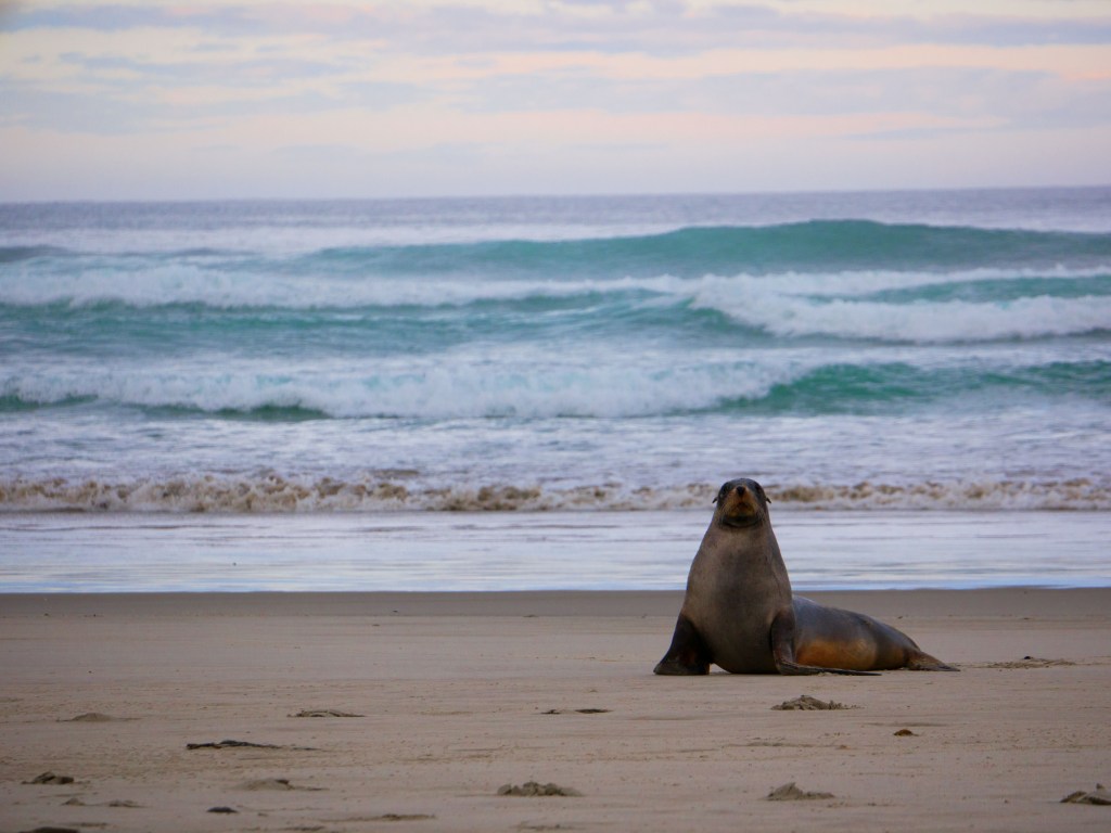 Aujourd’hui nous nous rendons à Sandfly Bay. Une magnifique plage entourée d’immense dunes de sable. Alors que nous arrivons sur la plage nous voyons quelques choses dans l’eau qui « surfe » les vagues. Nous ne savons pas s’il s’agit d’un pingouin ou d’un lion de mer. L’animal sort finalement de l’eau et il s’agit bien d’un lion de mer. Il s’approche de nous et apparemment nous sommes sur son chemin du coup il poursuit Yann. Heureusement s’était surtout pour nous intimider plus que pour nous attaquer.