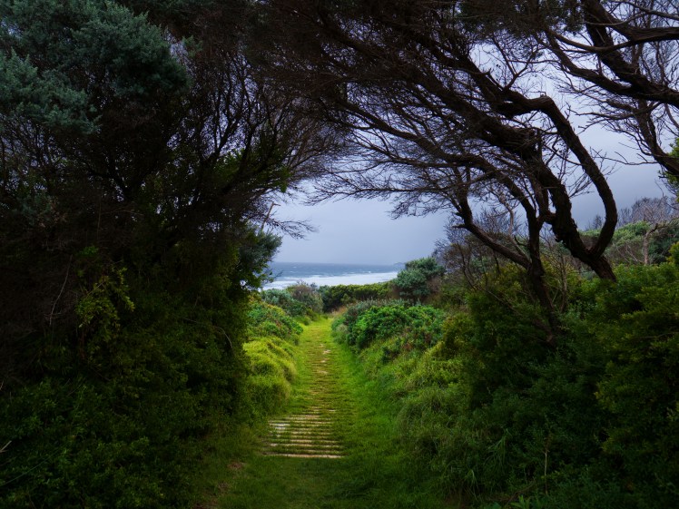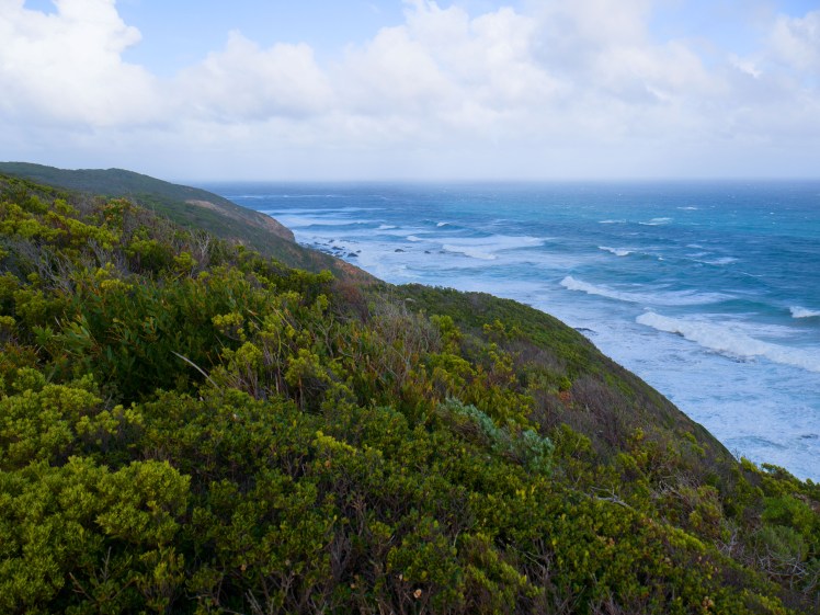 Notre première marche terminée nous nous dirigeons vers le phare du cape Otway. Malheureusement dû au Covid-19 le phare et son parc sont fermés. Nous voyons sur la carte qu’une chute d’eau se trouve à environ 6-7 km de distance. Nous décidons donc d’aller y jeter un œil. Le moins que l’on puisse dire c’est que le paysage est à couper le souffle. Le sentier longe la côte et à chaque contour une vue imprenable s’offre à nous. Par contre quel vent ! On avait même de la peine à prendre nos photos.