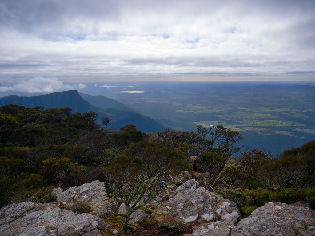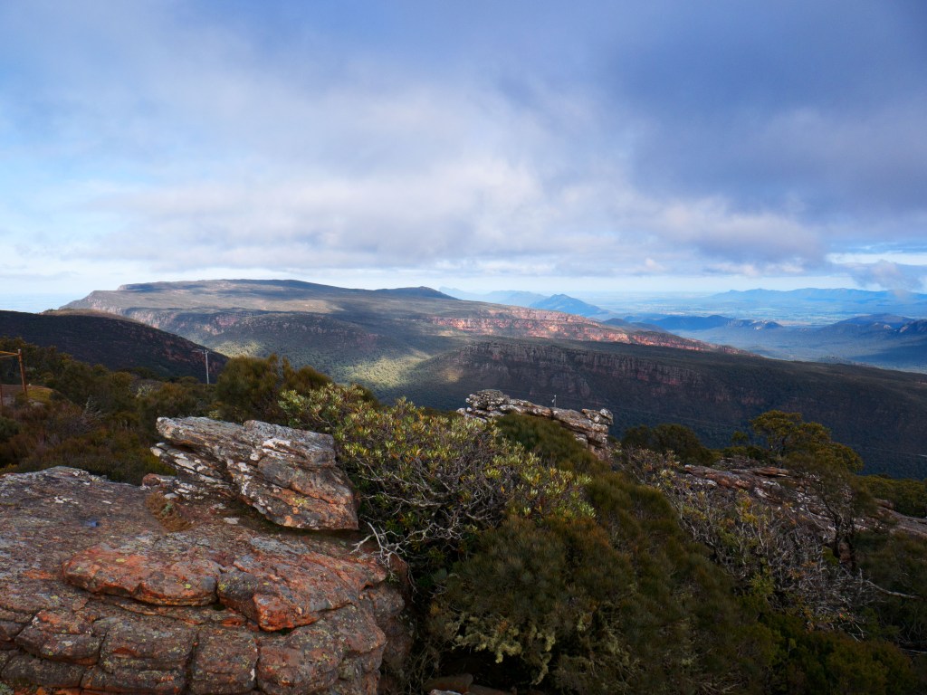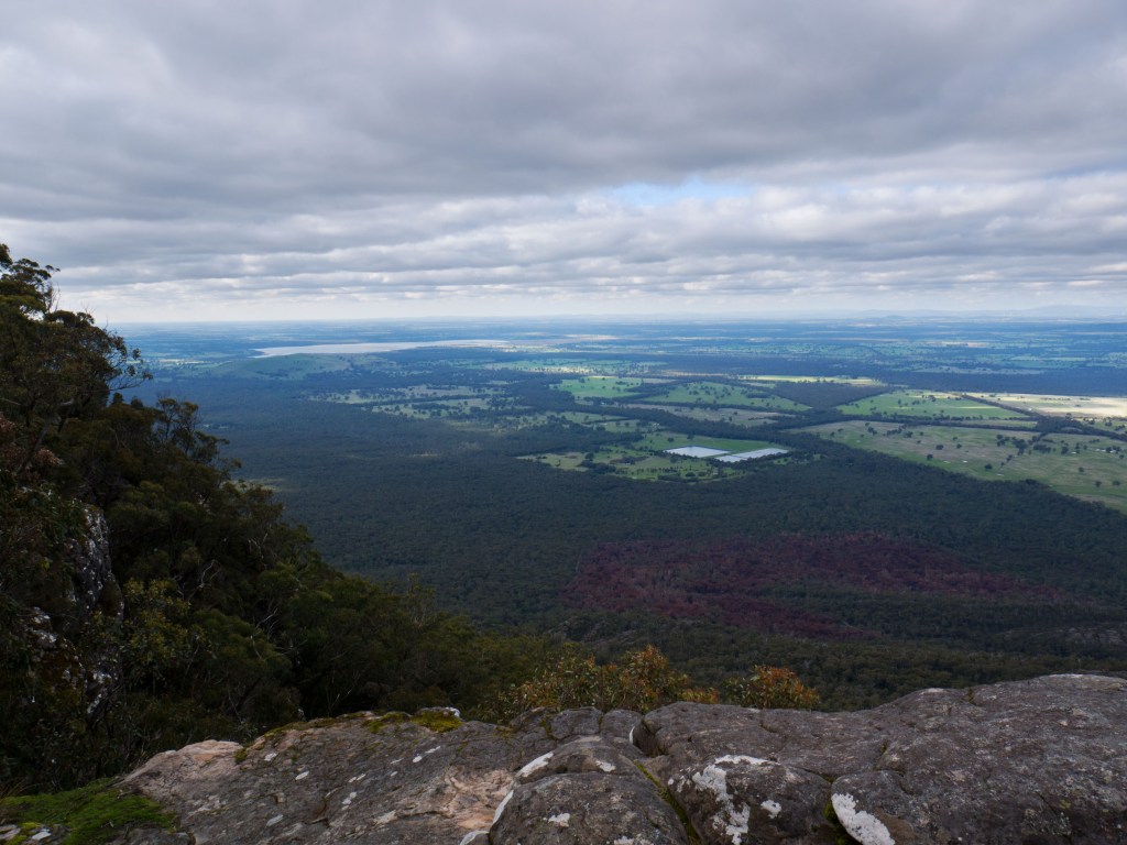 Nous quittons la côte et nous dirigeons vers le parc national de Grampians. Parc montagneux et verdoyant. À peine arrivés nous nous rendons au Sommet du Mt William. Même si la marche n’est pas extraordinaire, car le chemin est goudronné, la vue y est imprenable. D’un côté les montagnes du parc national et de l’autre une plaine interminablement plate qui s’étend à l’horizon.