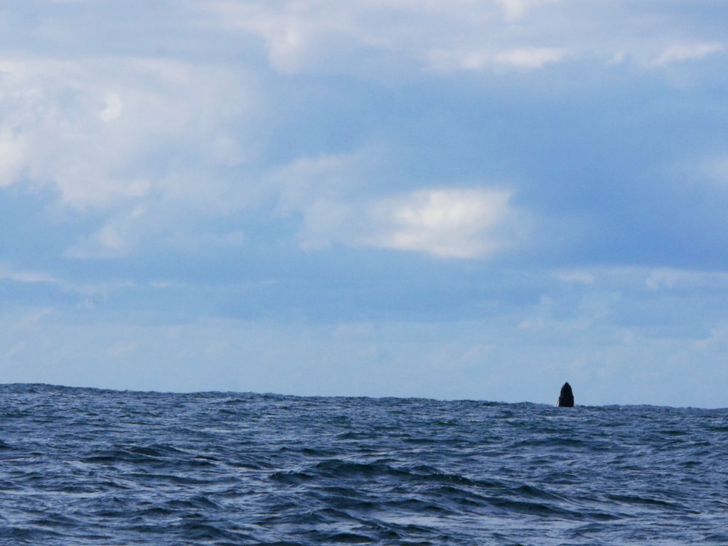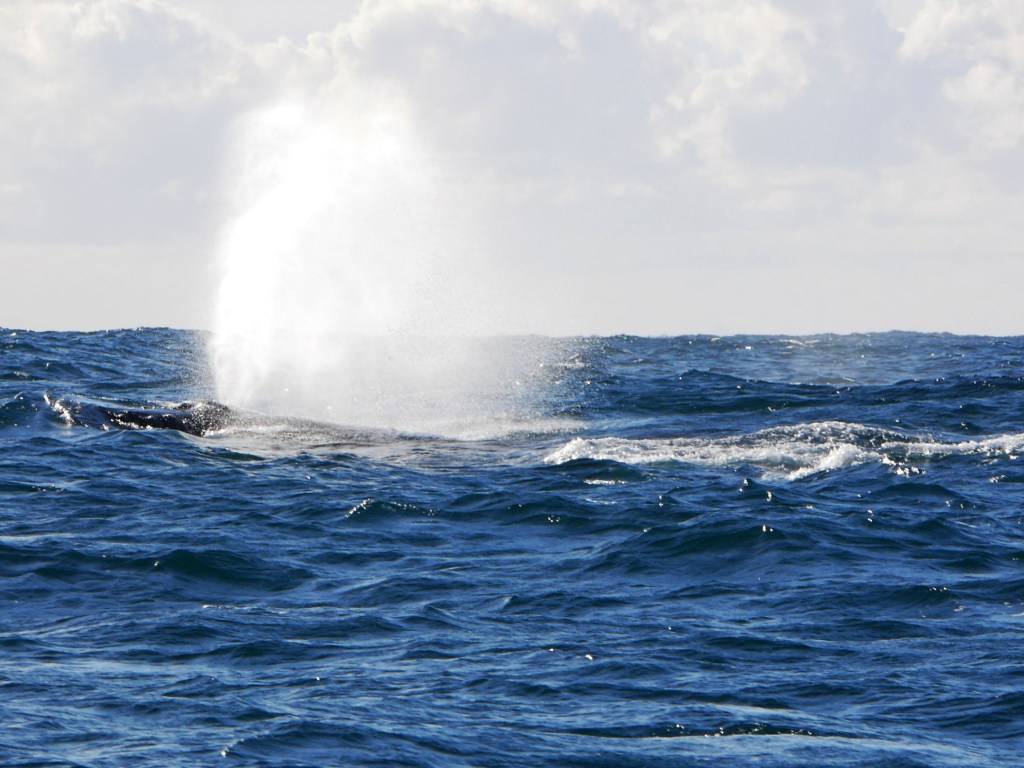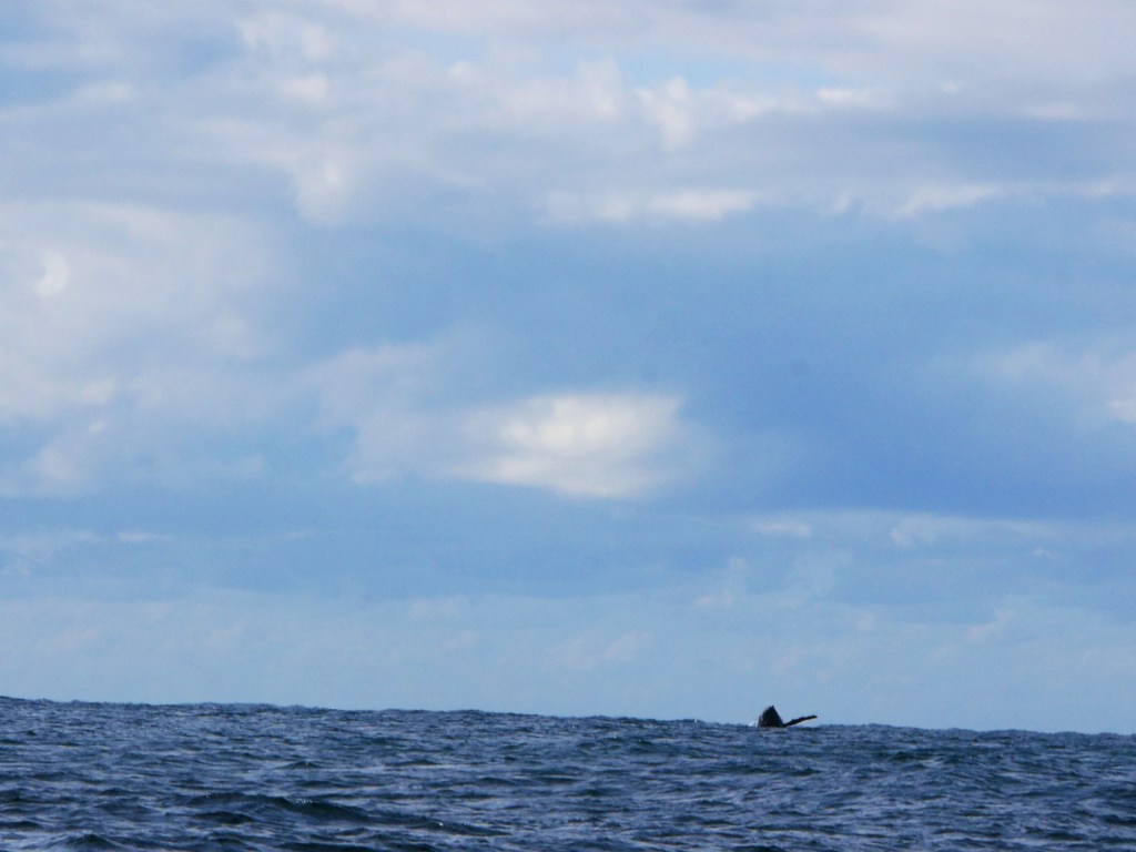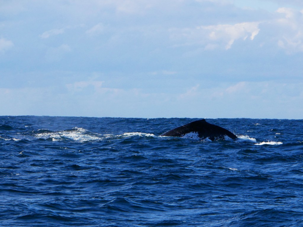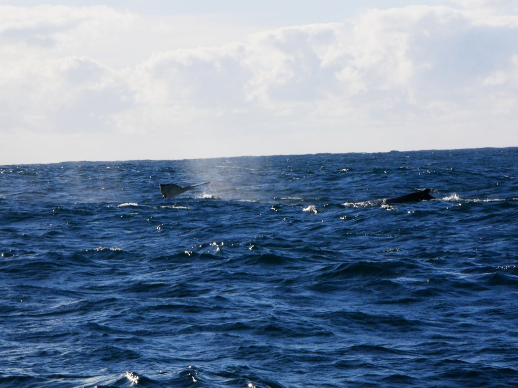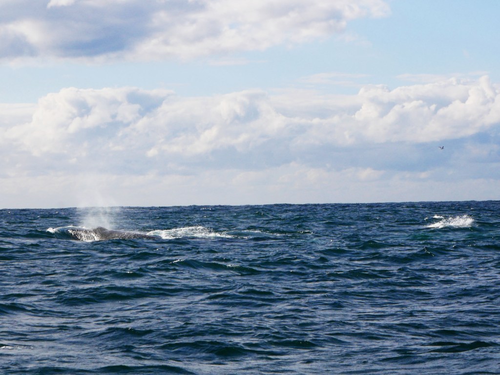 Notre premier après-midi, nous nous contentons de nous ballader un peu en ville. Lendemain matin, nous nous réveillons aux aurores afin d’aller faire une excursion en bateau pour observer la migration des baleines. Seul petit problème aujourd’hui, la houle, qui est d’environ 2-3 mètres par moment, ce qui crée d’énormes vagues à l’entrée du port. En toute franchise on se demande par quel miracle il est possible de traverser les énormes vagues qui déferlent à l’entrée du port. Une seule méthode apparemment, attendre avec le bateau qu’une série de vagues plus petites arrivent, trouver une légère ouverture et foncer. Du coup nous avons eu le droit à des montagnes russes en plus de notre observation. Je ne savais pas que les bateaux pouvaient voler. Une fois le premier obstacle passé, nous voilà au milieu de l’océan pour 2h de repérage de baleines avec une houle à rendre malade n’importe qui. Malheureusement, Natacha ne supportant déjà pas d’être sur une balançoire, je ne vous explique pas l’état dans lequel elle se trouvait 😦