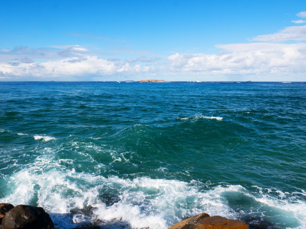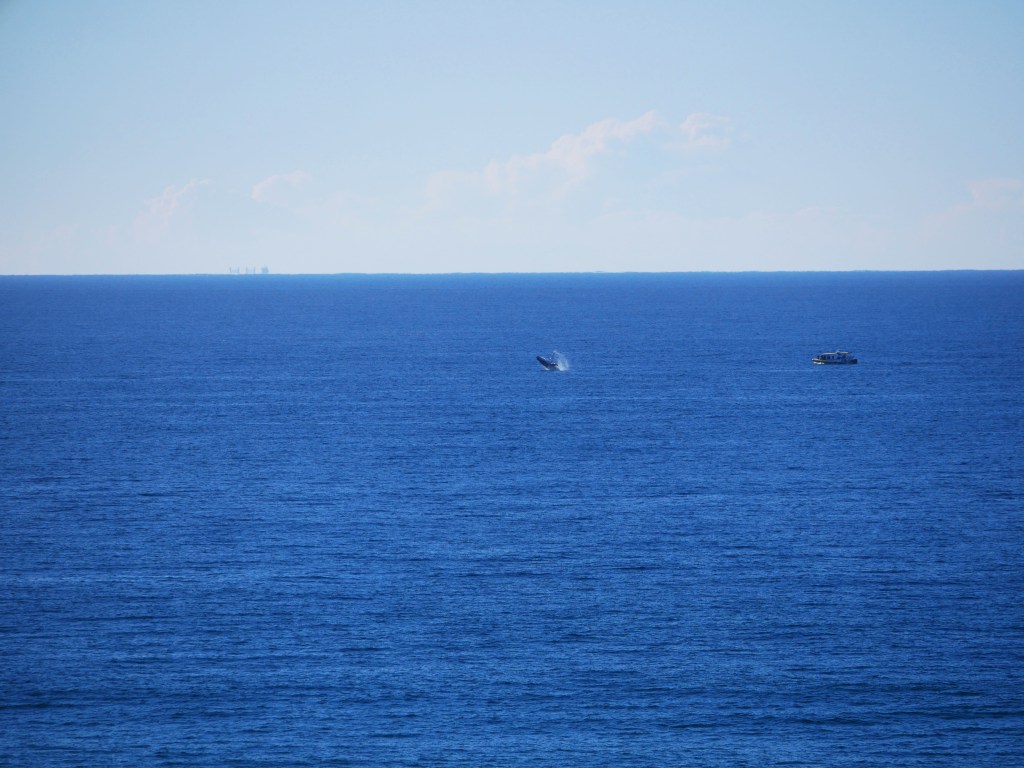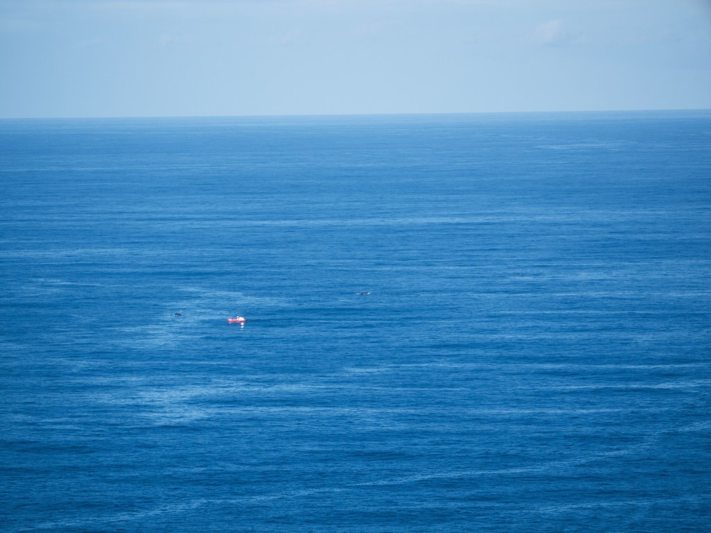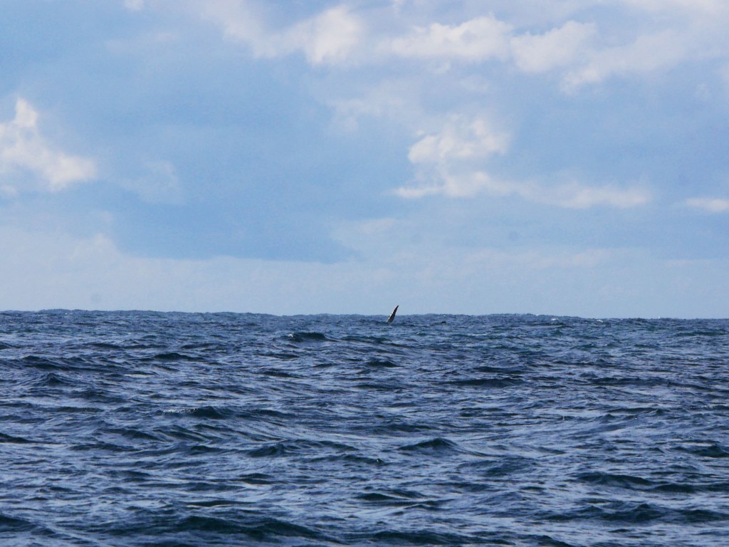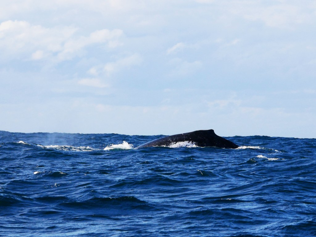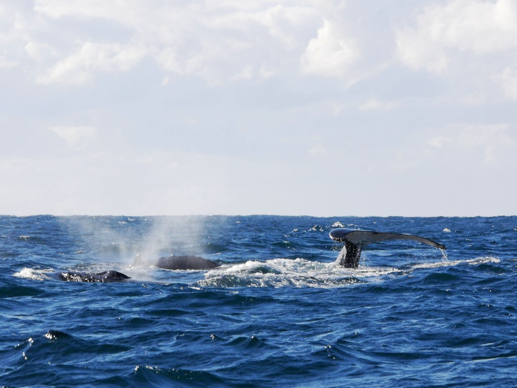 Notre premier après-midi, nous nous contentons de nous ballader un peu en ville. Lendemain matin, nous nous réveillons aux aurores afin d’aller faire une excursion en bateau pour observer la migration des baleines. Seul petit problème aujourd’hui, la houle, qui est d’environ 2-3 mètres par moment, ce qui crée d’énormes vagues à l’entrée du port. En toute franchise on se demande par quel miracle il est possible de traverser les énormes vagues qui déferlent à l’entrée du port. Une seule méthode apparemment, attendre avec le bateau qu’une série de vagues plus petites arrivent, trouver une légère ouverture et foncer. Du coup nous avons eu le droit à des montagnes russes en plus de notre observation. Je ne savais pas que les bateaux pouvaient voler. Une fois le premier obstacle passé, nous voilà au milieu de l’océan pour 2h de repérage de baleines avec une houle à rendre malade n’importe qui. Malheureusement, Natacha ne supportant déjà pas d’être sur une balançoire, je ne vous explique pas l’état dans lequel elle se trouvait 😦