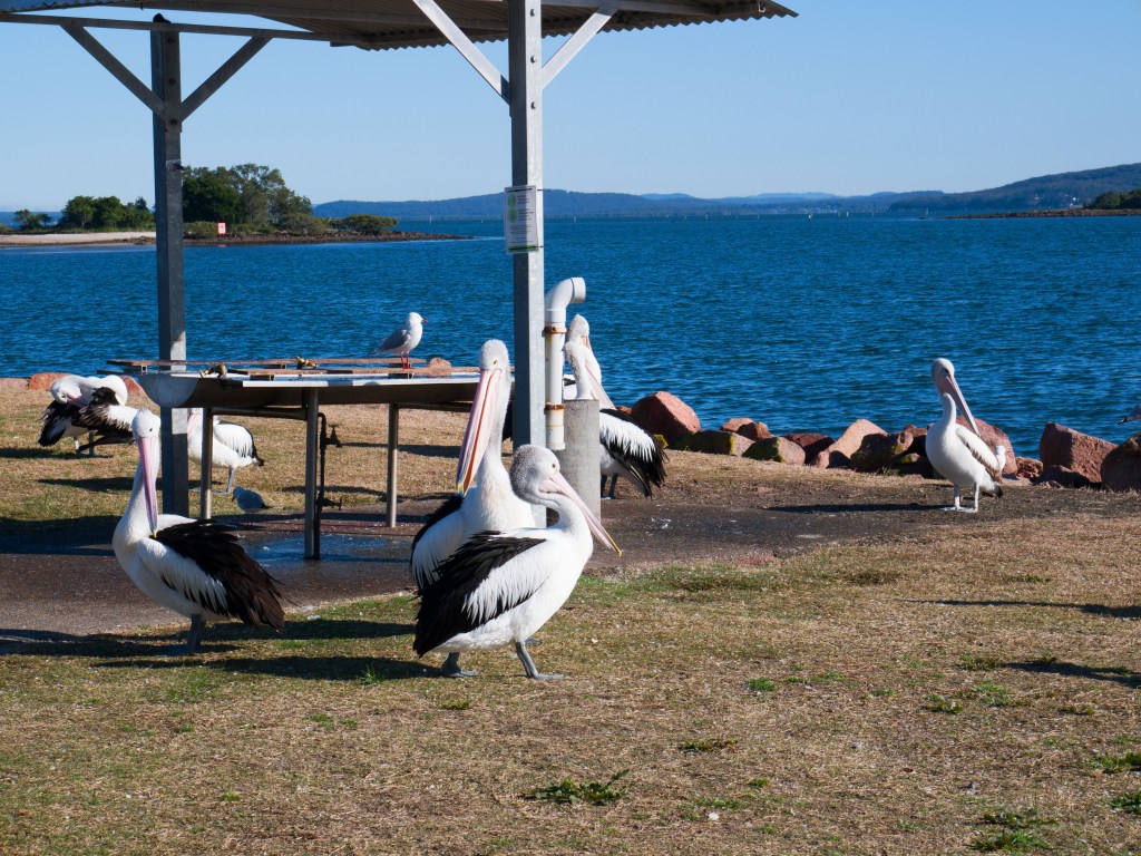 La peninsule de Nelson Bay nous offre d’inombrables points de vue. Tandis que nous nous arrivons au fard, nous apercevons au loin quelques baleines qui remontent à la surface. Nous croisons également des pélicans qui attendent sagement vers les stations de nettoyage du poisson que les pêcheurs rentrent. C’est quand même plus facile que de tenter d’en trouver en mer 😉