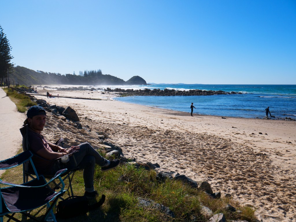 Arrivés à Port Macquarie, nous faisons une petite balade dans la ville où nous pouvons apercevoir de nombreux koalas. Natacha a même pu prendre la pause avec l’un d’entre eux. Déjà l’heure de manger du coup nous nous rendons à une plage pour y préparer le repas. Ensuite pour bien digérer les hamburgers une petite marche le long de la plage nous fait le plus grand bien.