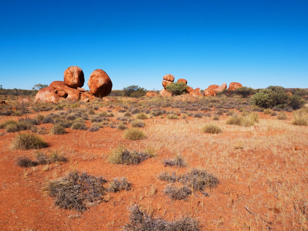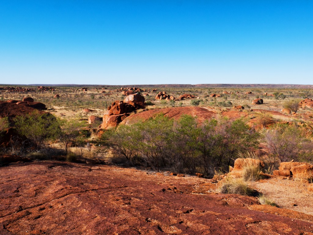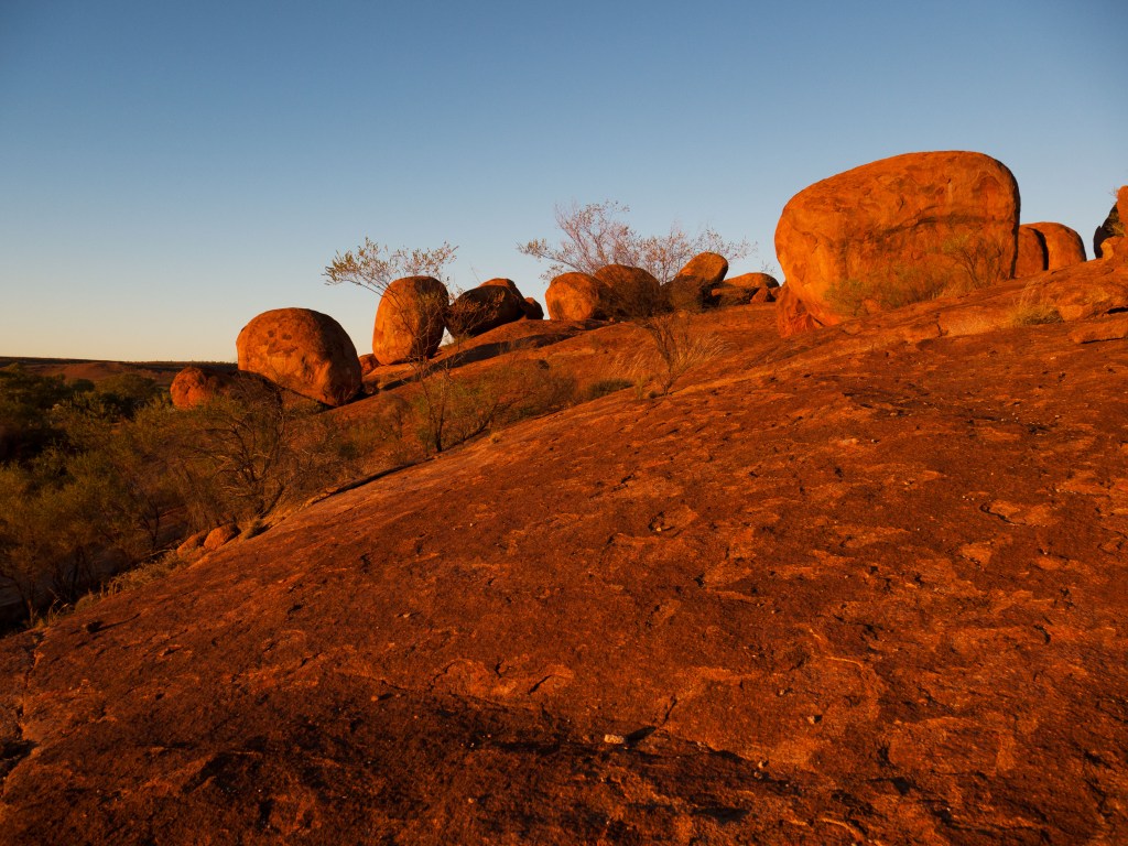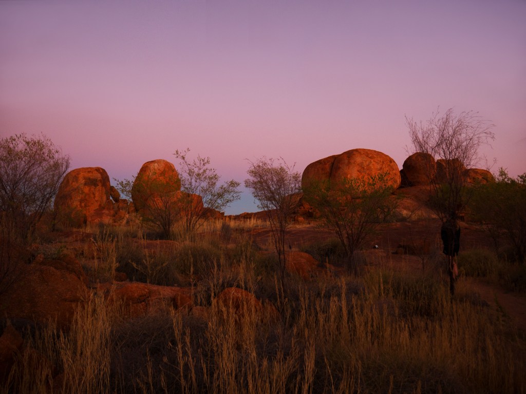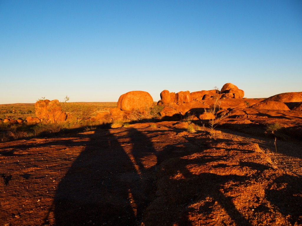 Pause de midi à Barly Homestead et c’est reparti jusqu’aux Devils Marbles, notre lieu de camping pour la nuit. Ce site aborigène offre un paysage très atypique avec ces drôles de rochers de forme sphérique. Plusieurs marches sont marquées et nous décidons d’en faire quelques unes. Le soir nous montons au point de vue pour observer le coucher du soleil et le matin nous réussissons à nous lever juste à temps pour le lever de soleil également. La réflexion des rayons du soleil sur les rochers donne une belle couleur rougeâtre au paysage. Le peuple aborigène pour des raisons culturelles demande de ne pas photographier certaines zones du parc. Nous nous concentrons donc uniquement sur les endroits « autorisés ». Pas beaucoup de personnes par contre jouent le jeu malheureusement. Ma foi. Petite anecdote, ce matin en marchant jusqu’au point de vue, je vois ma première « grosse » araignée… une « petite » Huntsman spider qui fait, selon Yann, la taille de la paume de la main. Personnellement je ne tiens pas à vérifier, le premier coup d’œil m’a suffit et j’ai filé ensuite plus loin…