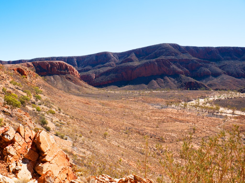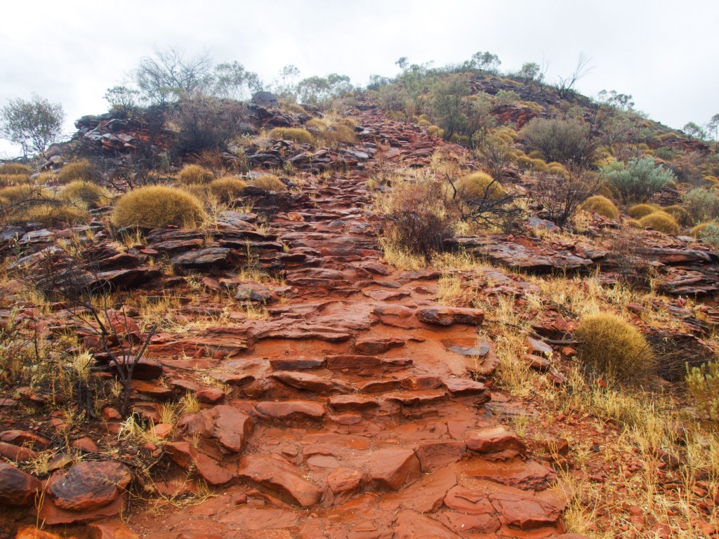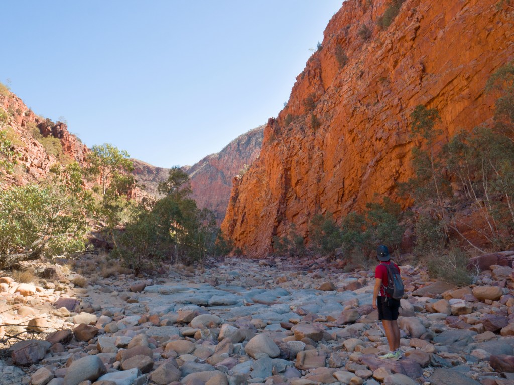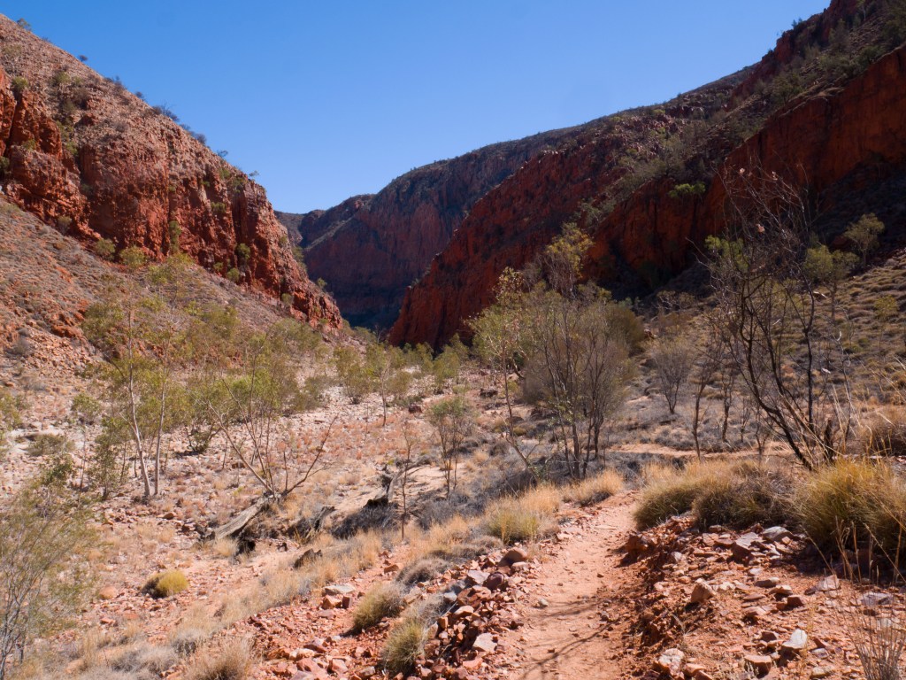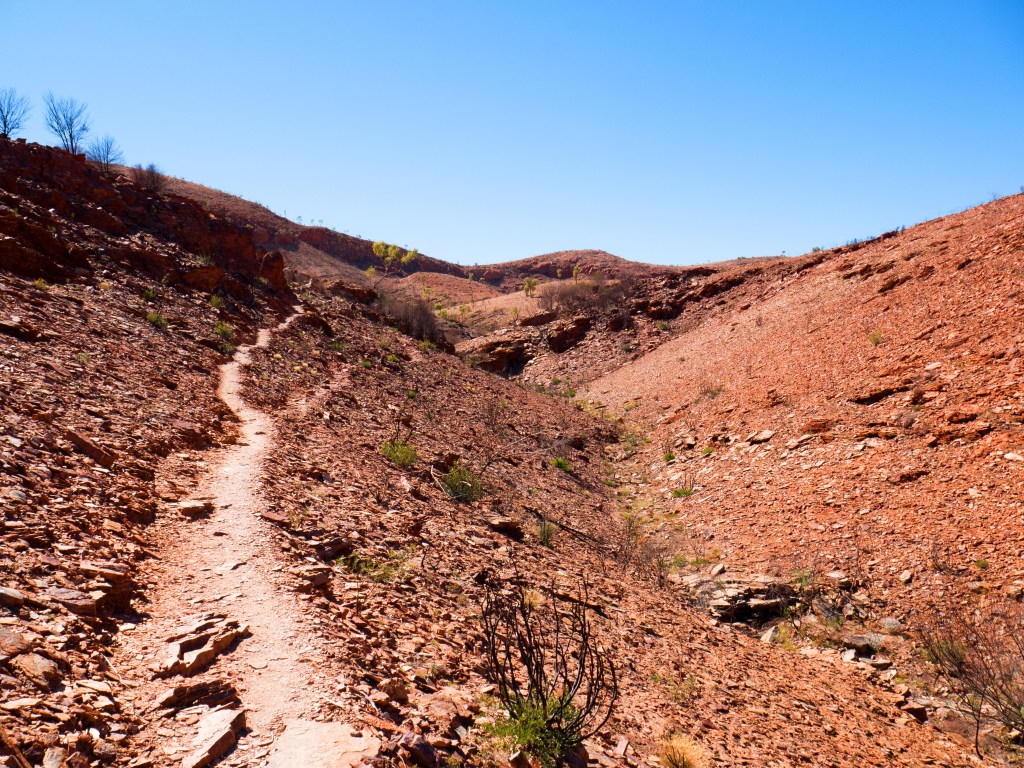 Le jour d’après, nous profitons d’être à Alice Spring pour visiter le parc national West MacDonnell. Nous roulons donc jusqu’aux gorges Orminston pour aller marcher un peu sur une dizaine de kilomètres au milieu d’un somptueux paysage désertique. Quelques oiseaux rigolos à gauche et à droite, comme le pigeon spinifex avec sa drôle de huppette. Par contre l’endroit est infesté de mouches ! Bien sûr, nous avons l’impression qu’elles nous suivent toutes… ça devient passablement agaçant à la longue. Le moins que l’on puisse dire est que ces gorges sont très asséchées en cette période. Le seul point d’eau que nous voyons se trouve à l’entrée des gorges, mais la couleur ne donne pas envie d’y mettre les pieds.