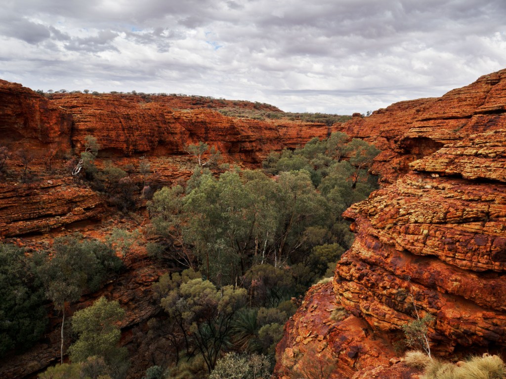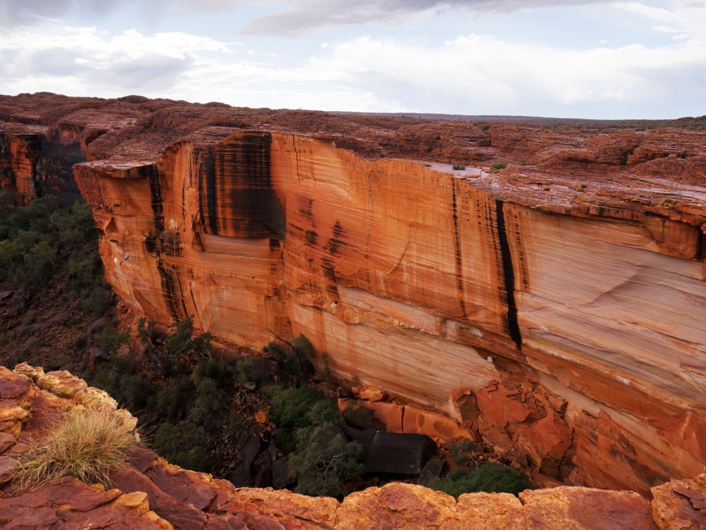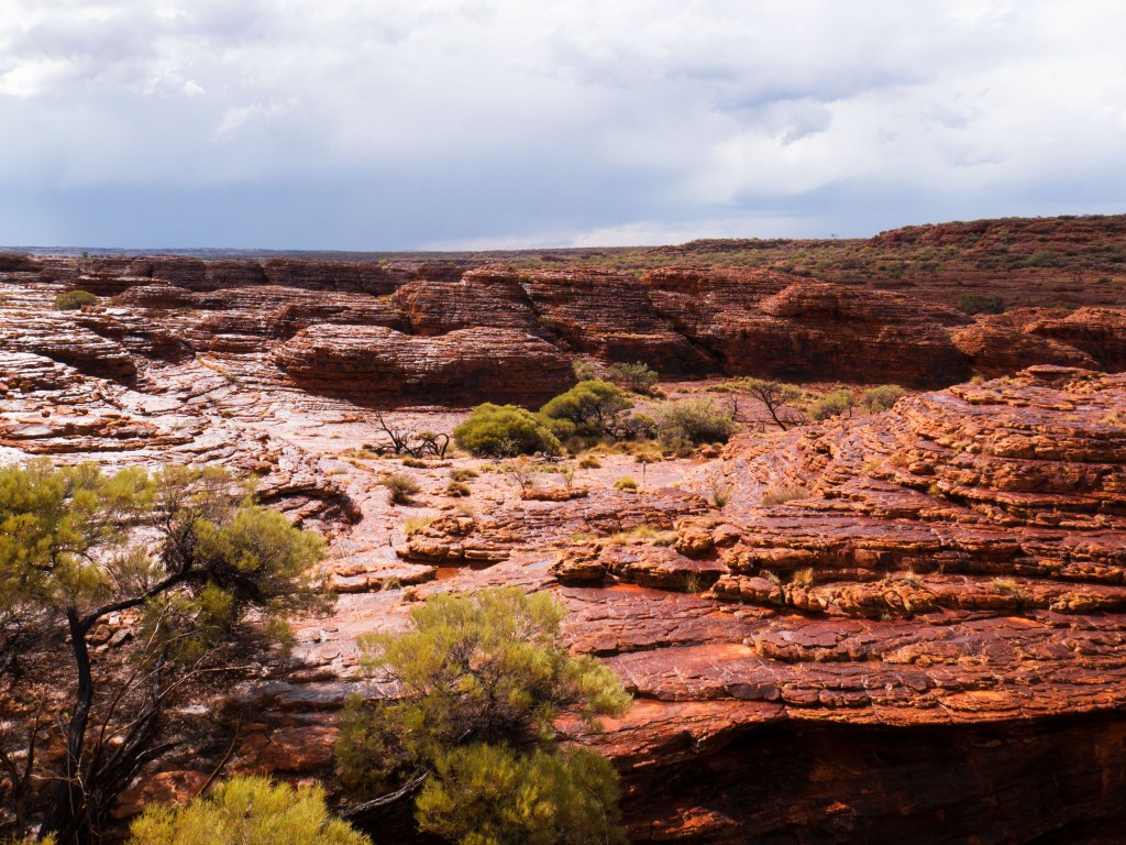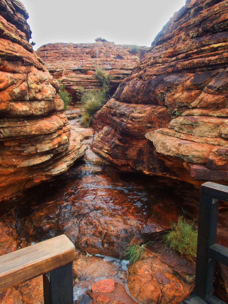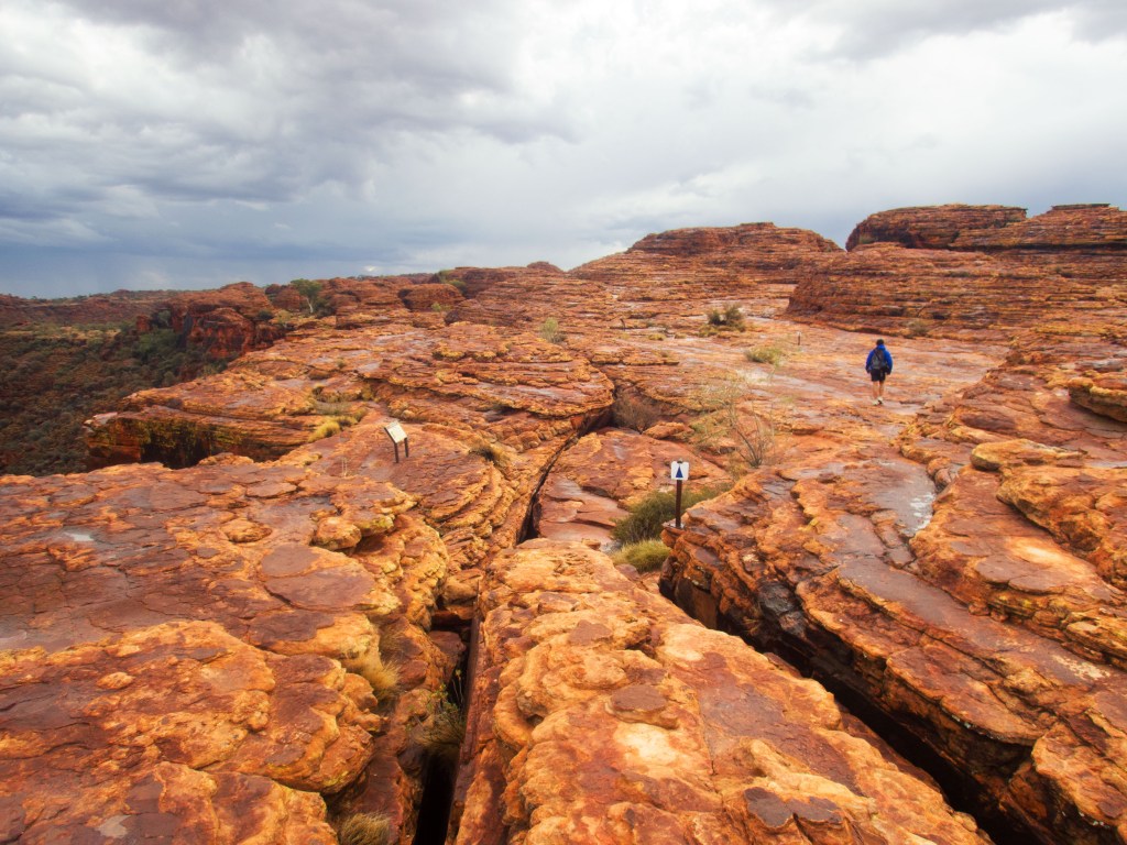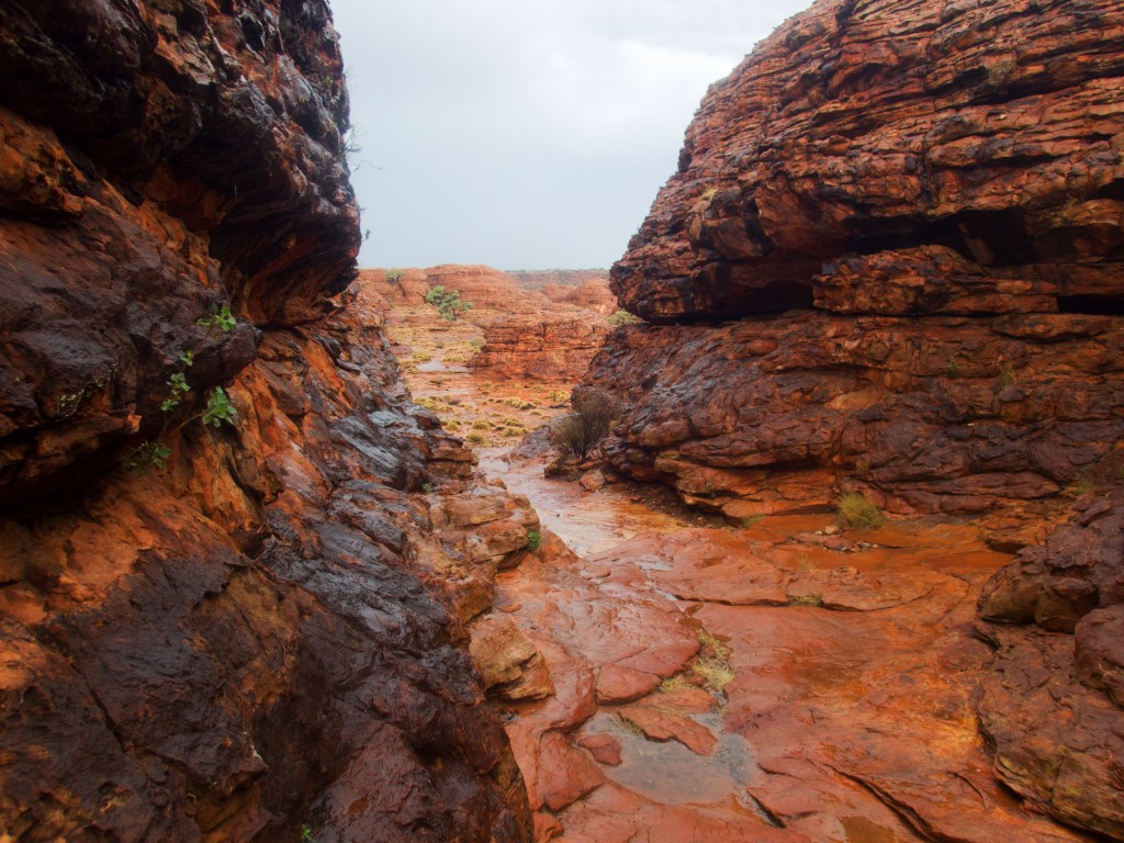 Nous suivons activement les nouvelles et demandons régulièrement à la réception où ça en est, mais pour l’instant pas de bonnes nouvelles. Nous décidons donc d’utiliser un de nos jours de « libre » pour aller découvrir Kings Canyon qui se trouve à environ 300 km d’ici. Nous étions sensé y aller de toute façon, mais sur le chemin du retour. Donc c’est parti pour 3h de route aller et 3h de route retour… qu’est-ce qu’on ne ferait pas ici ahlala. Le temps n’est en plus pas vraiment avec nous. Il pleut durant la majeure partie du trajet et quand nous débutons notre marche également. Mais nous sommes optimistes et le reste de la marche se déroule sans douche. Le moins que l’on puisse dire, est que Kings Canyon est magnifique. Nous marchons autour du canyon pour avoir une vue depuis le haut des falaises, somptueux paysage ! Ça valait la peine de se déplacer.