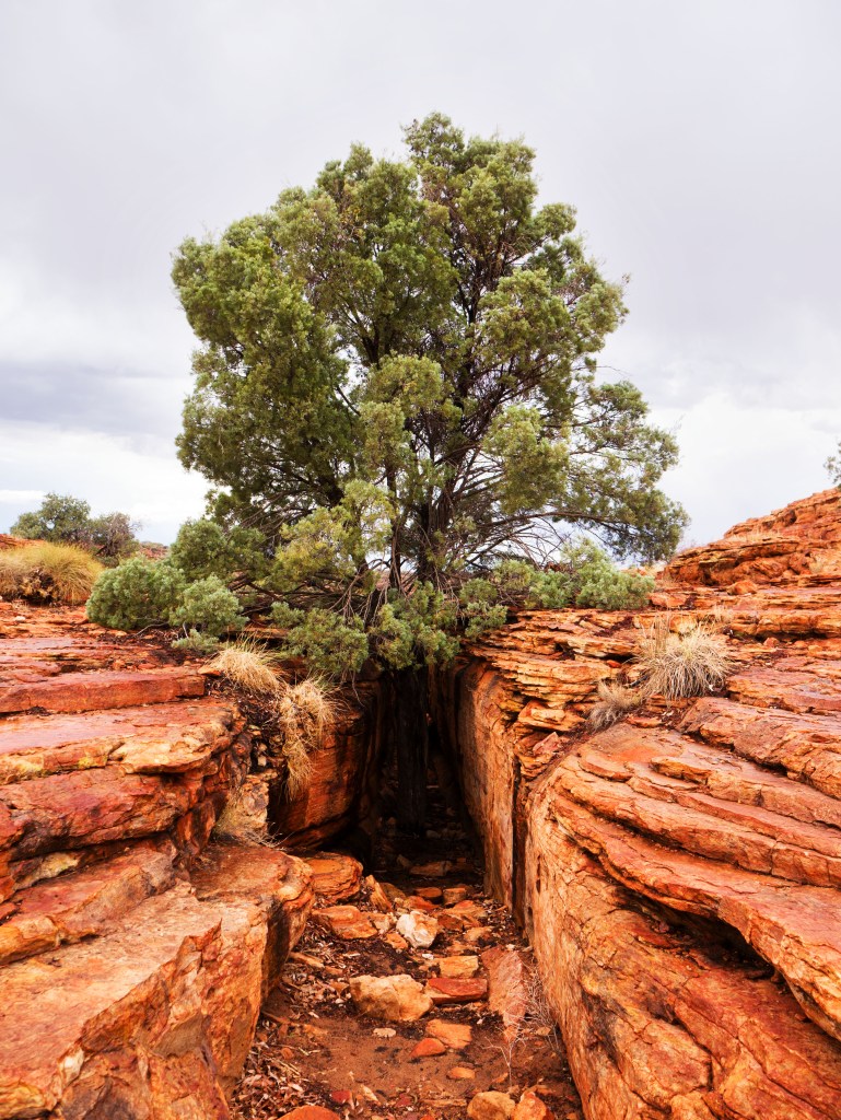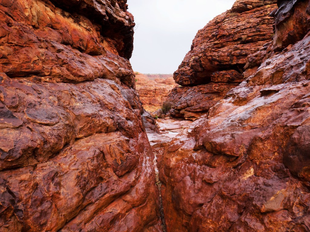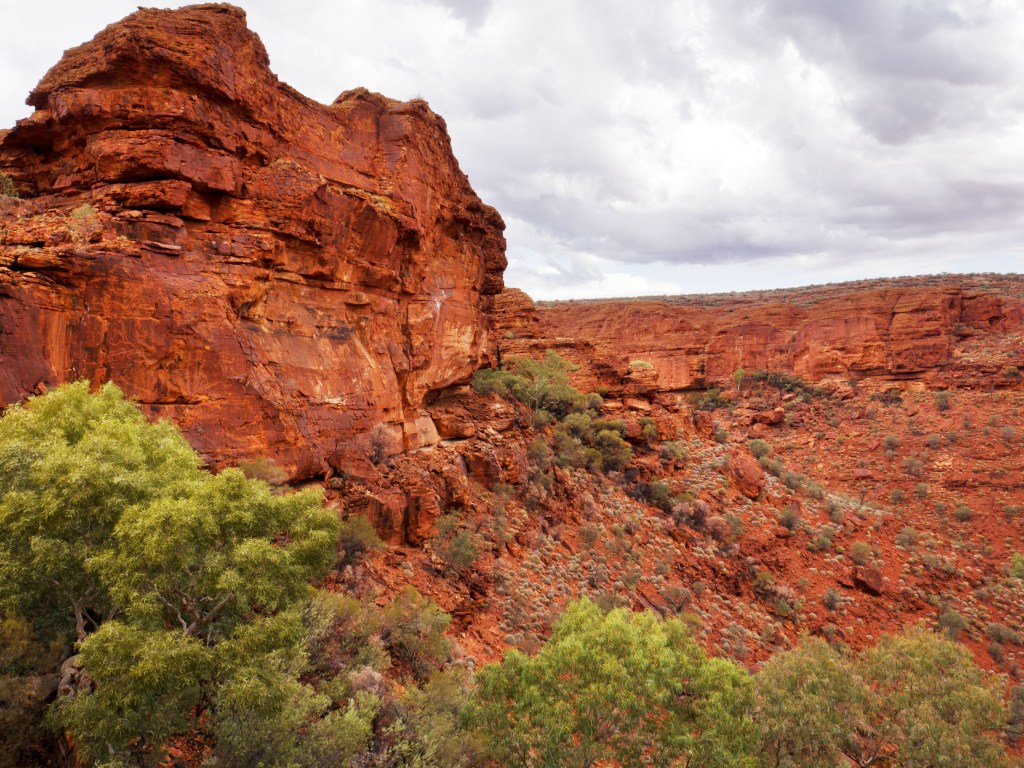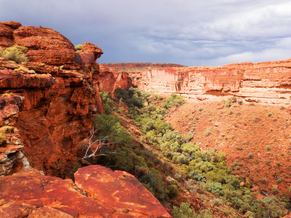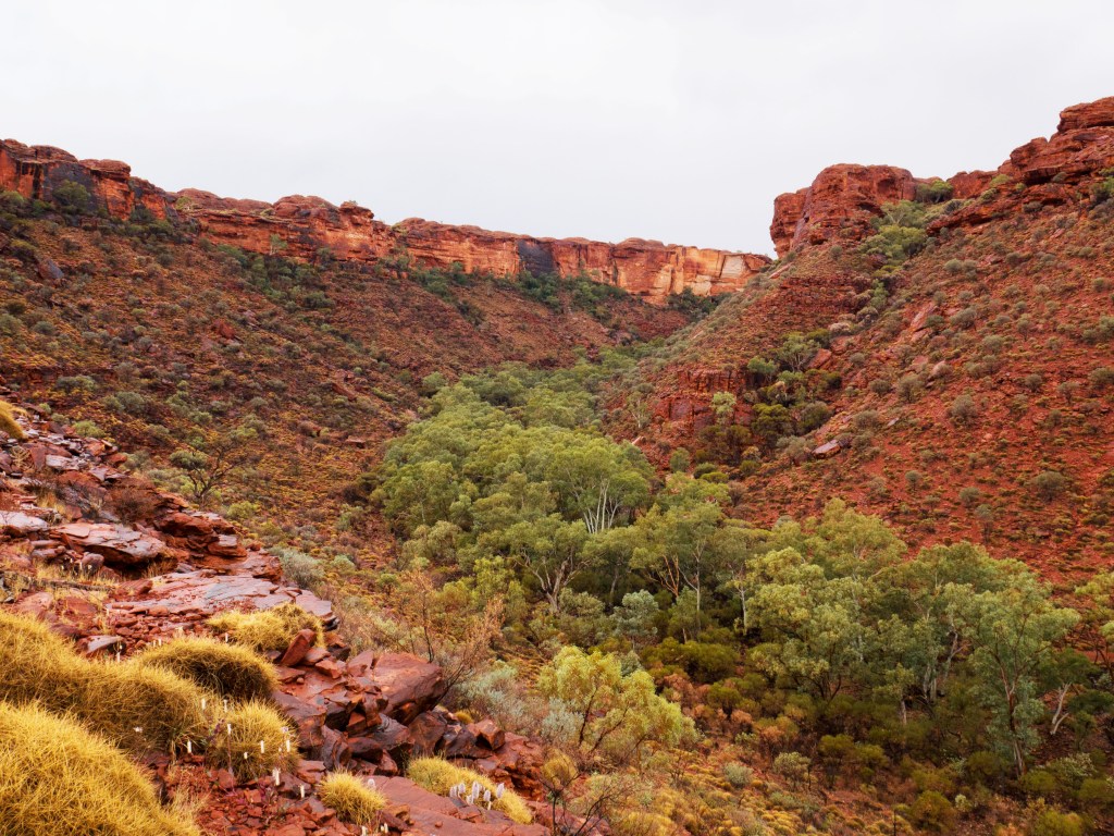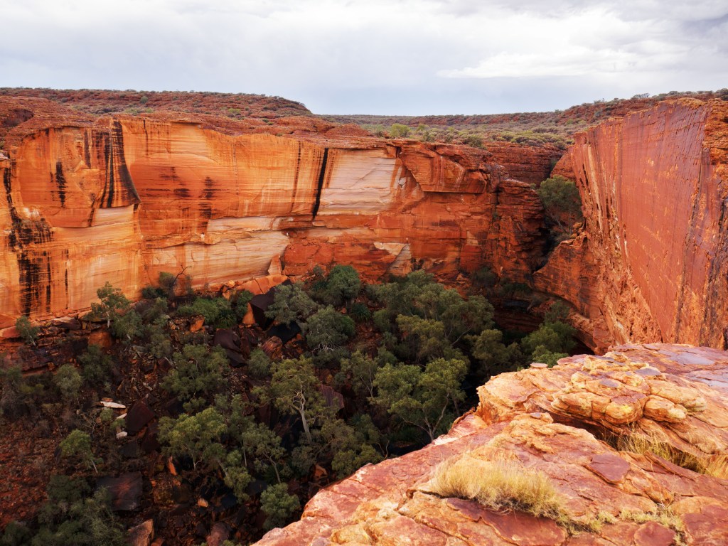 Nous suivons activement les nouvelles et demandons régulièrement à la réception où ça en est, mais pour l’instant pas de bonnes nouvelles. Nous décidons donc d’utiliser un de nos jours de « libre » pour aller découvrir Kings Canyon qui se trouve à environ 300 km d’ici. Nous étions sensé y aller de toute façon, mais sur le chemin du retour. Donc c’est parti pour 3h de route aller et 3h de route retour… qu’est-ce qu’on ne ferait pas ici ahlala. Le temps n’est en plus pas vraiment avec nous. Il pleut durant la majeure partie du trajet et quand nous débutons notre marche également. Mais nous sommes optimistes et le reste de la marche se déroule sans douche. Le moins que l’on puisse dire, est que Kings Canyon est magnifique. Nous marchons autour du canyon pour avoir une vue depuis le haut des falaises, somptueux paysage ! Ça valait la peine de se déplacer.