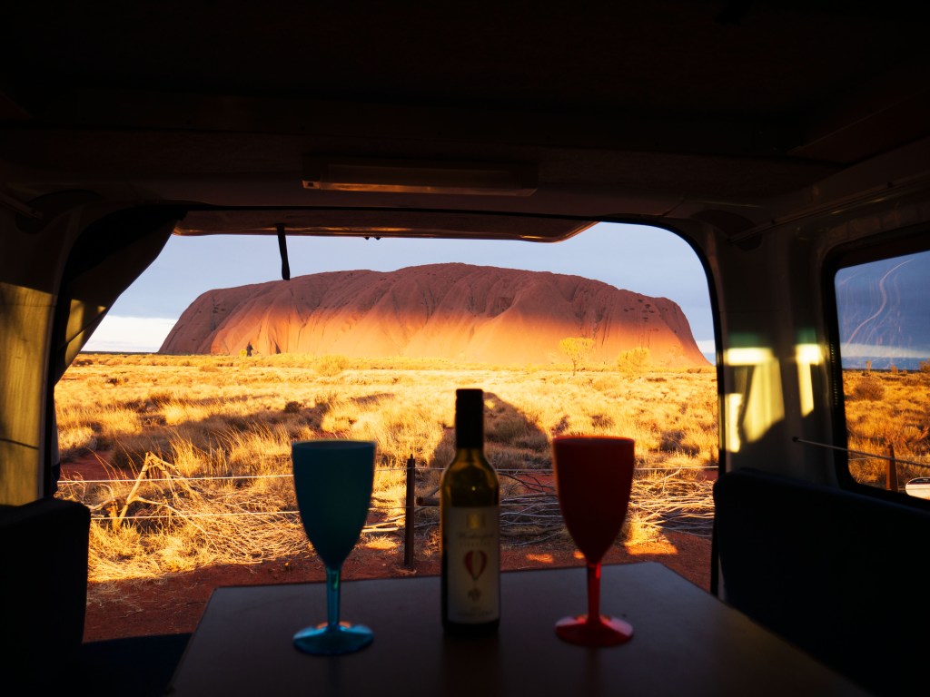 Ensuite nous parquons le van assez tôt pour avoir une bonne place dans le parking afin de voir le coucher de soleil sur Uluru. Nous patientons avec un petit apéro. D’autres à côté de nous se teignent les cheveux, chacun son truc ^^ Beaucoup de nuages ce soir donc nous sommes un peu anxieux… mais finalement le soleil perce l’horizon juste à temps pour nous offrir 5 min de coucher de soleil somptueux avant de disparaitre à nouveau derrière les nuages. Contents d’avoir attendu.