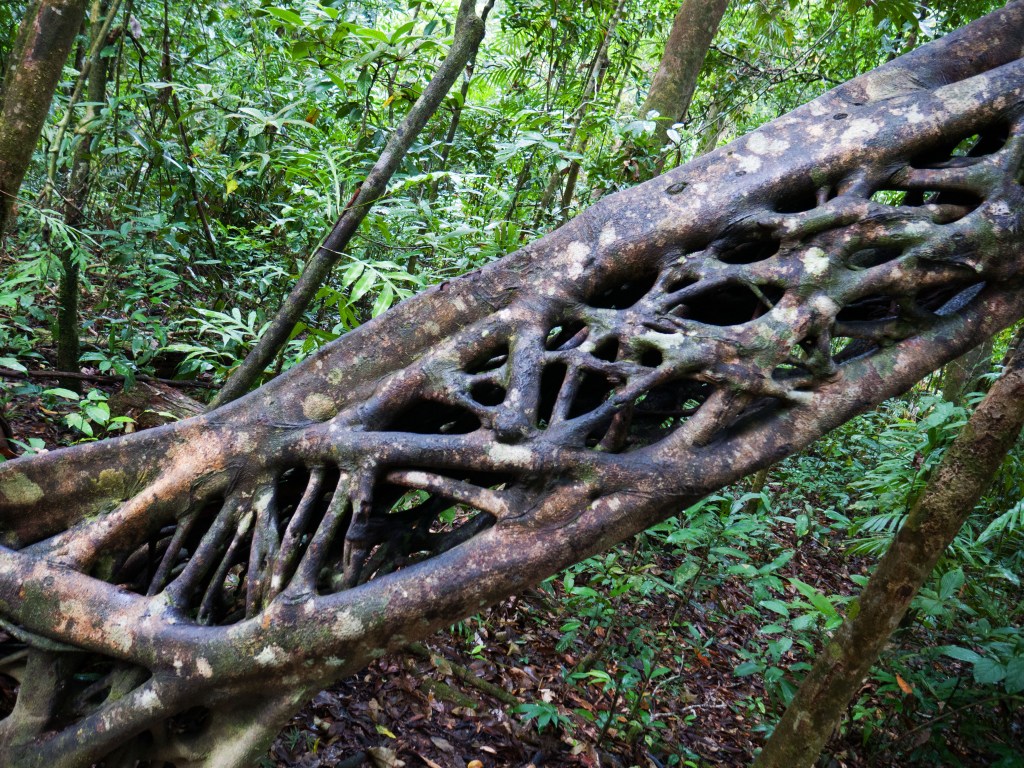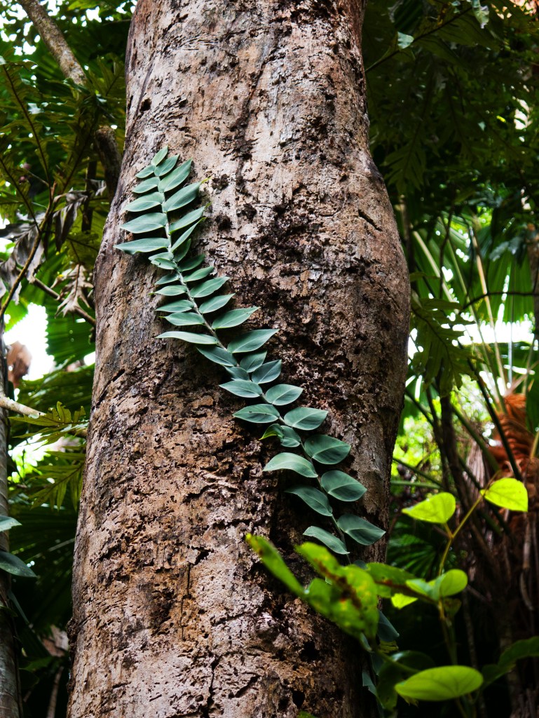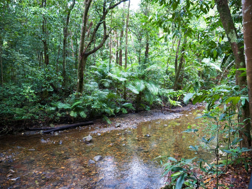 Le lendemain, nous nous dirigeons vers la forêt tropicale de Daintree. Pour y accéder, nous devons prendre le ferry qui traverse la rivière de Daintree, connue pour ses crocodiles. Aucun à l’horizon lorsque nous passons. Par contre nous sommes entourés d’hirondelles qui ont apparemment élu domicile sur le ferry et font tous les jours les traversées. Une fois de l’autre côté, nous suivons la route parsemée de dos d’âne à cause des casoars qui habitent la région. Ces grands oiseaux assez dangereux sont en faite très peureux. En tout cas aucun signe d’eux pour le moment. Le paysage tropical est somptueux. Nous roulons littéralement au milieu de la forêt. Des lianes sont suspendues aux arbres un peu partout autour de nous et la végétation est très dense. Nous avons juste la place pour passer avec notre véhicule. Finalement, après quelques kilomètres, nous arrivons à Cape Tribulation, une toute petite bourgade au bord de l’océan. Notre camping se situe pour ainsi dire dans la jungle. Petit mais charmant, la cuisine a tout ce qu’il faut, c’est propre et le tout fait très safari. En plus une piscine est à disposition.