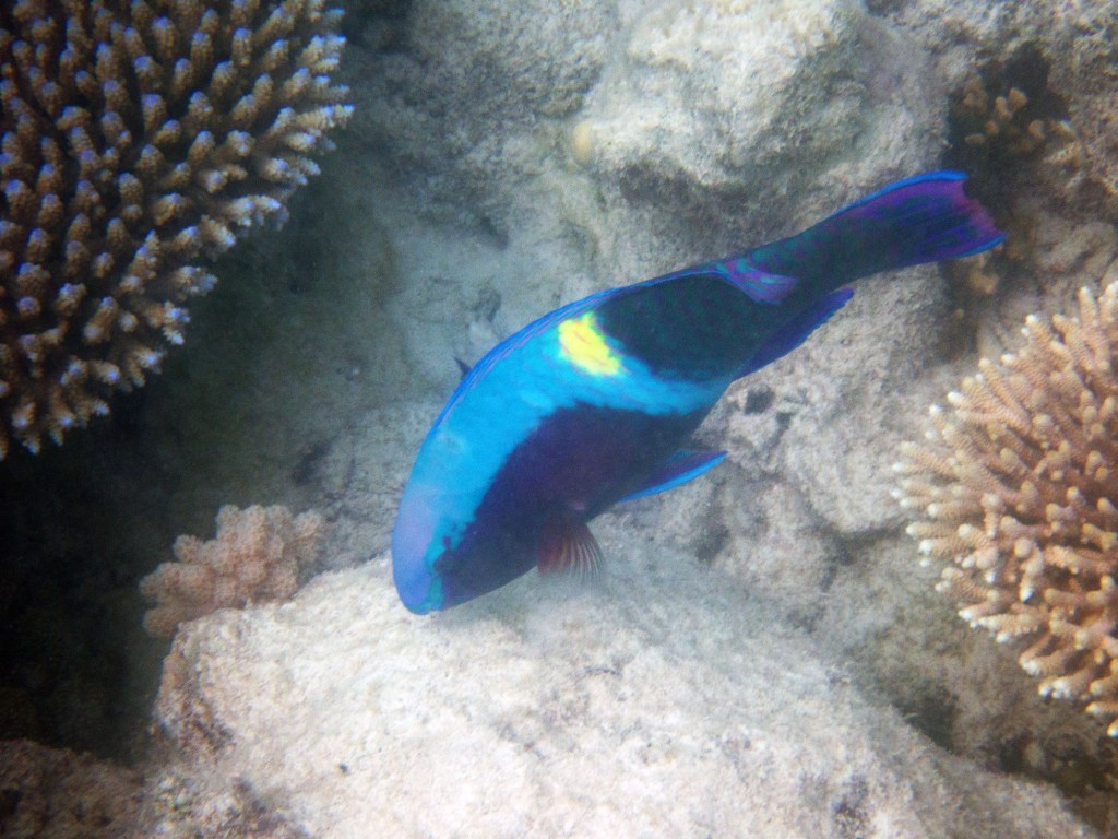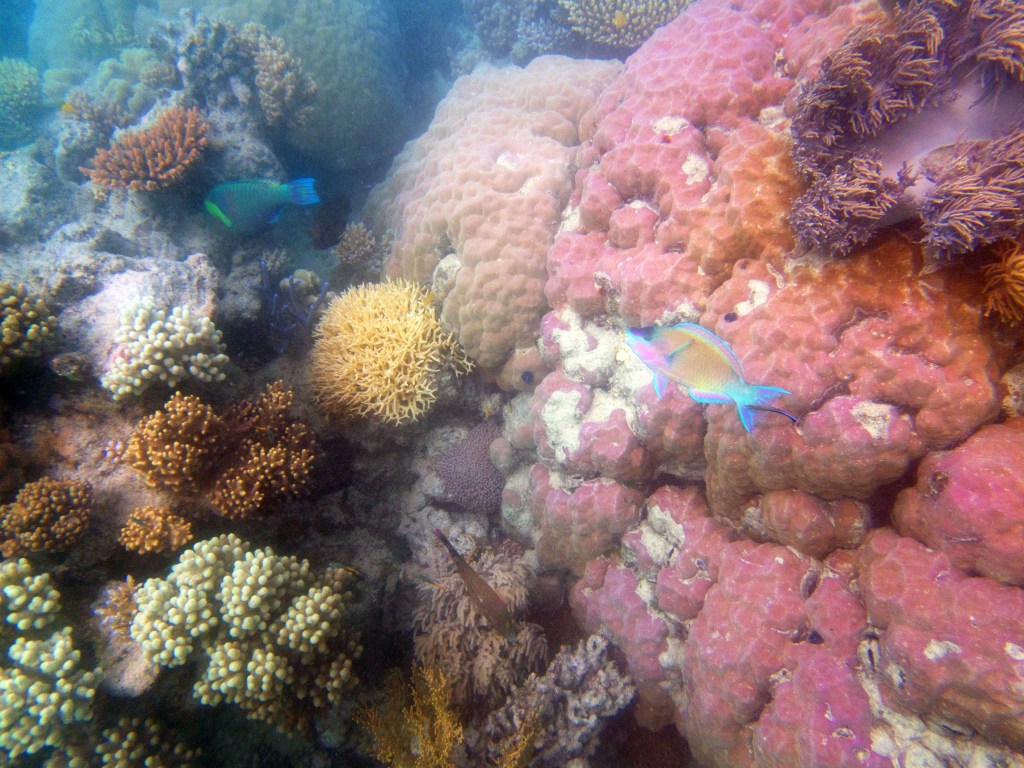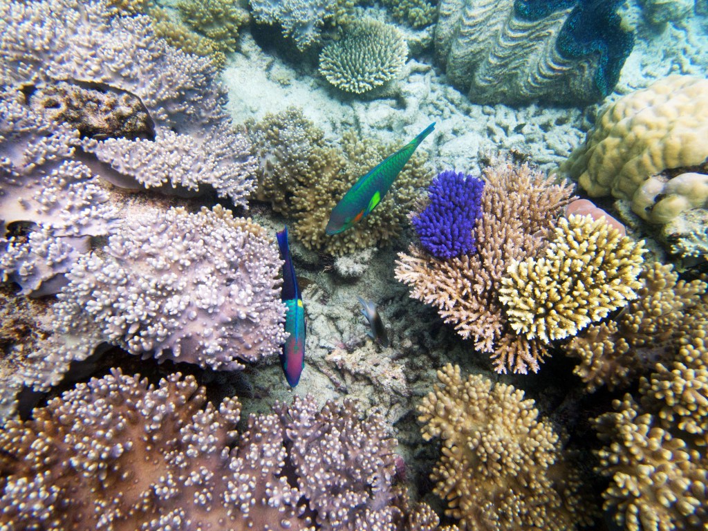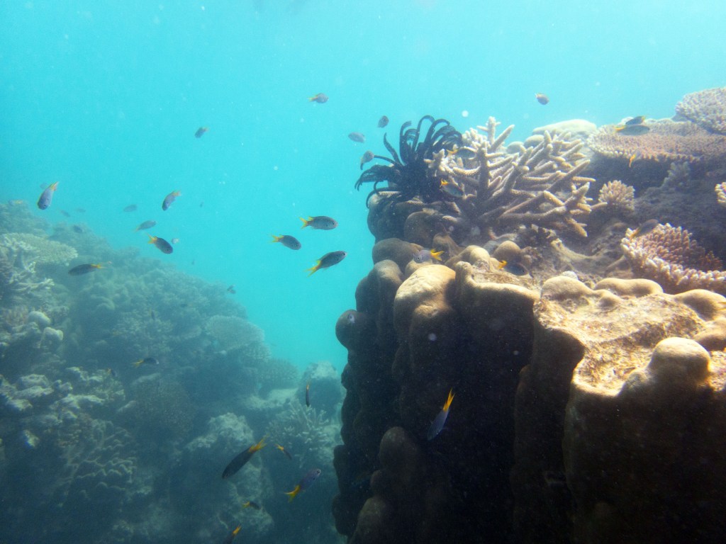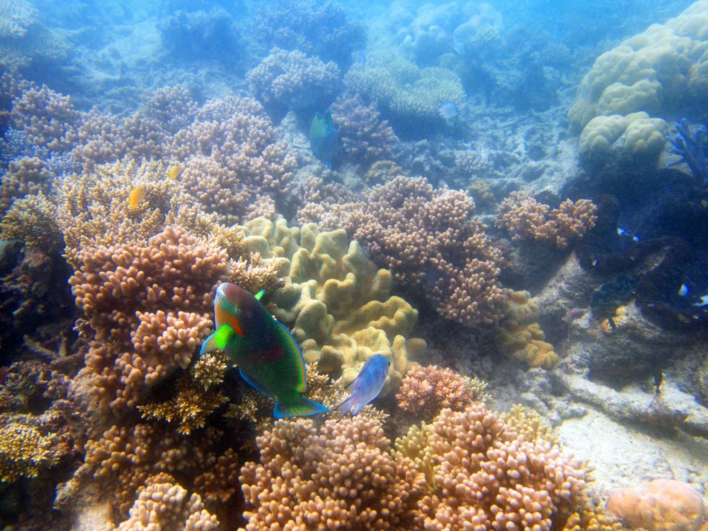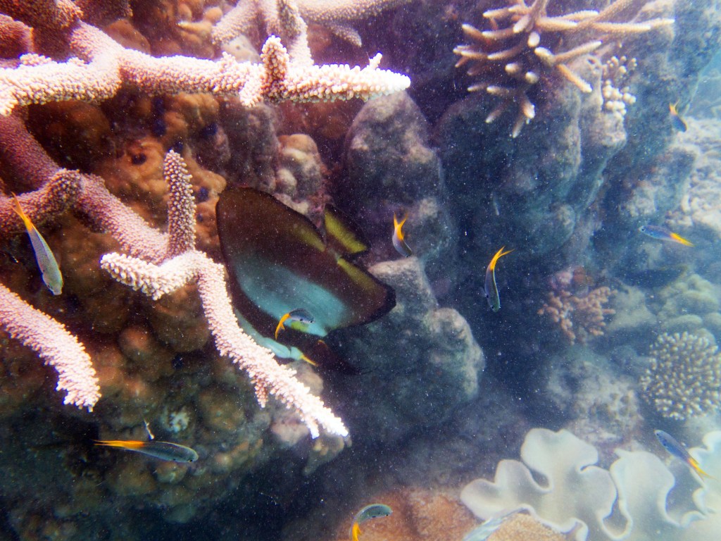 Le temps est mitigé mais nous décidons de réserver un tour sur la grande barrière de corail qui se trouve à 30 min en bateau des côtes depuis ici. Autant en profiter ! Nous nous équipons et écoutons notre guide qui nous informe qu’aujourd’hui les conditions sont assez « rough » pour atteindre les récifs. Il nous laisse donc la possibilité de nous retirer si nous le souhaitons. Certaines personnes décident du coup d’annuler. Nous marchons ensuite jusqu’à la plage et embarquons dans notre bateau (fast boat). Et c’est partie pour se faire secouer un moment ! Effectivement le voyage est assez « bumpy » (contente d’avoir pris ma tablette^^) mais ce n’est rien comparé à notre sortie « whale watching » que nous avions fait à Byron Bay. Nous arrivons donc tous en un morceau et après quelques explications de nos guides, nous sautons tous à l’eau et débutons notre premier « snorkeling ». Pleins de poissons et encore pleins de poissons.