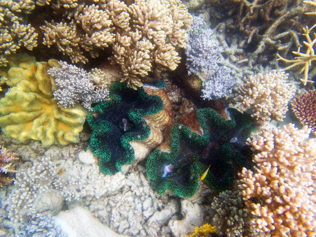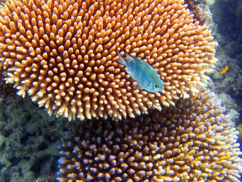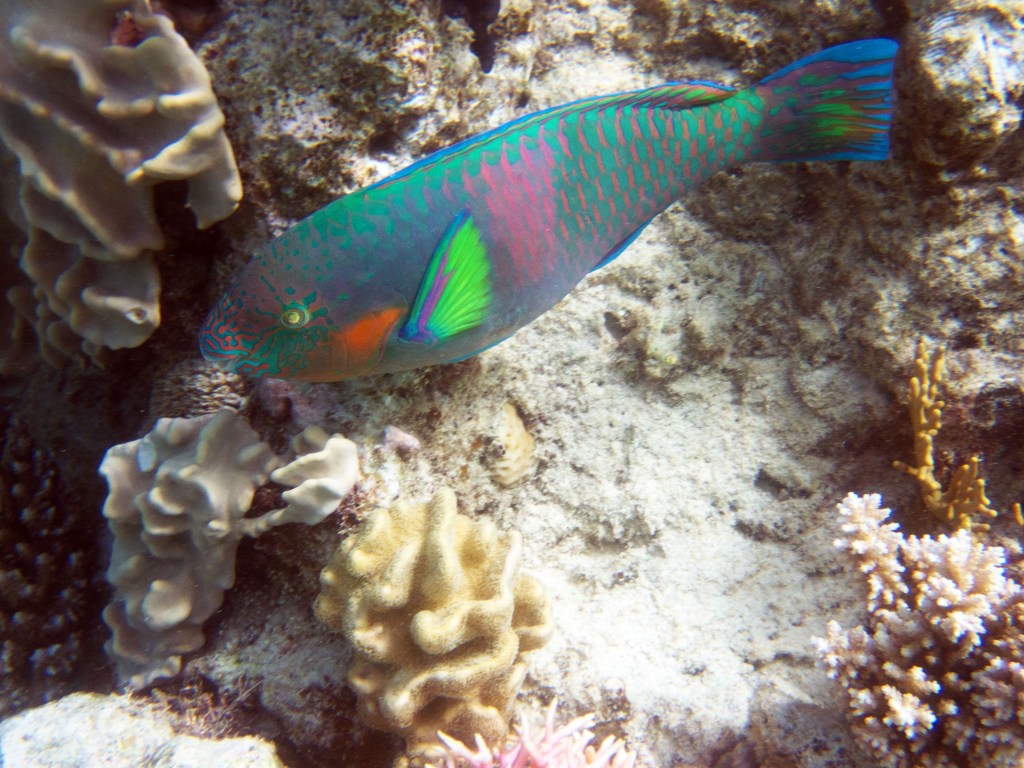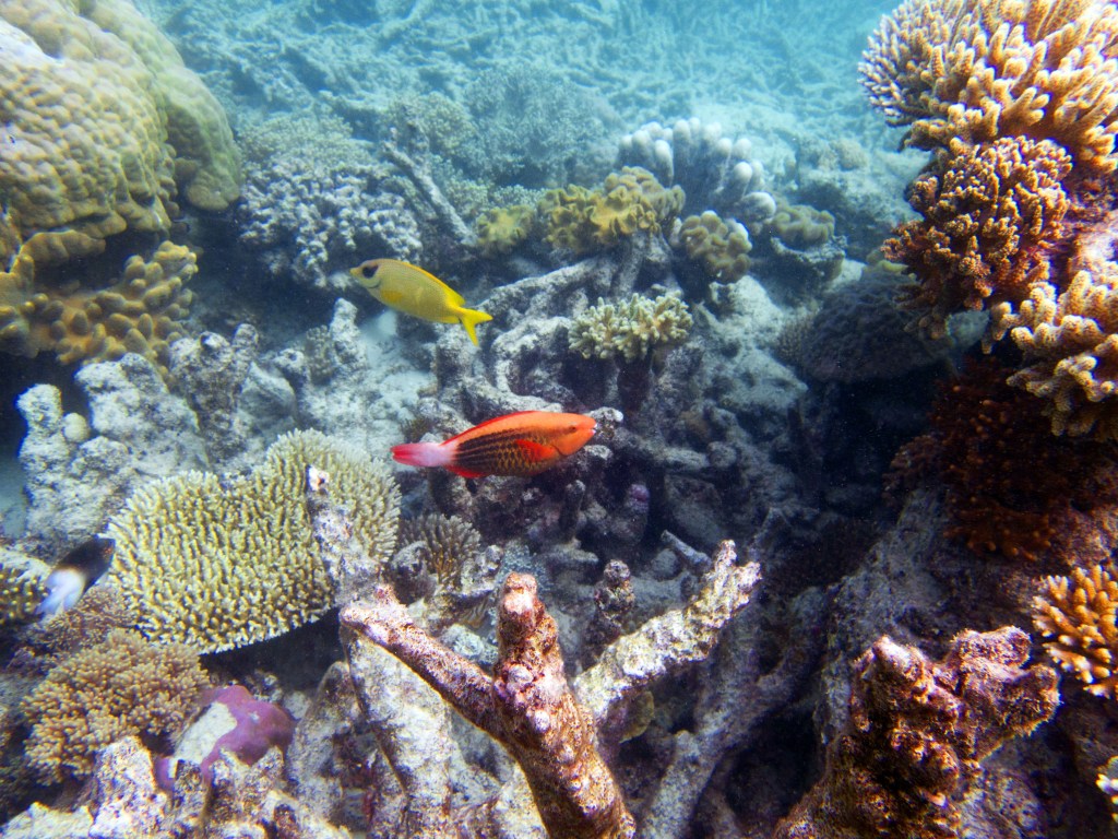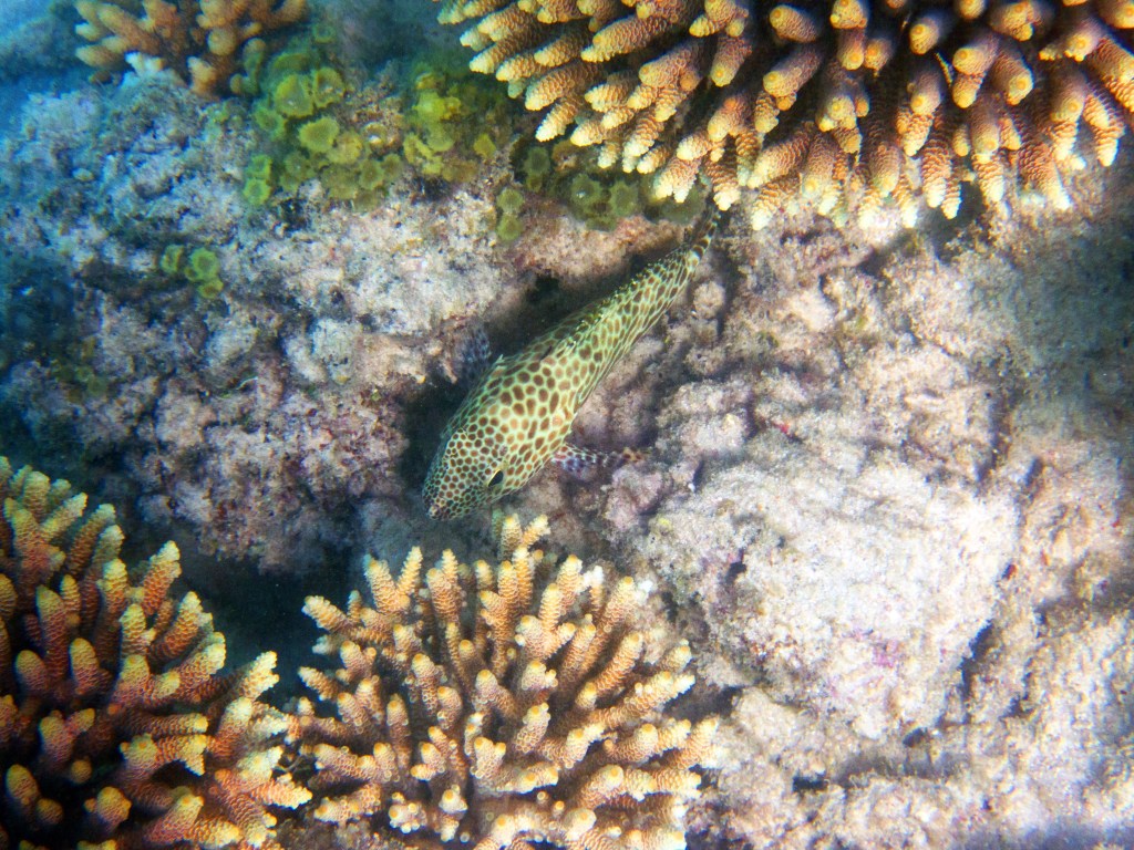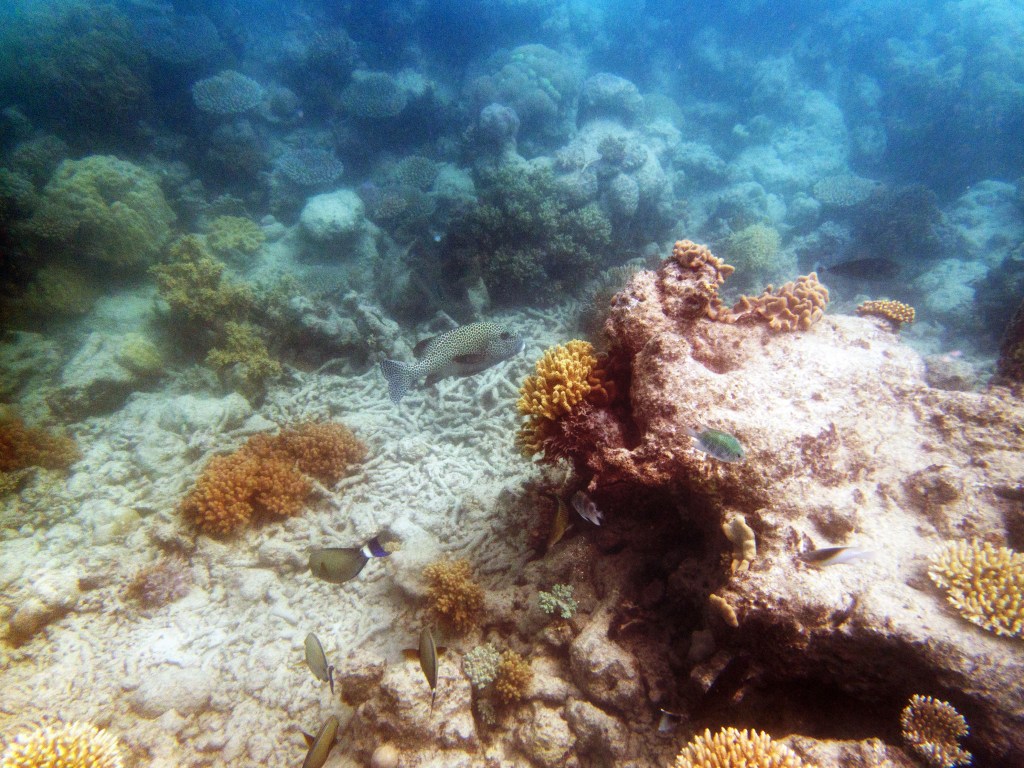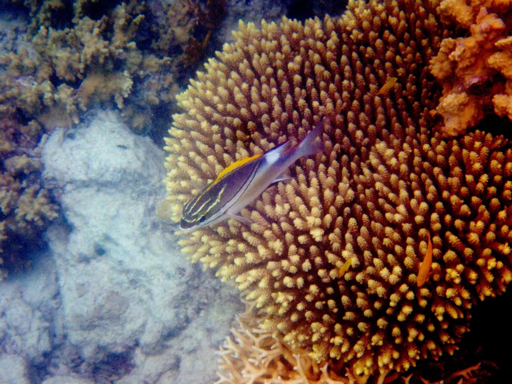 Le temps est mitigé mais nous décidons de réserver un tour sur la grande barrière de corail qui se trouve à 30 min en bateau des côtes depuis ici. Autant en profiter ! Nous nous équipons et écoutons notre guide qui nous informe qu’aujourd’hui les conditions sont assez « rough » pour atteindre les récifs. Il nous laisse donc la possibilité de nous retirer si nous le souhaitons. Certaines personnes décident du coup d’annuler. Nous marchons ensuite jusqu’à la plage et embarquons dans notre bateau (fast boat). Et c’est partie pour se faire secouer un moment ! Effectivement le voyage est assez « bumpy » (contente d’avoir pris ma tablette^^) mais ce n’est rien comparé à notre sortie « whale watching » que nous avions fait à Byron Bay. Nous arrivons donc tous en un morceau et après quelques explications de nos guides, nous sautons tous à l’eau et débutons notre premier « snorkeling ». Pleins de poissons et encore pleins de poissons.