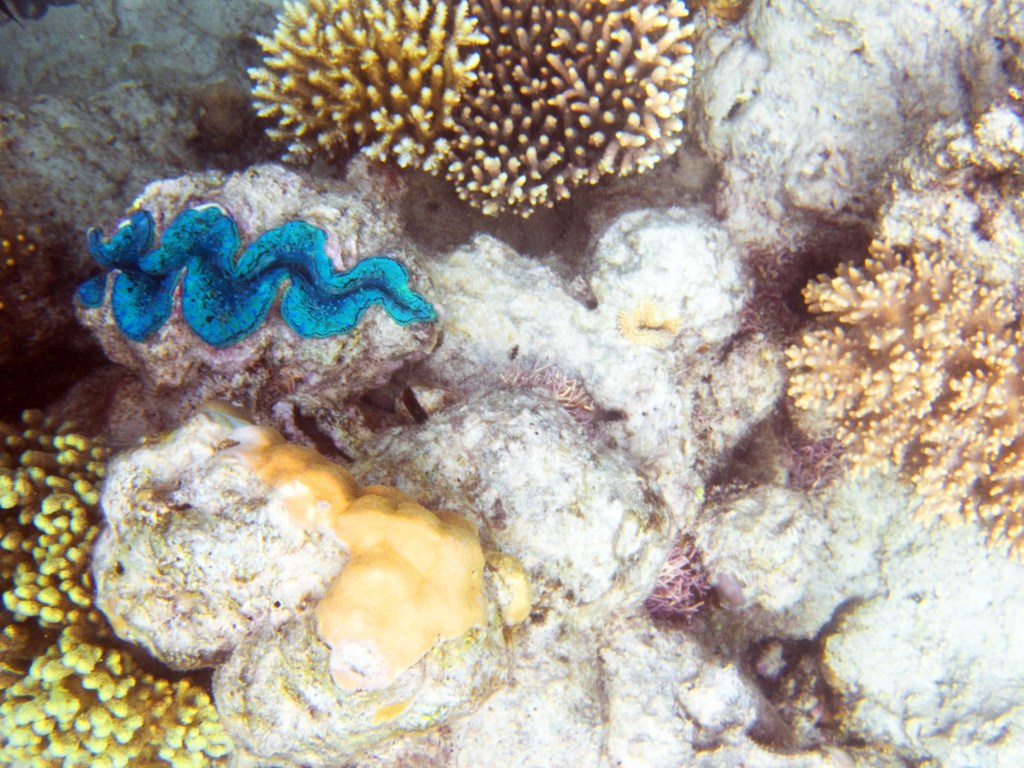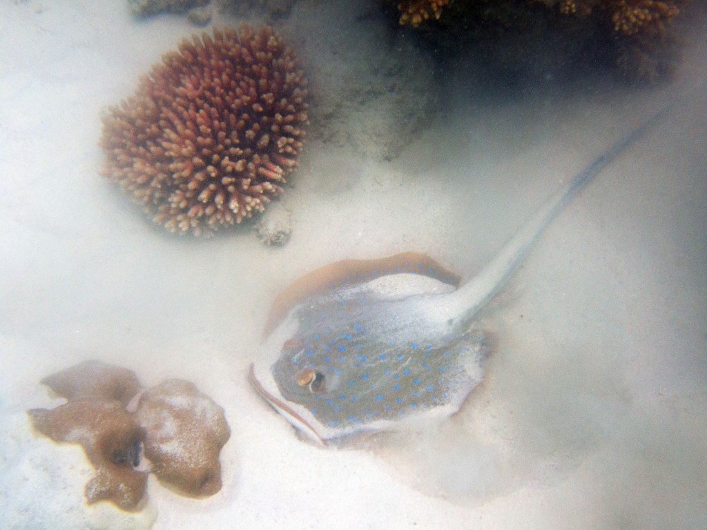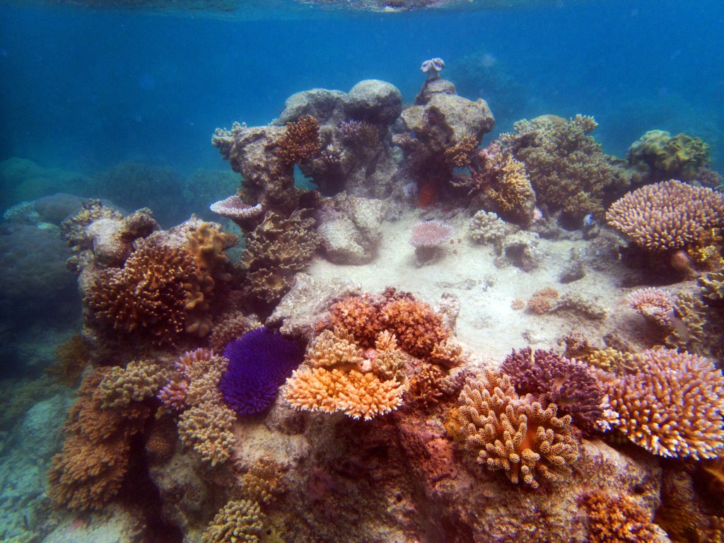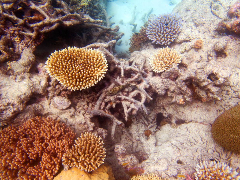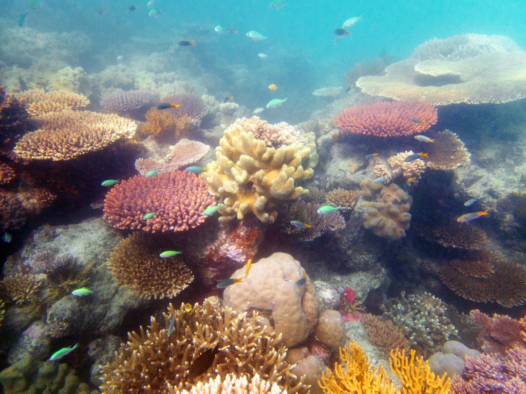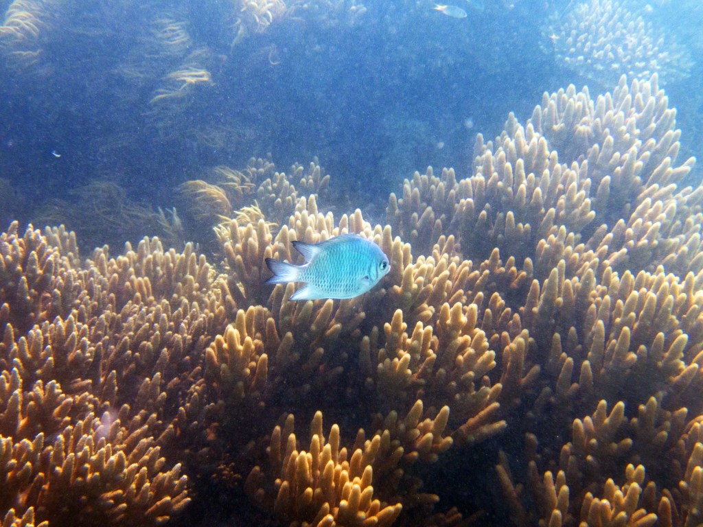 Le temps est mitigé mais nous décidons de réserver un tour sur la grande barrière de corail qui se trouve à 30 min en bateau des côtes depuis ici. Autant en profiter ! Nous nous équipons et écoutons notre guide qui nous informe qu’aujourd’hui les conditions sont assez « rough » pour atteindre les récifs. Il nous laisse donc la possibilité de nous retirer si nous le souhaitons. Certaines personnes décident du coup d’annuler. Nous marchons ensuite jusqu’à la plage et embarquons dans notre bateau (fast boat). Et c’est partie pour se faire secouer un moment ! Effectivement le voyage est assez « bumpy » (contente d’avoir pris ma tablette^^) mais ce n’est rien comparé à notre sortie « whale watching » que nous avions fait à Byron Bay. Nous arrivons donc tous en un morceau et après quelques explications de nos guides, nous sautons tous à l’eau et débutons notre premier « snorkeling ». Pleins de poissons et encore pleins de poissons.
