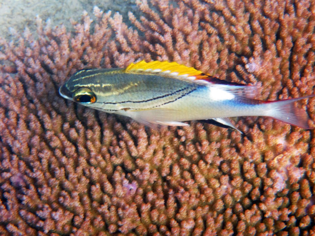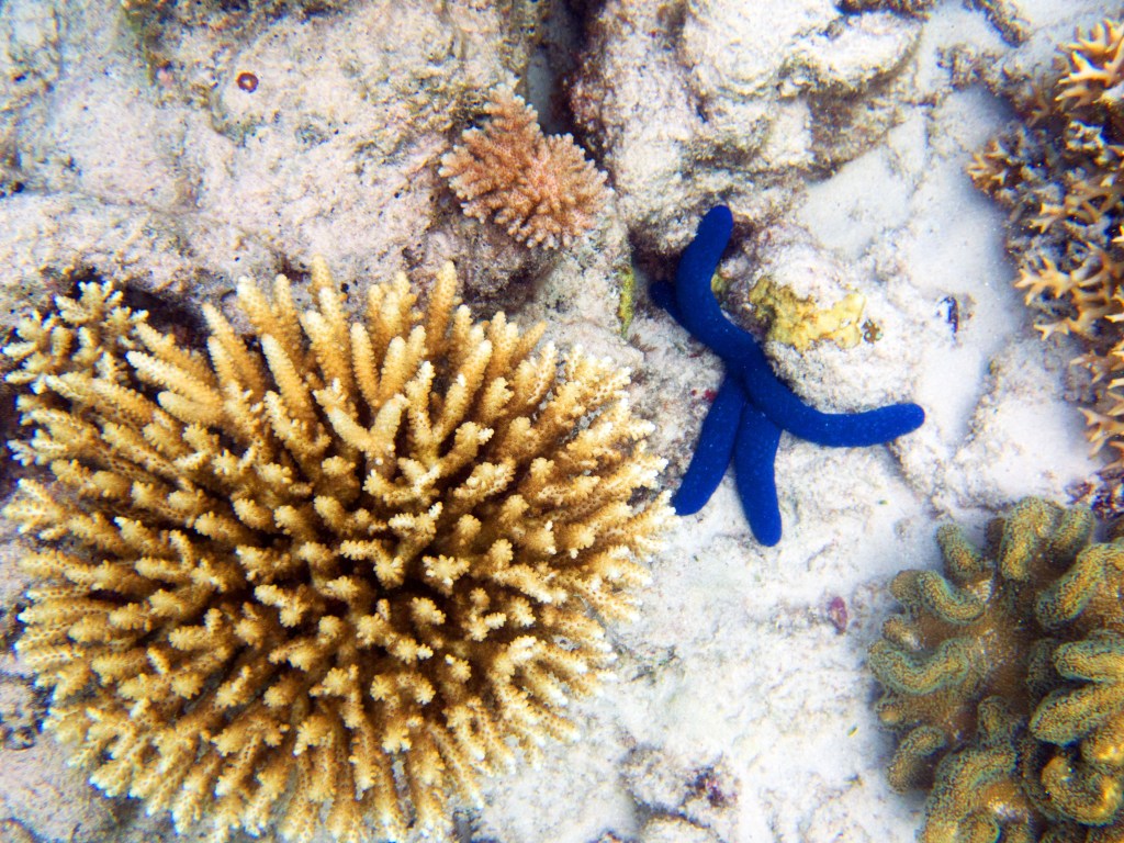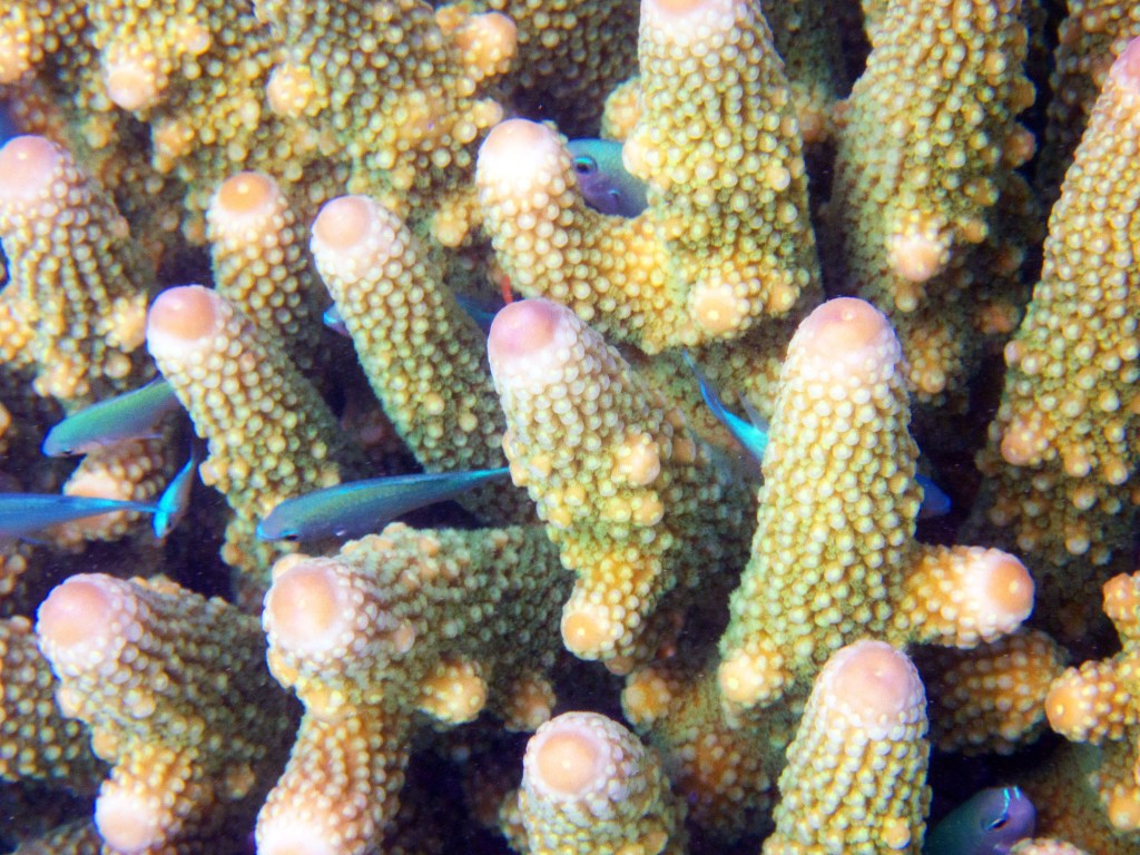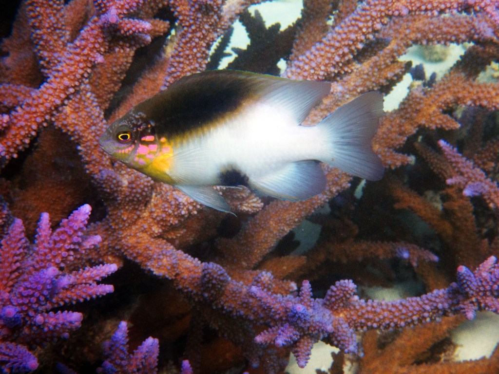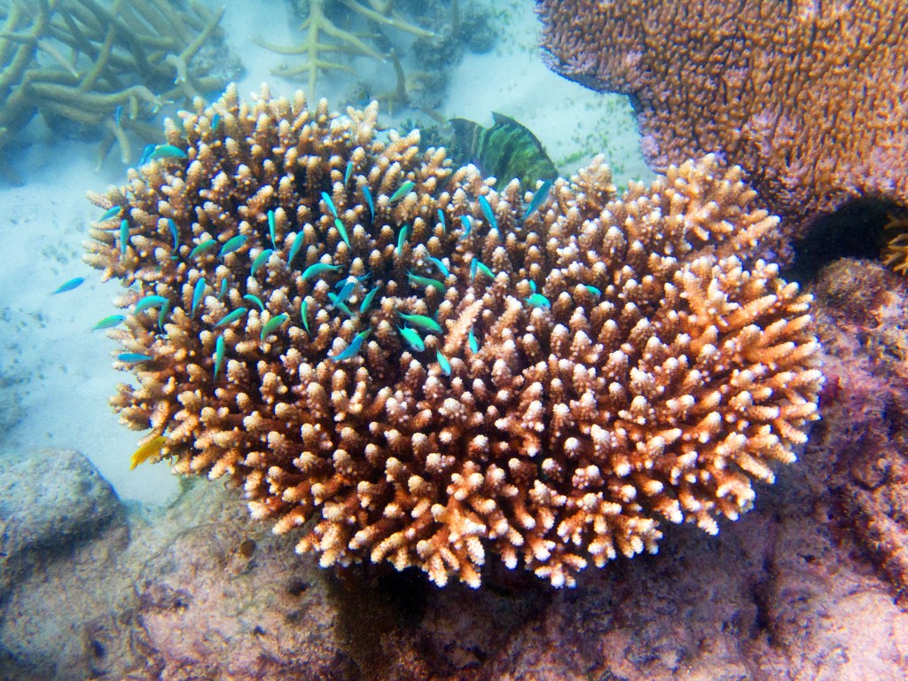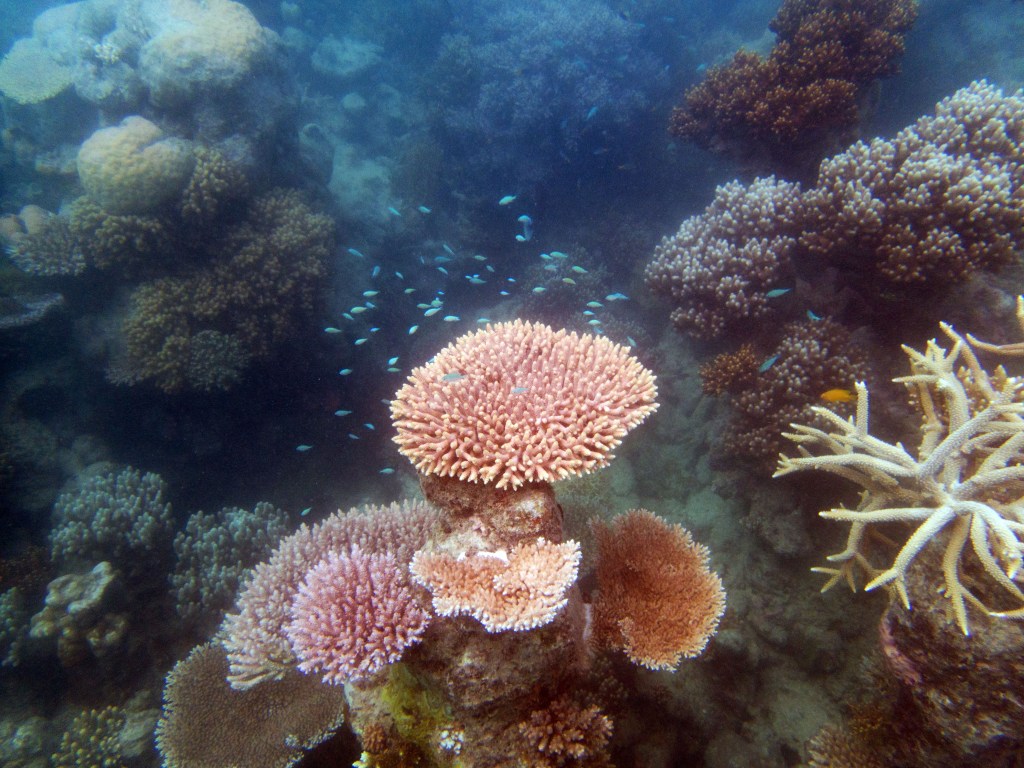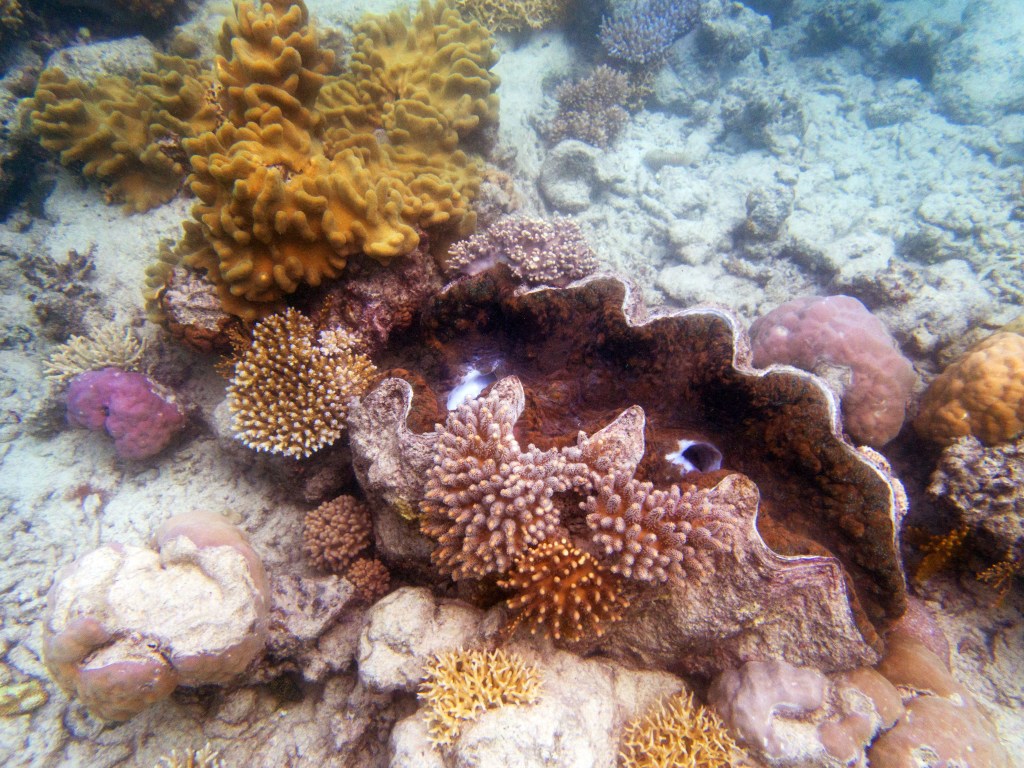 Le temps est mitigé mais nous décidons de réserver un tour sur la grande barrière de corail qui se trouve à 30 min en bateau des côtes depuis ici. Autant en profiter ! Nous nous équipons et écoutons notre guide qui nous informe qu’aujourd’hui les conditions sont assez « rough » pour atteindre les récifs. Il nous laisse donc la possibilité de nous retirer si nous le souhaitons. Certaines personnes décident du coup d’annuler. Nous marchons ensuite jusqu’à la plage et embarquons dans notre bateau (fast boat). Et c’est partie pour se faire secouer un moment ! Effectivement le voyage est assez « bumpy » (contente d’avoir pris ma tablette^^) mais ce n’est rien comparé à notre sortie « whale watching » que nous avions fait à Byron Bay. Nous arrivons donc tous en un morceau et après quelques explications de nos guides, nous sautons tous à l’eau et débutons notre premier « snorkeling ». Pleins de poissons et encore pleins de poissons.