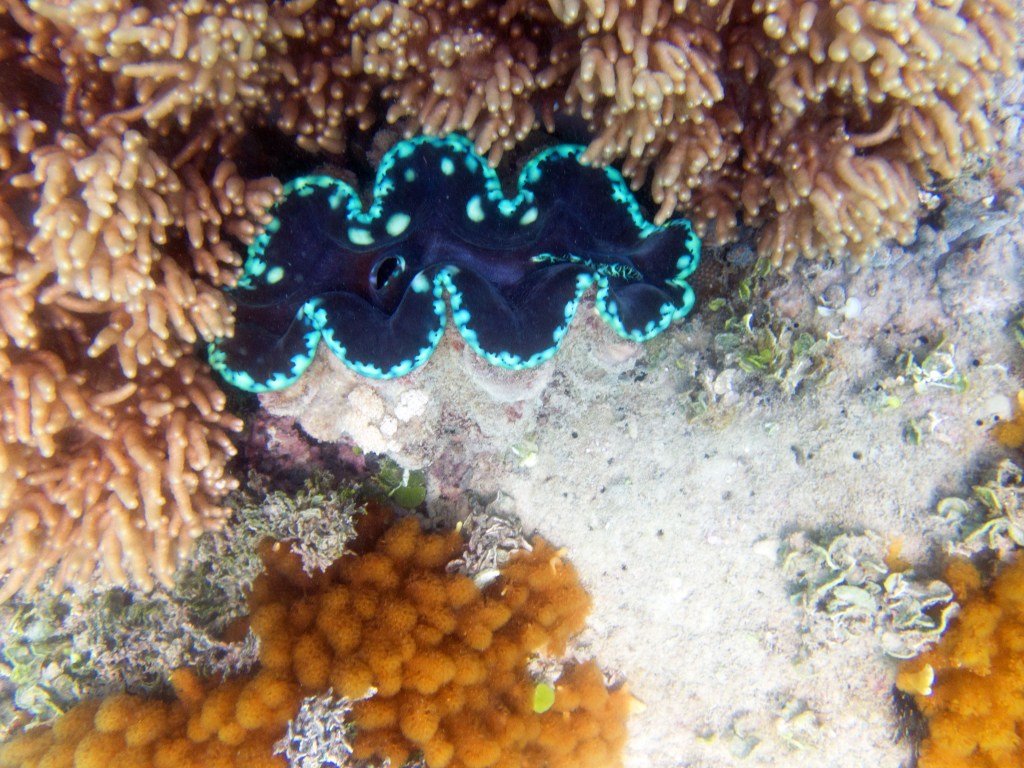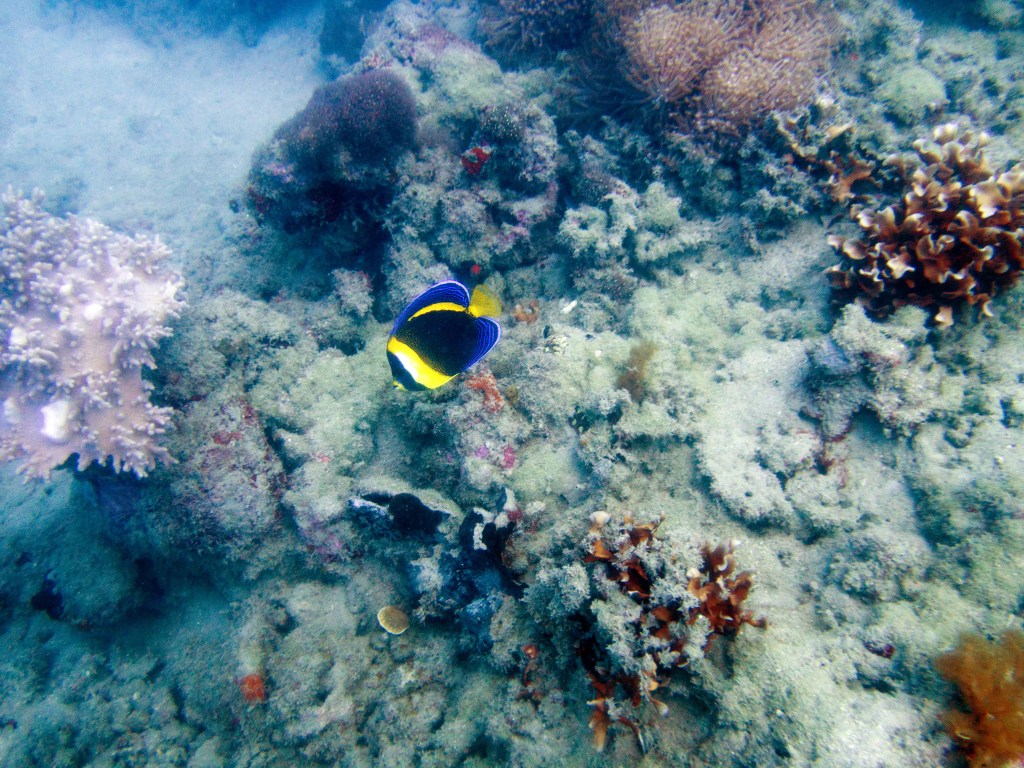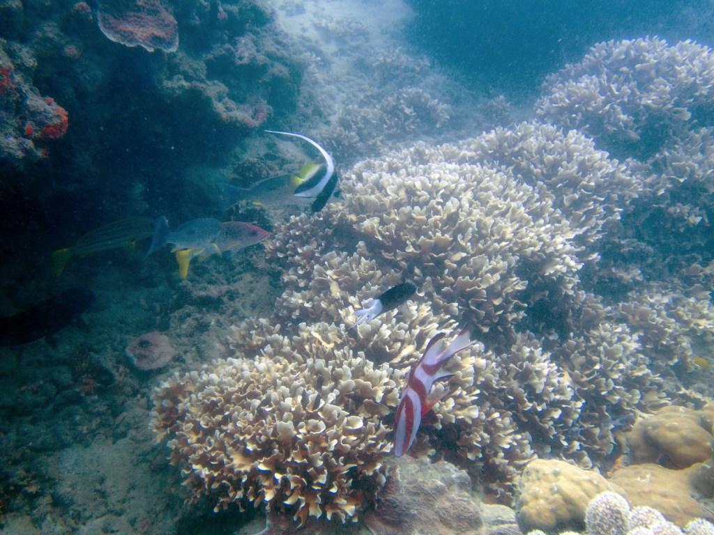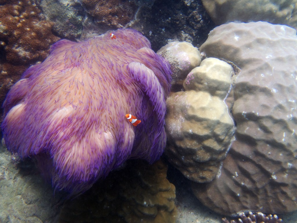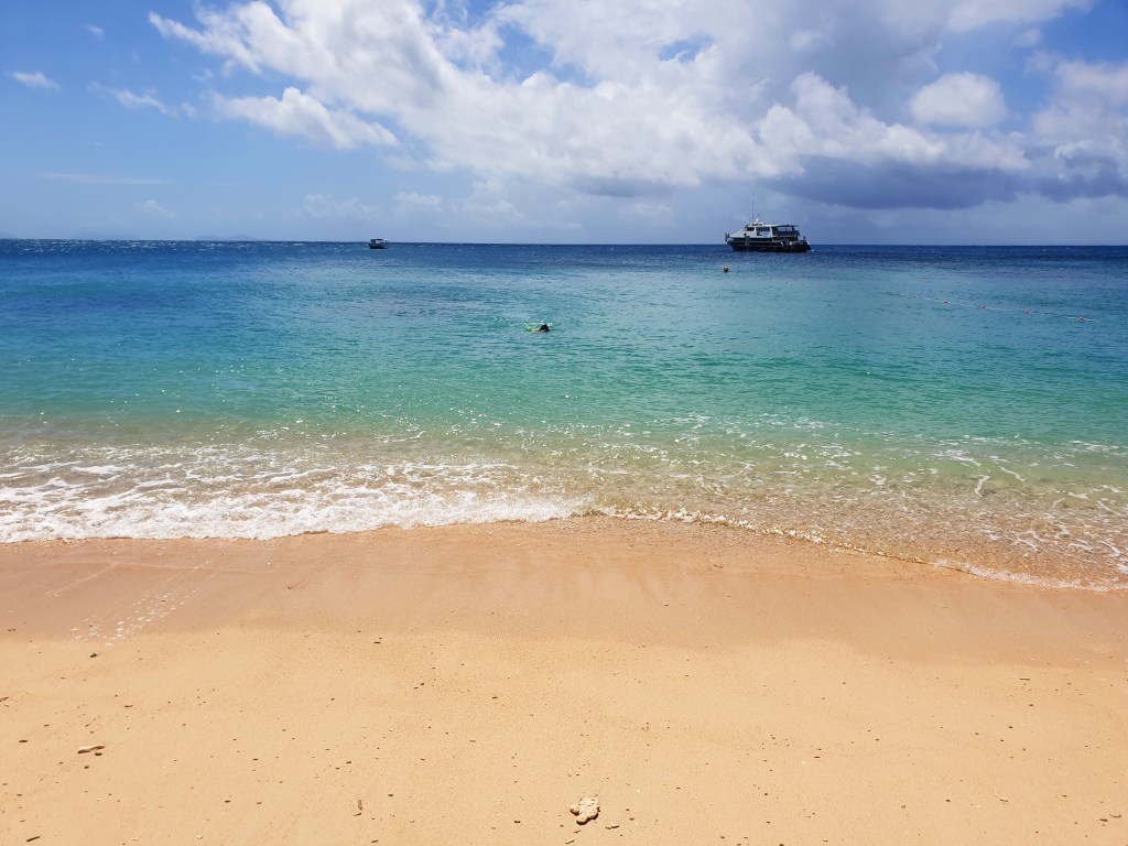Une fois de retour sur l’île, le dîner nous attend (boite à pique-nique personnel, Covid oblige), puis nous continuons la journée par une ballade et visite guidée de l’île. Notre experte en biologie marine nous explique les comportements de chaque être vivant que nous croisons et nous expose les caractéristiques de l’endroit. Ici les coraux sont mis à rude épreuve à cause de la chaleur par exemple. Les marées notamment les exposent hors de l’eau par moment. Des courants d’eau douce également parcourent parfois le récif, dû à l’embouchure d’un fleuve non loin de là. Aucune explication scientifique n’a encore pu être apportée, mais apparemment ces coraux ont réussi à s’adapter à ces changements radicaux qui en temps normal leur seraient fatals. Nous apprenons également, par exemple, que les concombres de mer, malgré leur aspect un peu dégoutant, sont de vrais filtres aquatiques, indispensables au bon fonctionnement de la vie sous-marine. Les crabes s’amusent à les couper en deux de temps en temps, mais n’ayant pas de nerfs ils ne remarquent pas que leur taille passe de 30 à 15cm ^^ La visite est très instructive et intéressante. En 1 heure nous faisons le tour de l’île.
