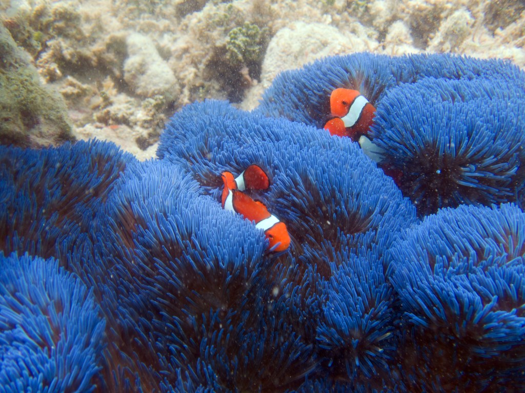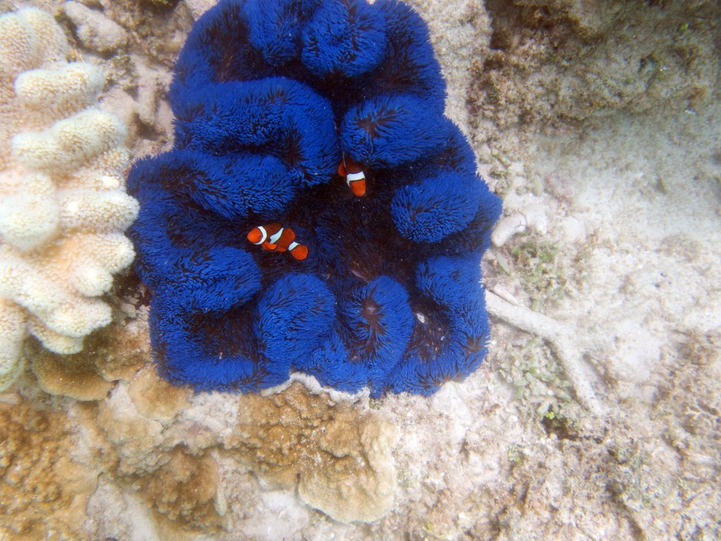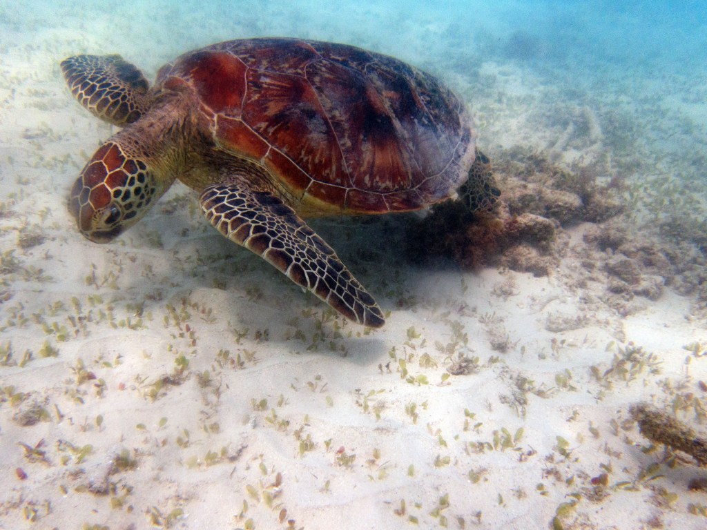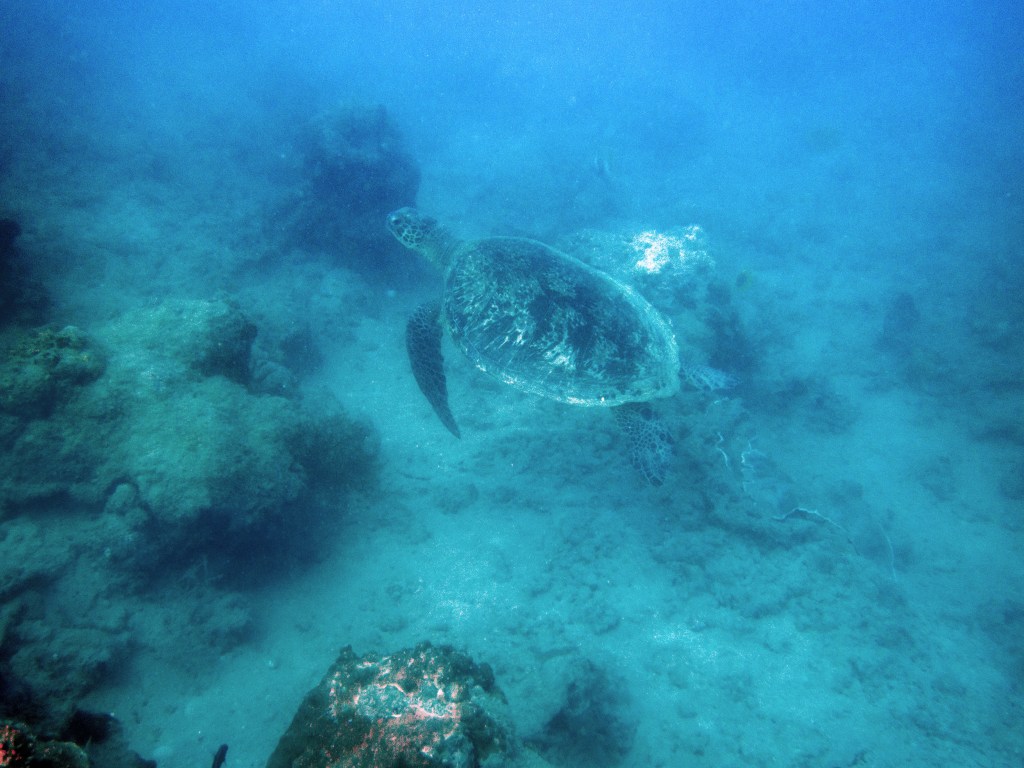 Aujourd’hui nous sommes les seuls plongeurs. Nous avons donc un guide rien que pour nous. Pendant que les autres partent pour un safari snorkeling, nous nous équipons pour notre plongée. Une fois dans l’eau, notre guide nous montre de minuscules poissons que nous n’aurions jamais découverts autrement, ainsi que de très petits nudibranches. D’énormes tortues de mer se reposent contre les récifs, malheureusement dès qu’elles nous aperçoivent, elles partent au loin. Nous nageons parmi les coraux et nous émerveillons.