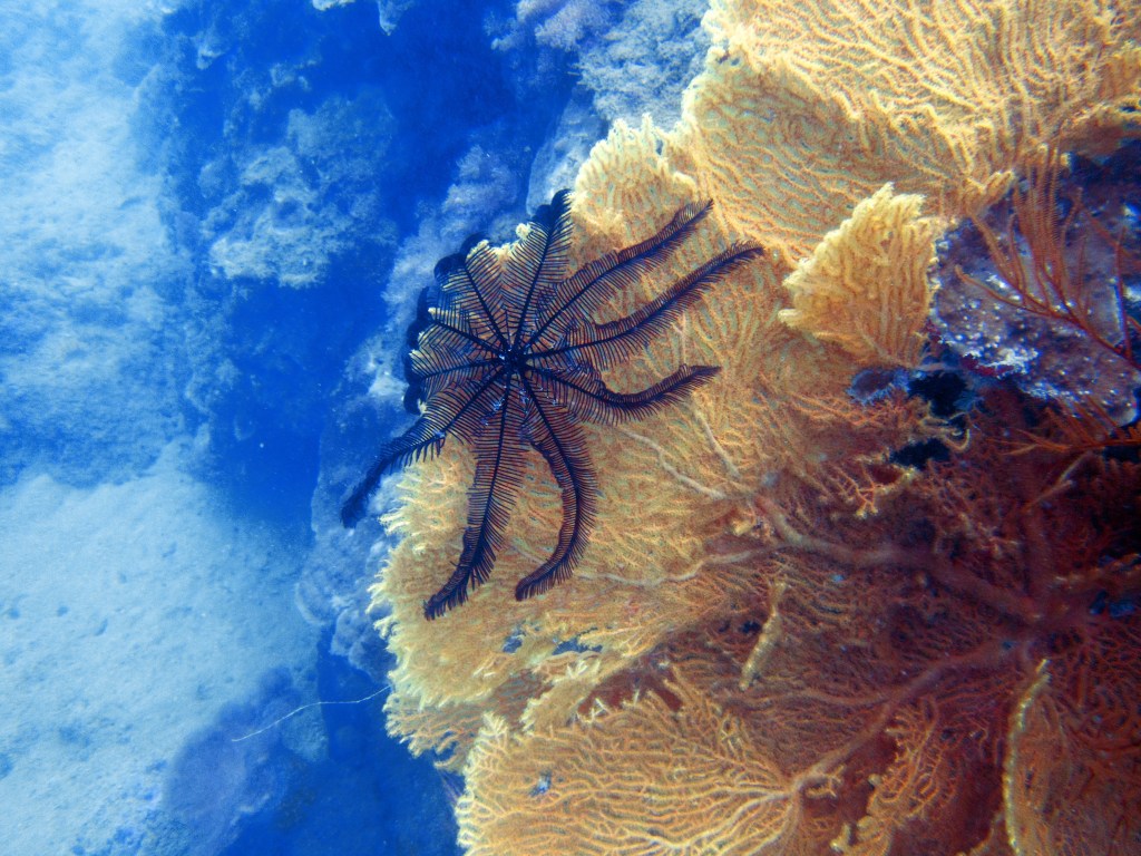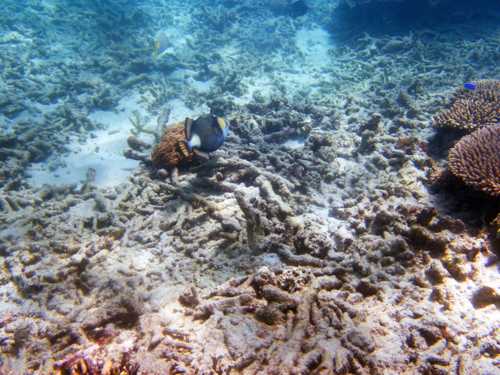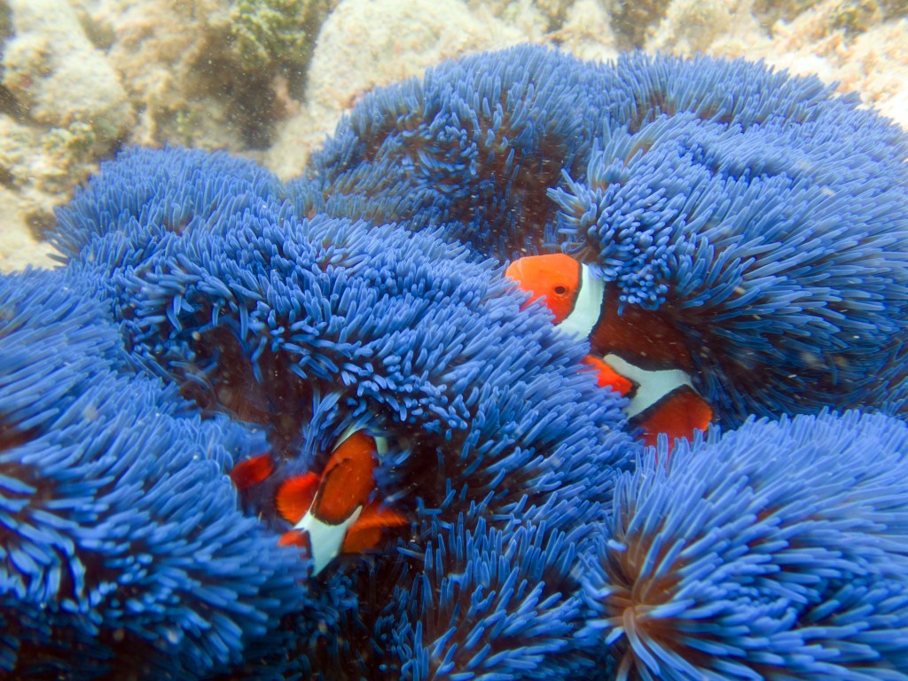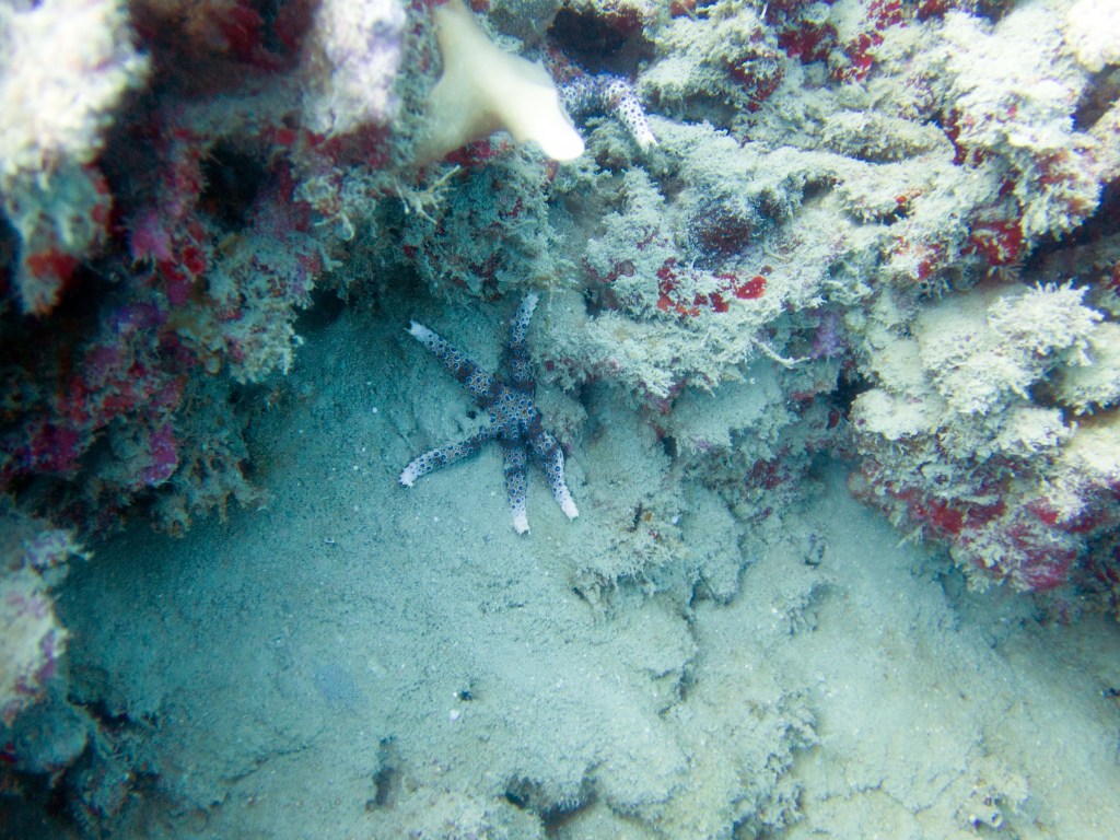 Aujourd’hui nous sommes les seuls plongeurs. Nous avons donc un guide rien que pour nous. Pendant que les autres partent pour un safari snorkeling, nous nous équipons pour notre plongée. Une fois dans l’eau, notre guide nous montre de minuscules poissons que nous n’aurions jamais découverts autrement, ainsi que de très petits nudibranches. D’énormes tortues de mer se reposent contre les récifs, malheureusement dès qu’elles nous aperçoivent, elles partent au loin. Nous nageons parmi les coraux et nous émerveillons.