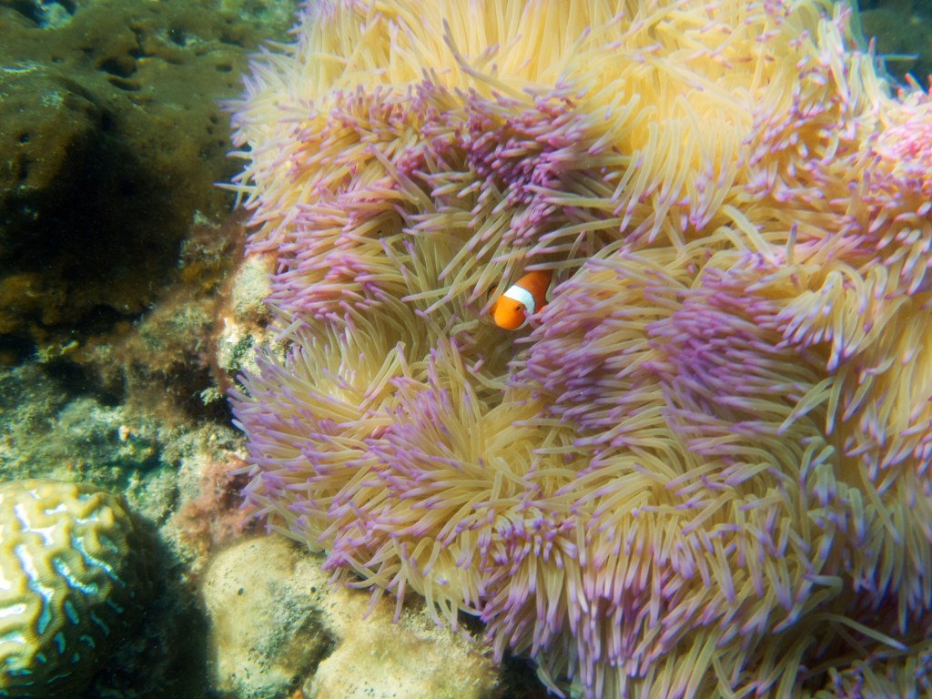 Une fois le soleil de retour, nous réservons quelques activités, tel qu’un tour pour visiter les îles Frankland et y faire un peu de snorkeling et de plongée. Ce jour-là on nous amène jusqu’au bateau accosté le long d’une rivière. Il nous suffit ensuite d’une petite heure pour rejoindre les îles, qui sont enregistrées comme réserve naturelle donc protégées. En fait la compagnie avec laquelle nous sommes est la seule autorisée à y amener des visiteurs. Nous commençons tout d’abord par du snorkeling. Notre guide, docteur en biologie marine, nous montre les coins à observer et nous explique ce qu’il faut voir et pourquoi nous les voyons. Nous croisons plein de poissons perroquets, de poissons ange et j’en passe. Magnifiques poissons clown dans une anémone bleue ! Superbes photos. Et nous voyons enfin nos premières tortues !!! 🙂 Quel spectacle fantastique ! Elles se laissent porter par le courant et nagent gentiment. C’est très reposant de les regarder faire.