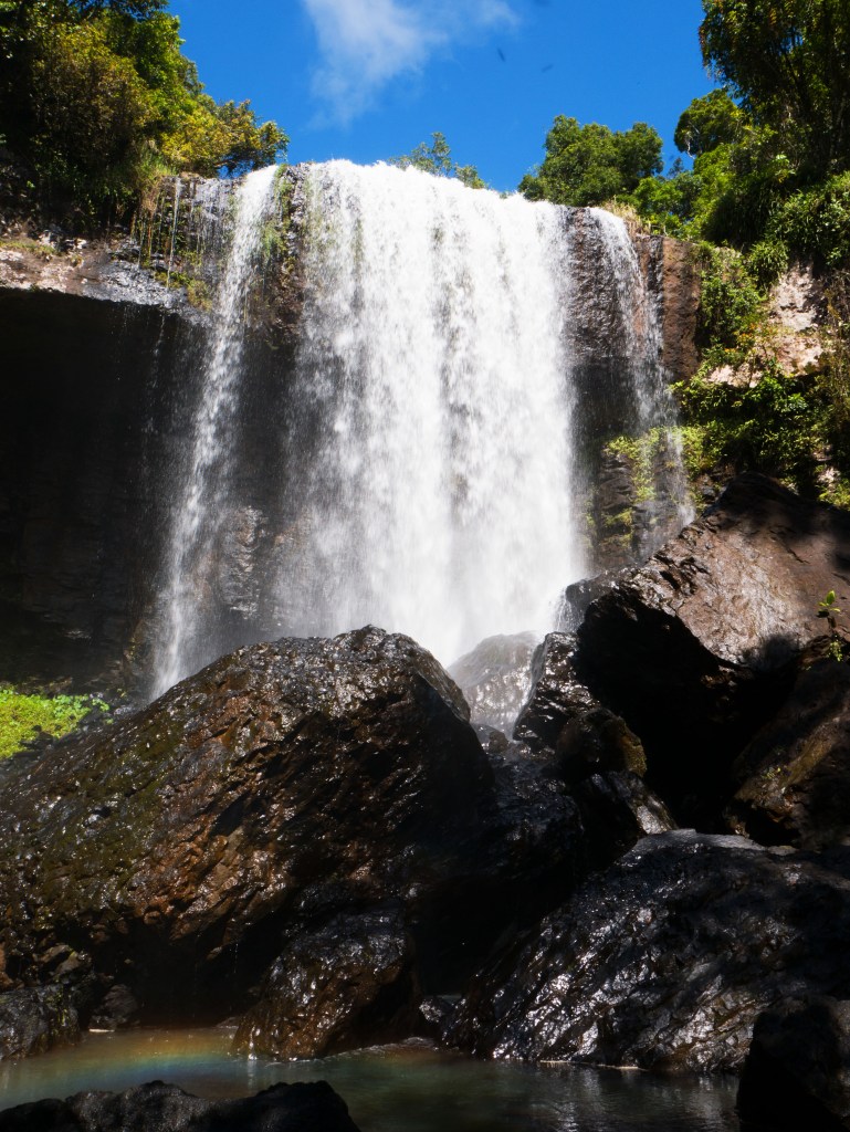 Une fois arrivés à destination, nous débutons notre marche et espérons voir un autre de ces oiseaux durant le trajet. Manque de chance nous n’en croisons pas ce jour-là, mais les 2 chutes d’eau sont tout de même pas mal. Par contre tout le long du chemin, des taons nous dévorent ce qui nous empêche de faire la moindre pause. Nous sommes donc contents de finalement retrouver le van.