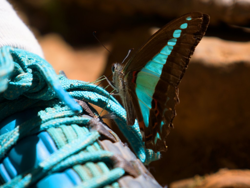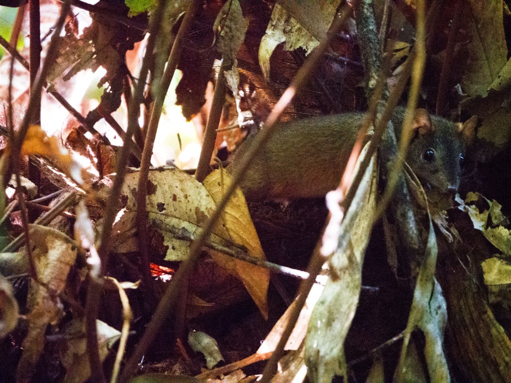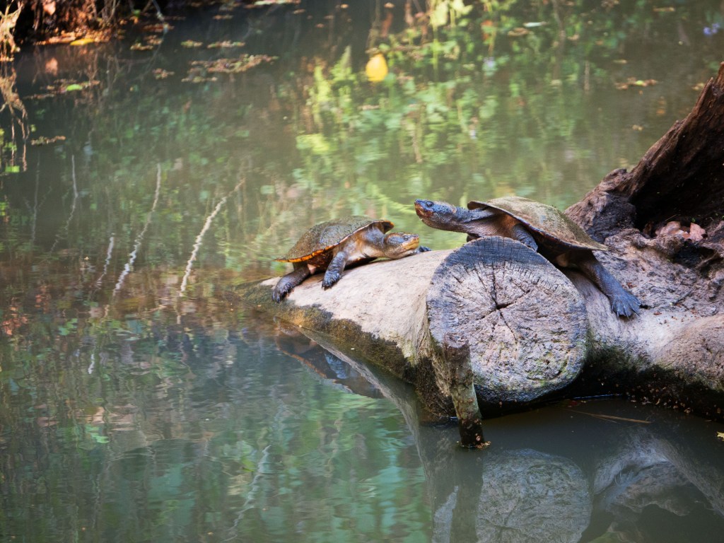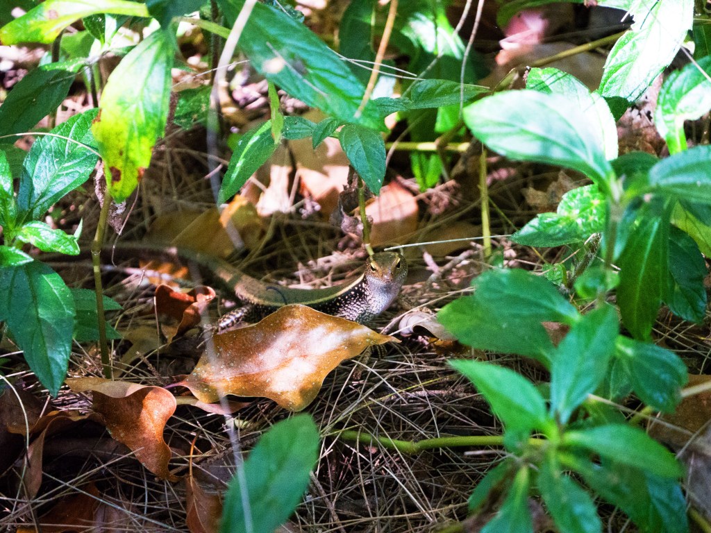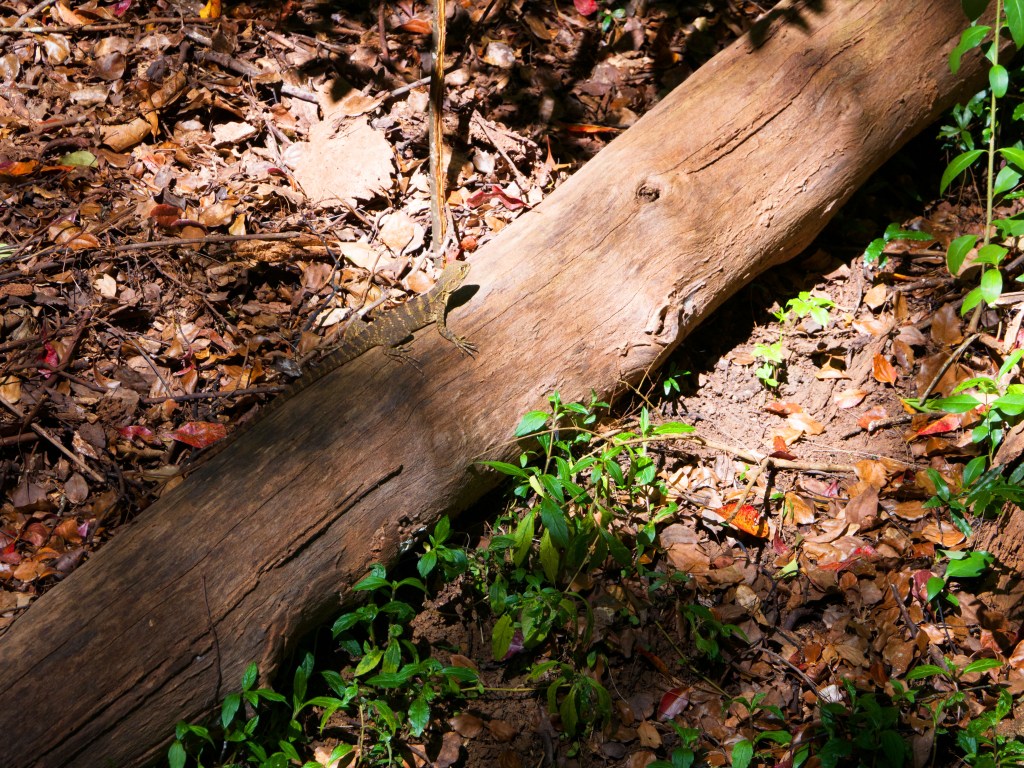 Nous décidons ensuite de continuer notre promenade et d’essayer d’en apercevoir d’autres plus loin. Alors que nous retrouvons le chemin principal, je fais un bond en voyant un serpent de couleur brunâtre se faufiler dans ma direction. Je saute de côté et Yann, juste derrière, le voit passer entre ses jambes. Il nous a bien fait peur celui-là. Apparemment si vous êtes « chanceux » vous pouvez en croisez quelqu’un dans le coin. Nous pensons après recherche qu’il s’agissait d’un python des eaux, donc inoffensif. Mais pas sûrs à 100%. Nous croisons également d’autre animaux le long de ce cours d’eau.