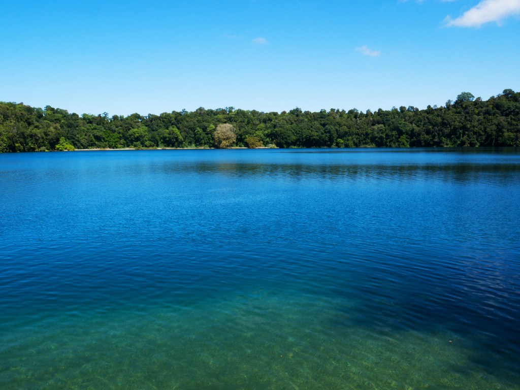 Le camping Malanda falls que nous avons réservé se trouve juste à côté des chutes qui portent le même nom et où l’on peut se baigner. Nous partageons le camping avec plusieurs animaux. On se croirait un peu dans une ferme ^^ Lama, chèvres, poules, lapins et même des poules de soie. Vous pensez bien que les enfants sont au paradis. Pour aujourd’hui nous roulons encore un peu jusqu’aux lacs Barrine et Eacham, des lacs à cratères, dont nous faisons le tour à pied. Nous essayons de repérer la faune régionale. Des Muscat Rat kangaroos vivent dans le coin, les premiers que nous apercevons. Beaucoup plus petits que leur cousin du centre rouge, ils ressemblent plus à de gros rats qui sautillent avec un nez pointu et une queue assez courte. Certains oiseaux que nous rencontrons ont un chant assez particulier. La diversité des oiseaux et leurs chants si différents vont nous manquer une fois de retour au pays. Nous en profitons donc un maximum. Ensuite nous allons boire un verre au tea room du bord du lac qui offre un charmant et relaxant paysage depuis sa terrasse.