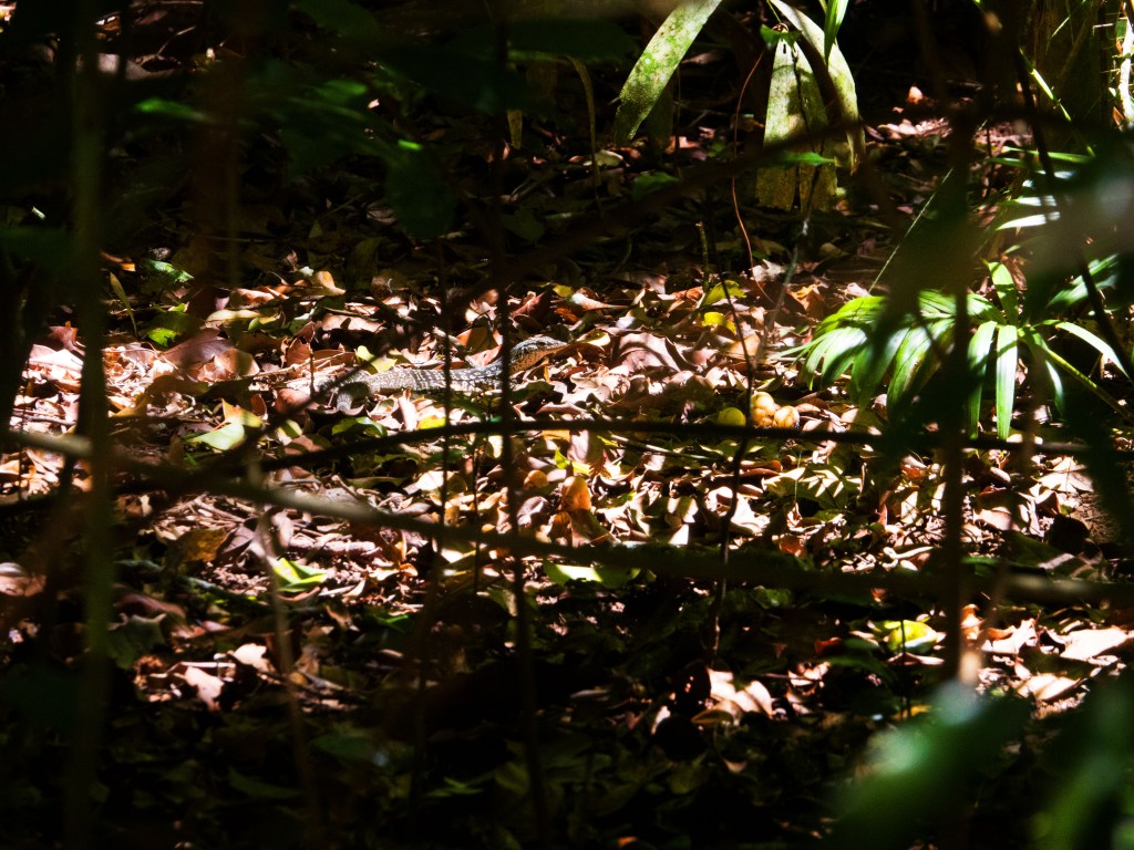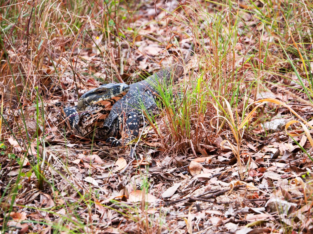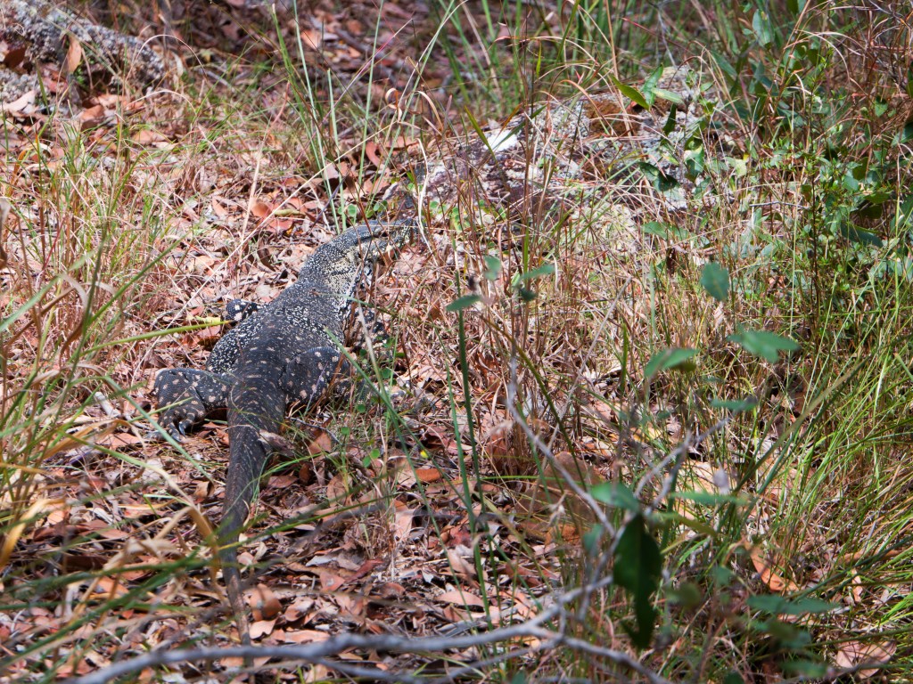 Alors que nous sommes paisiblement en train de marcher nous entendons des bruits de pats, intrigué nous allons regarder de plus prêt de quoi il s’agit. Surprise un énorme varan bigarré.