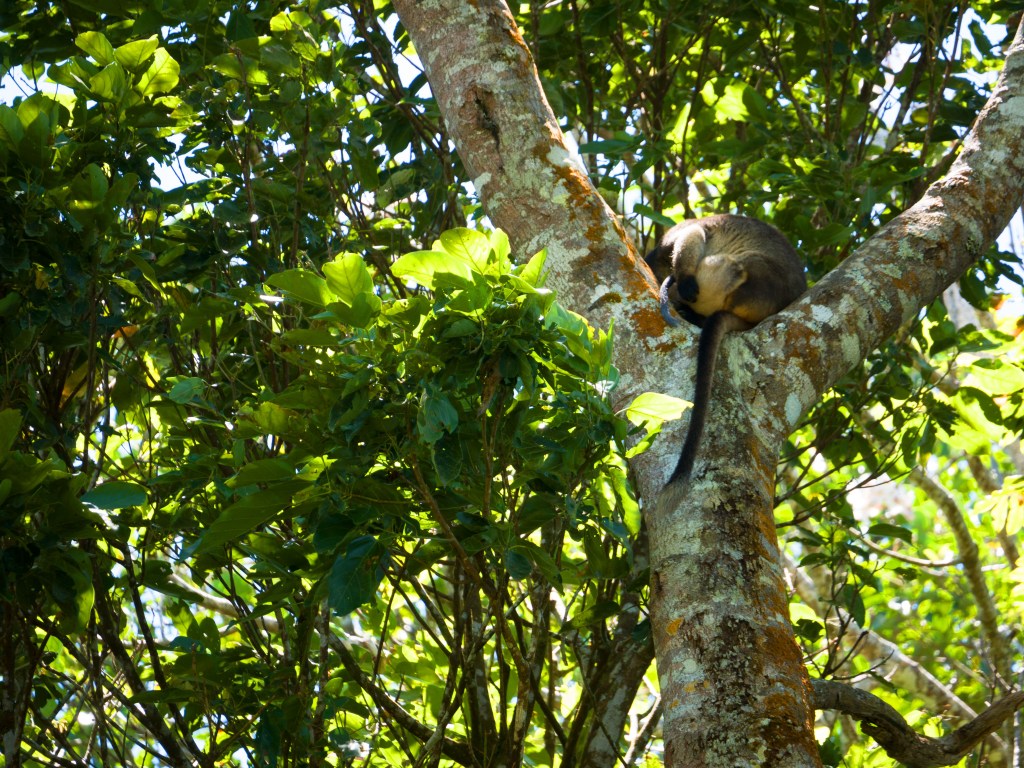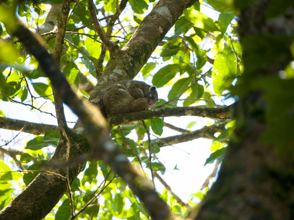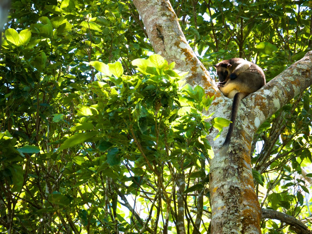 Sur le chemin du retour avec le van, nous faisons une halte au Lamins Hill Lookout pour quelques photos, puis nous nous rendons au Nerada Tea, le centre de production de la célèbre marque de thé australien. Nous profitons de leur café pour manger une morse et tester leurs thés. Alors que nous nous reposons sur la terrasse, nous voyons plusieurs personnes prendre des photos de quelque chose qui se trouve dans les arbres. Nous allons y jeter un coup d’œil et découvrons notre 1er tree kangaroo ! 🙂 Il s’agit d’une maman avec un bébé qui plus est. Adorable ! Comparé aux autres de leur espèce, ces kangourous sont diurnes et vivent dans les arbres comme leur nom l’indique. Nous avons également la chance d’apercevoir un green possum en boule sur l’une des branches. Apparemment, il est plutôt rare de les voir.