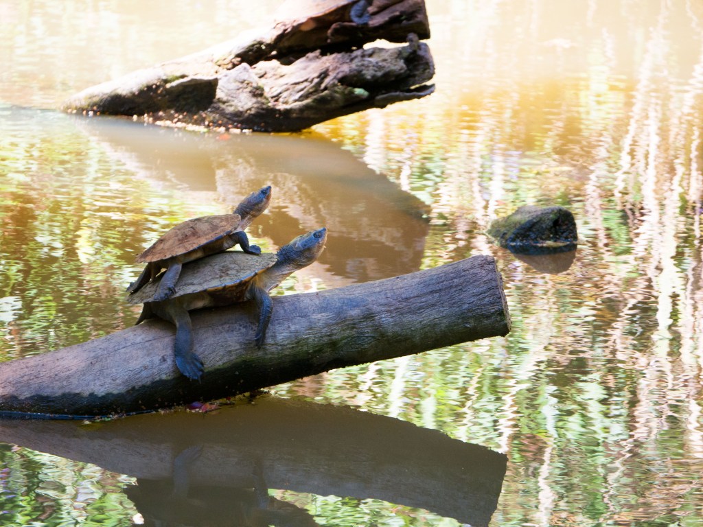 Pour la fin de journée, nous allons à Yungaburra au bord de la rivière pour une marche découverte platypus (ou ornithorynques si vous préférez). Tout en suivant le cours d’eau nous restons attentifs au moindre bruit ou mouvement. Ces animaux sont connus pour devenir un peu plus actifs au lever de soleil et en fin de journée. Nous voyons tout d’abord pas mal de tortues qui se prélassent et profitent du soleil. Soudainement quelque chose bouge dans l’eau… notre premier ornithorynque ! Il replonge aussitôt. Nous suivons gentiment les bulles à la surface et le revoyons 30 secondes plus tard à nouveau ! Tellement mignon !!! Nous passons un moment à le suivre pour le prendre en photo alors qu’il longe la berge de la rivière. Ils sont difficiles a photographier, car ils sont tout le temps en mouvements et ne reste que quelques secondes à la surface avant de replonger.
