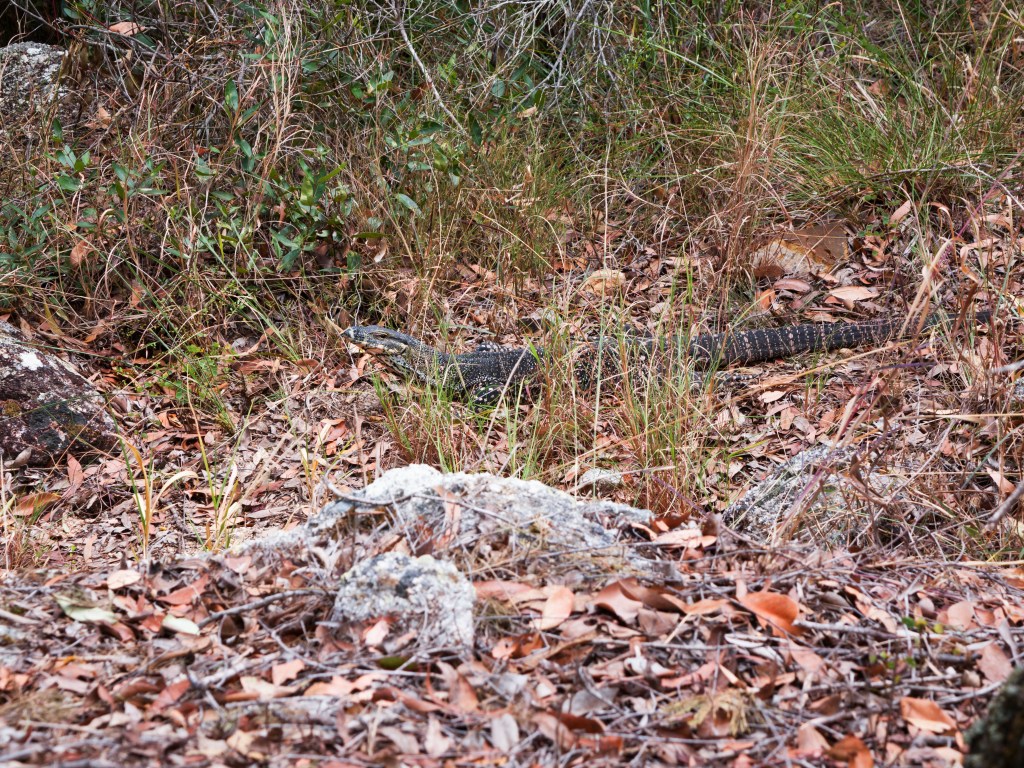 Cette espèce de varan atteint 2 mètres de long voir plus d’ailleurs il ne devait pas être bien loin de cette taille. Alors que nous l’observons celui-ci reste immobile, mais à peine que nous nous éloignons il reprend ça marche avant de disparaitre dans la végétation.