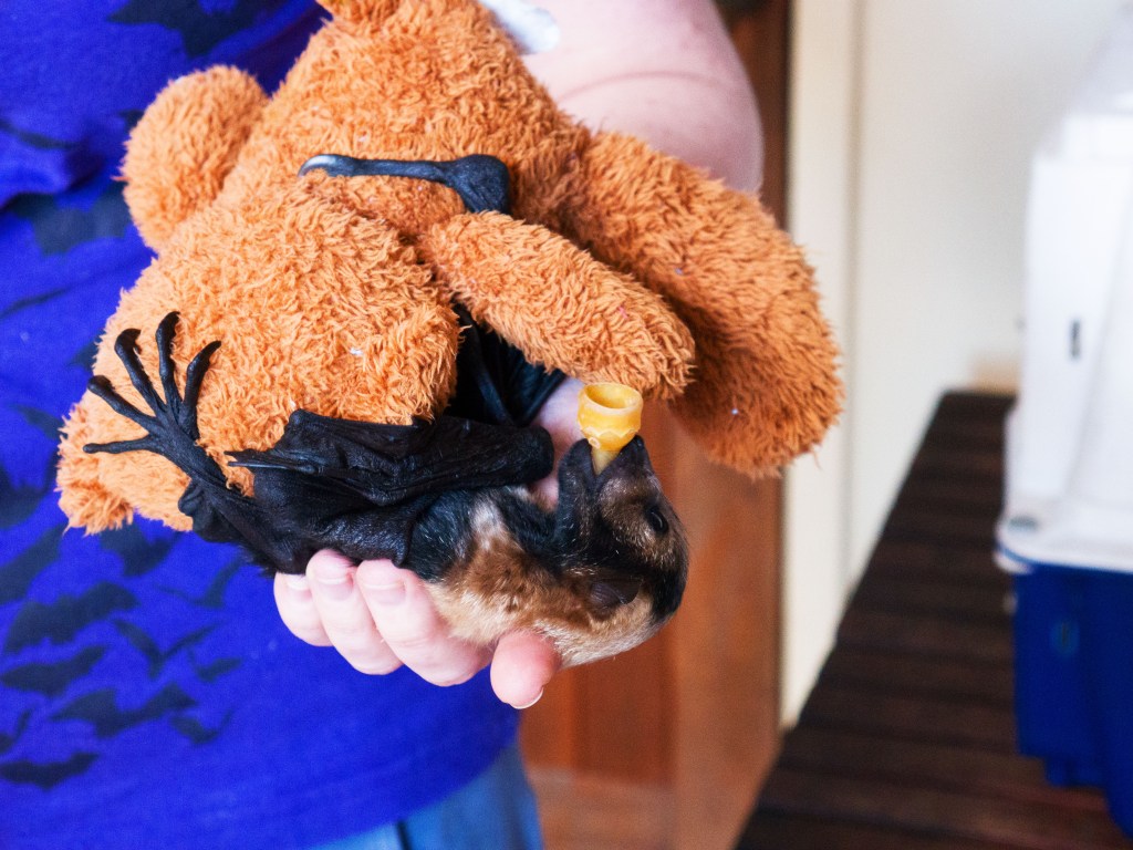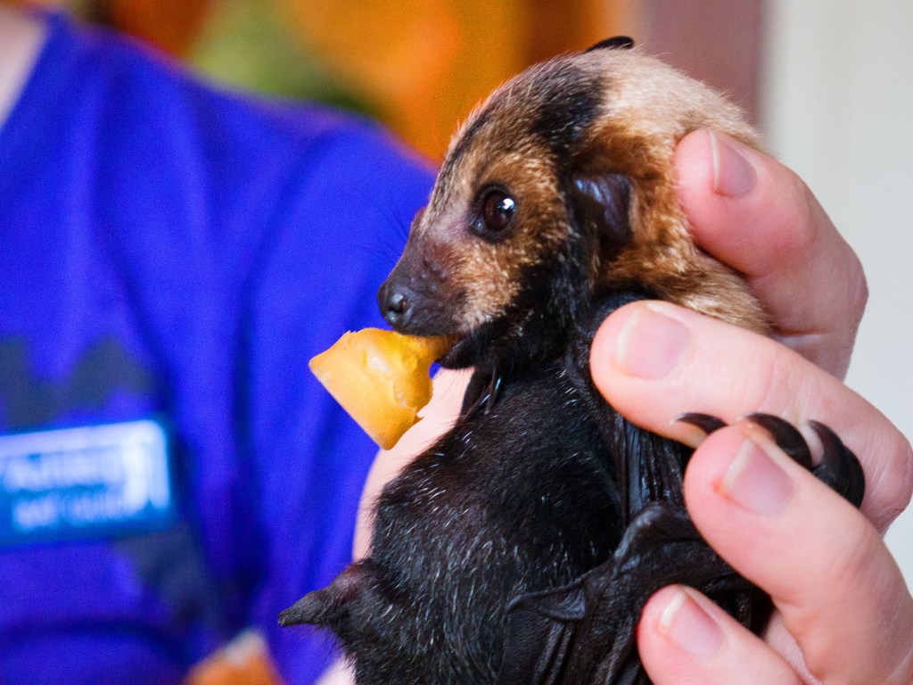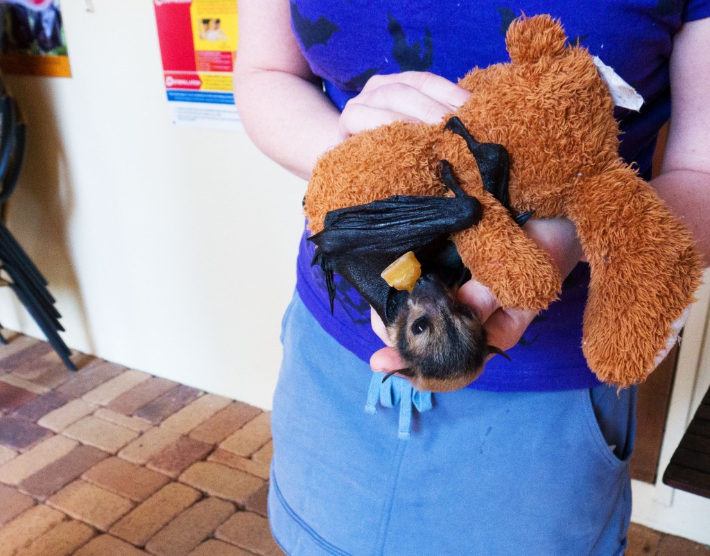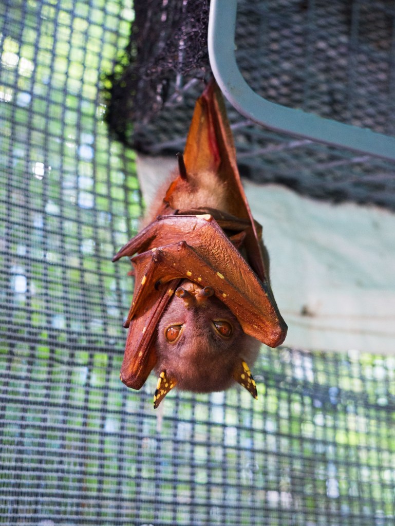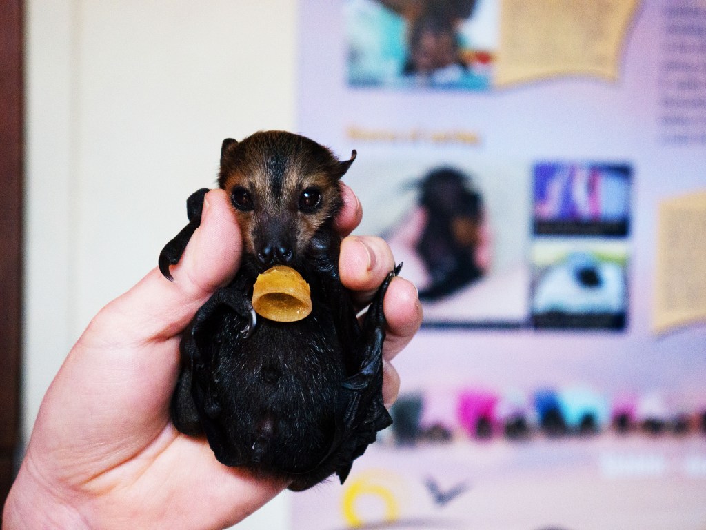 L’équipe nous présente également les microbats, qui peuvent avoir un régime très varié selon les espèces (poisson, graines, insectes, etc.). Vers la fin de la visite, nous avons la chance de voir un bébé flyng fox qui a malheureusement perdu sa maman. Les bénévoles s’en occupent jour et nuit afin de pouvoir le remettre en liberté. Pour ne pas se sentir stressés, les bébés reçoivent une tétine qui leur rappel leur mère ainsi qu’une peluche à agripper, comme ils le feraient en temps normal avec leur maman. Leurs mains sont impressionnantes d’ailleurs ^^ Mais le plus mignon est leur petit bidon redondant qu’ils perdront gentiment avec l’âge. On dirait qu’ils sont gonflés d’air. En tout cas leur bouille est adorable ! 🙂
