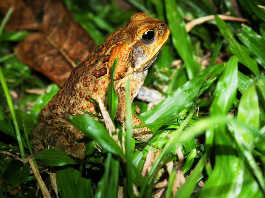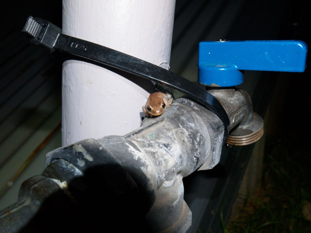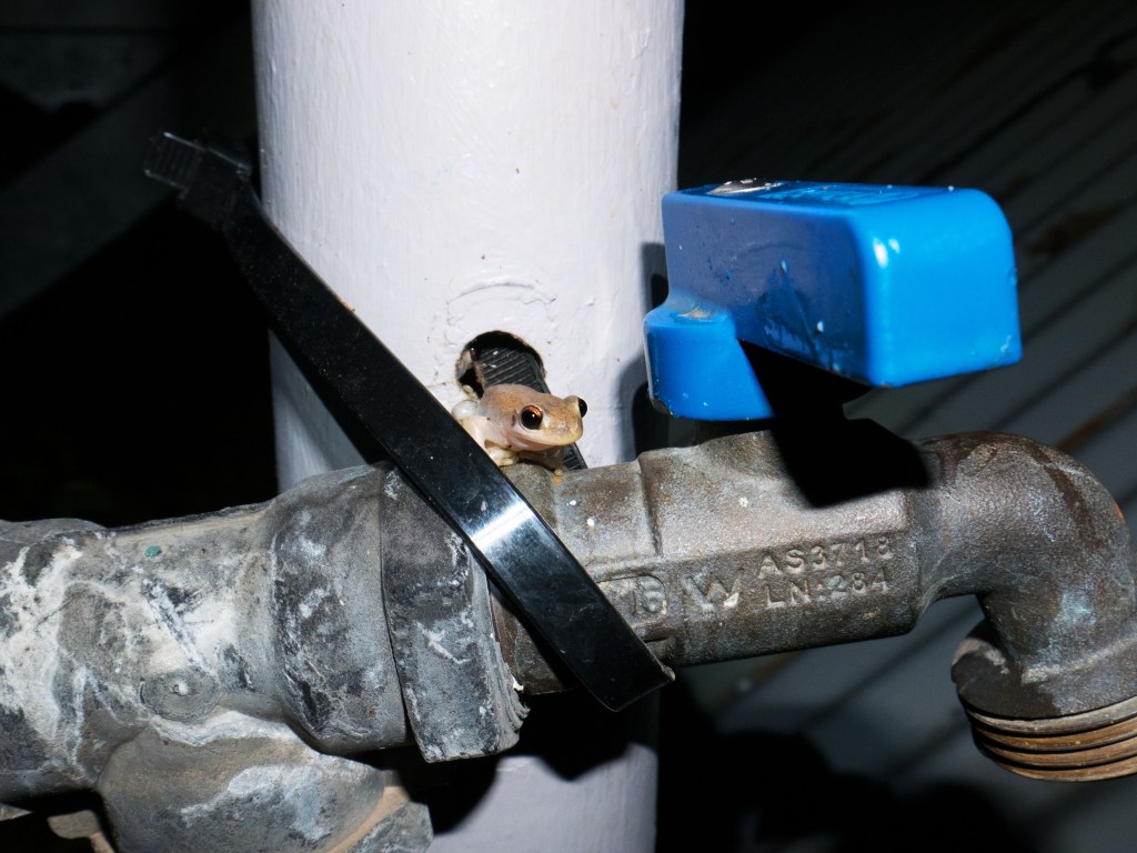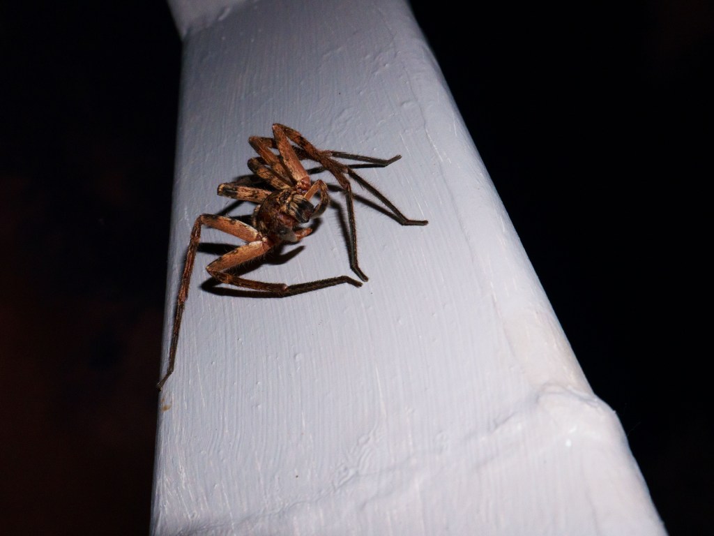 De retour à notre camping alors que la nuit commence à tomber nous entendons divers bruits dans les feuilles mortes qui bordent notre camping. Nous sortons doucement du van pour aller jeter un coup d’œil. Avant même d’arriver vers l’endroit où nous pensons apercevoir des feuilles bouger nous nous faisons surprendre par un crapaud qui nous saute dessus. Nous entendons à nouveau du bruit, le voilà ! Un énorme bandicoot chasse des insectes dans les parages 🙂 Alors que je retourne au van, Natacha me demande d’aller remplir la bouillard. Tandis que je pose ma main sur le robinet, deux petites grenouilles se trouvent à quelques centimètres. Je suis en train de les prendre en photo quant je vois quelques choses de gros et poilu à huit pattes sur la barrière juste en face de moi.
