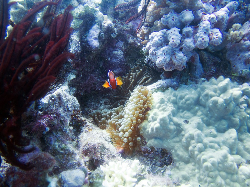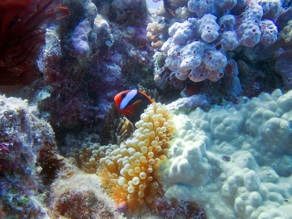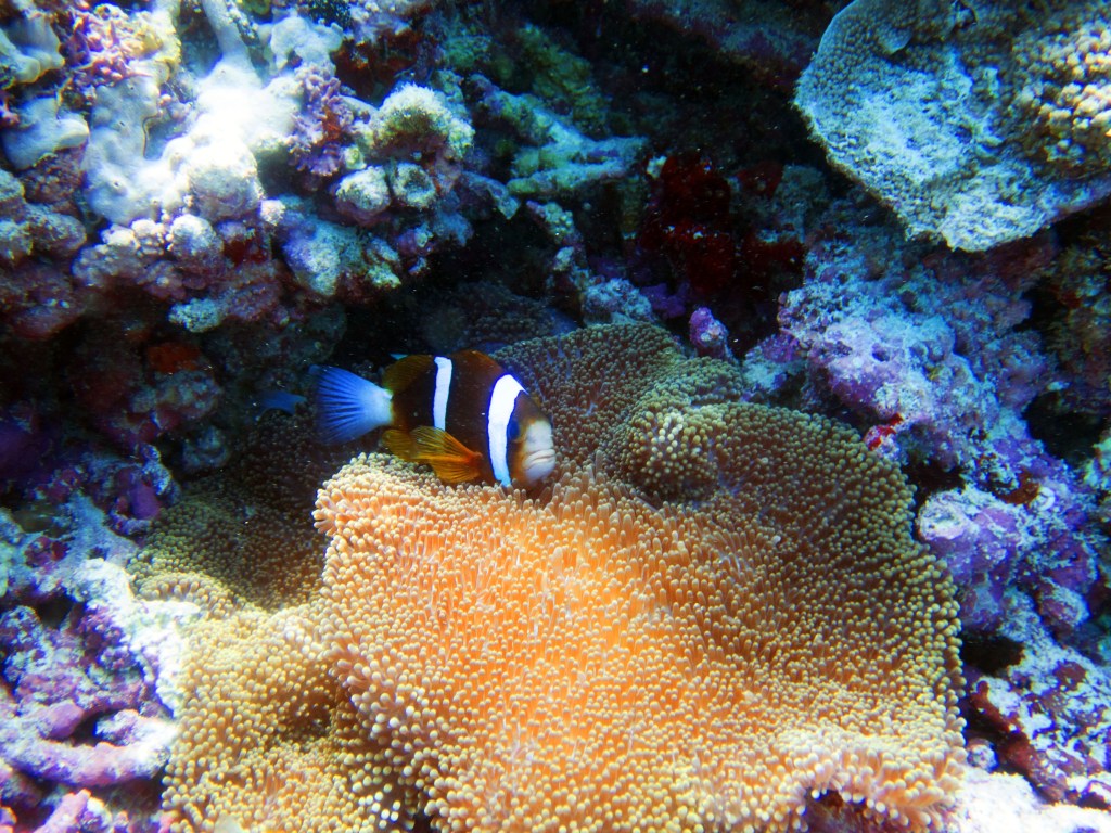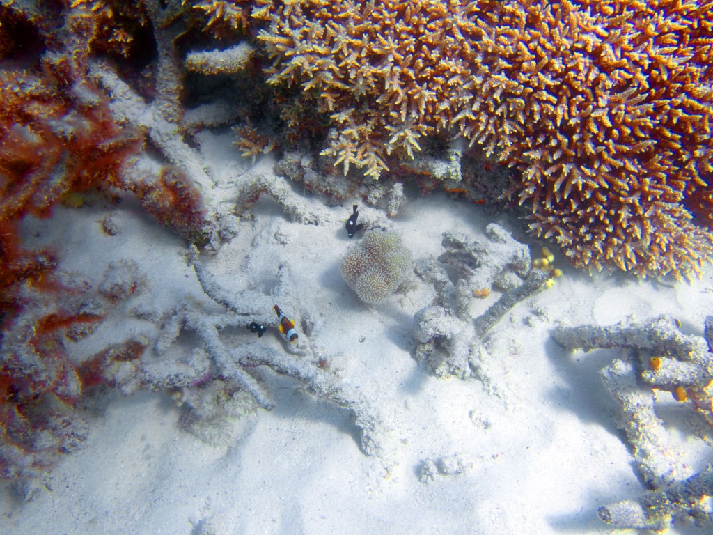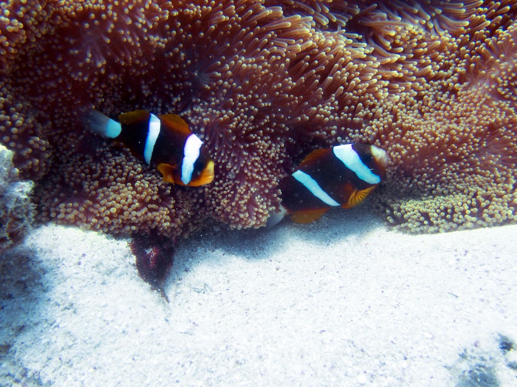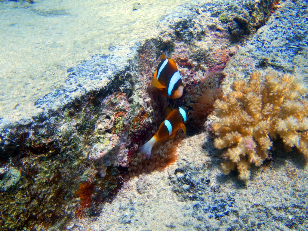 Nous croisons également pour la première fois des « Demoiselles domino » qui partage une anémone avec un poisson clown. Nous voyons également quelques Dory, murènes, nudibranches et plein d’autres. Arrivés à la fin de notre plongée, nous apercevons un minuscule poisson clown à collier. L’anémone dans lequel il vie n’est pas plus grande qu’une mandarine, je vous laisse imaginer la taille qu’il fait.