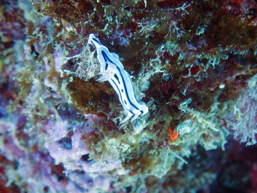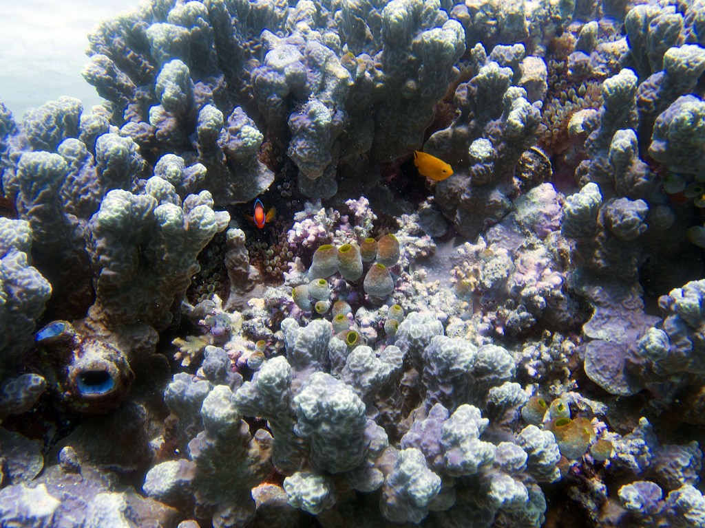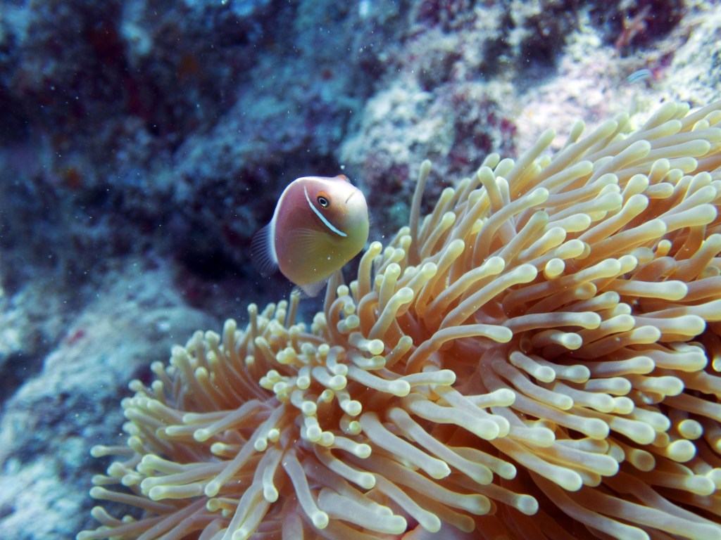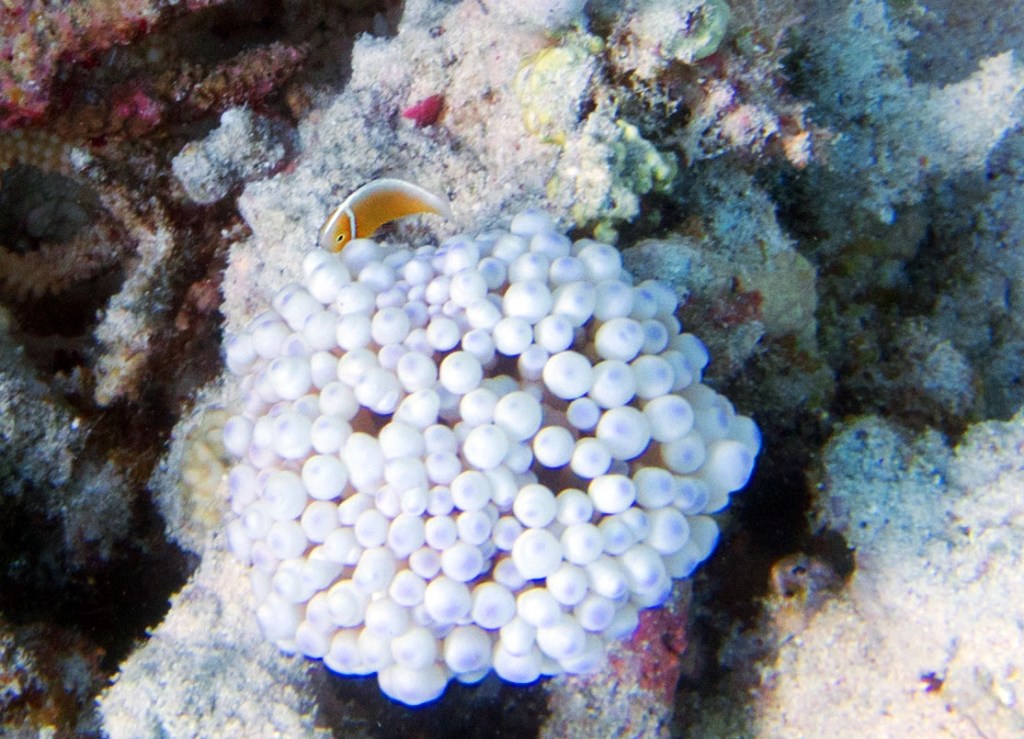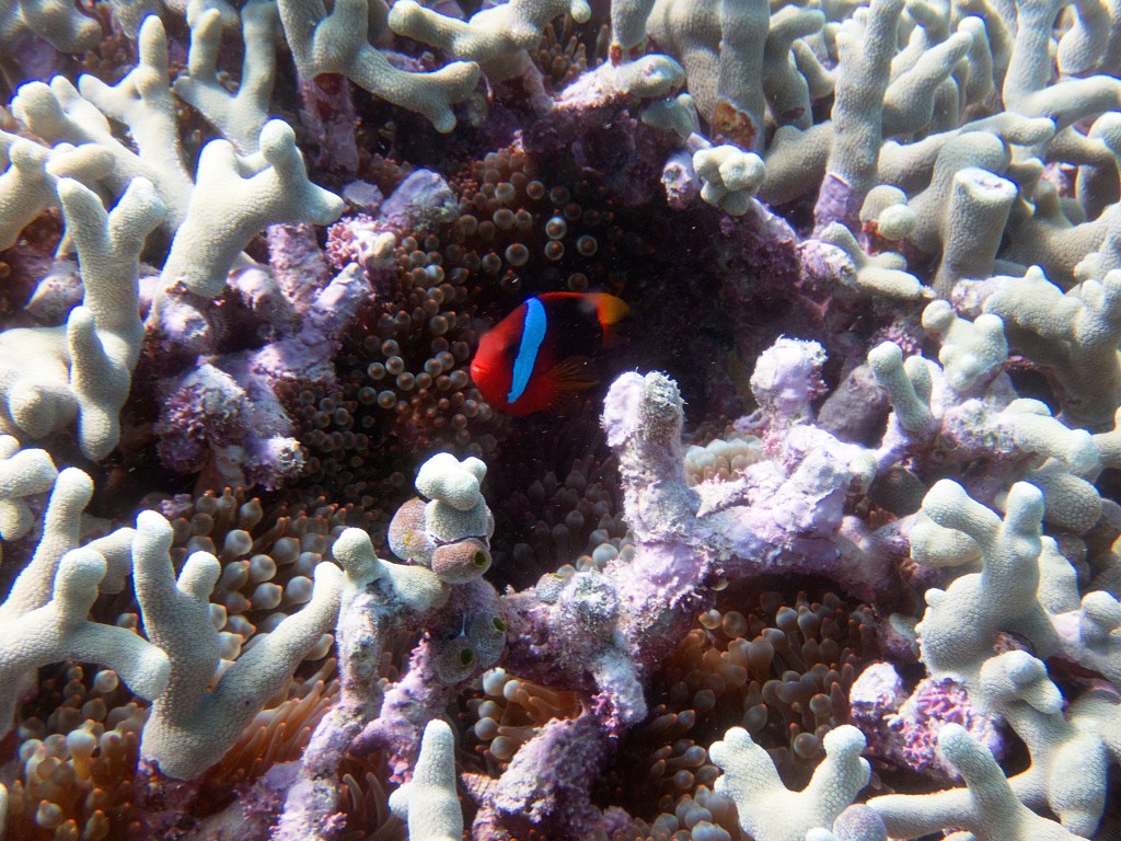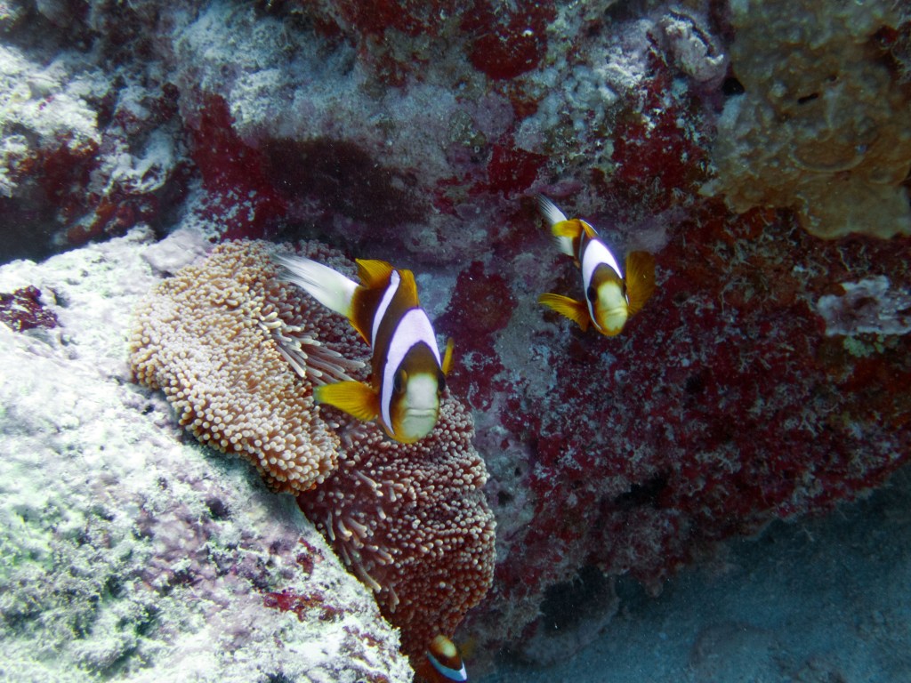 Nous croisons également pour la première fois des « Demoiselles domino » qui partage une anémone avec un poisson clown. Nous voyons également quelques Dory, murènes, nudibranches et plein d’autres. Arrivés à la fin de notre plongée, nous apercevons un minuscule poisson clown à collier. L’anémone dans lequel il vie n’est pas plus grande qu’une mandarine, je vous laisse imaginer la taille qu’il fait.