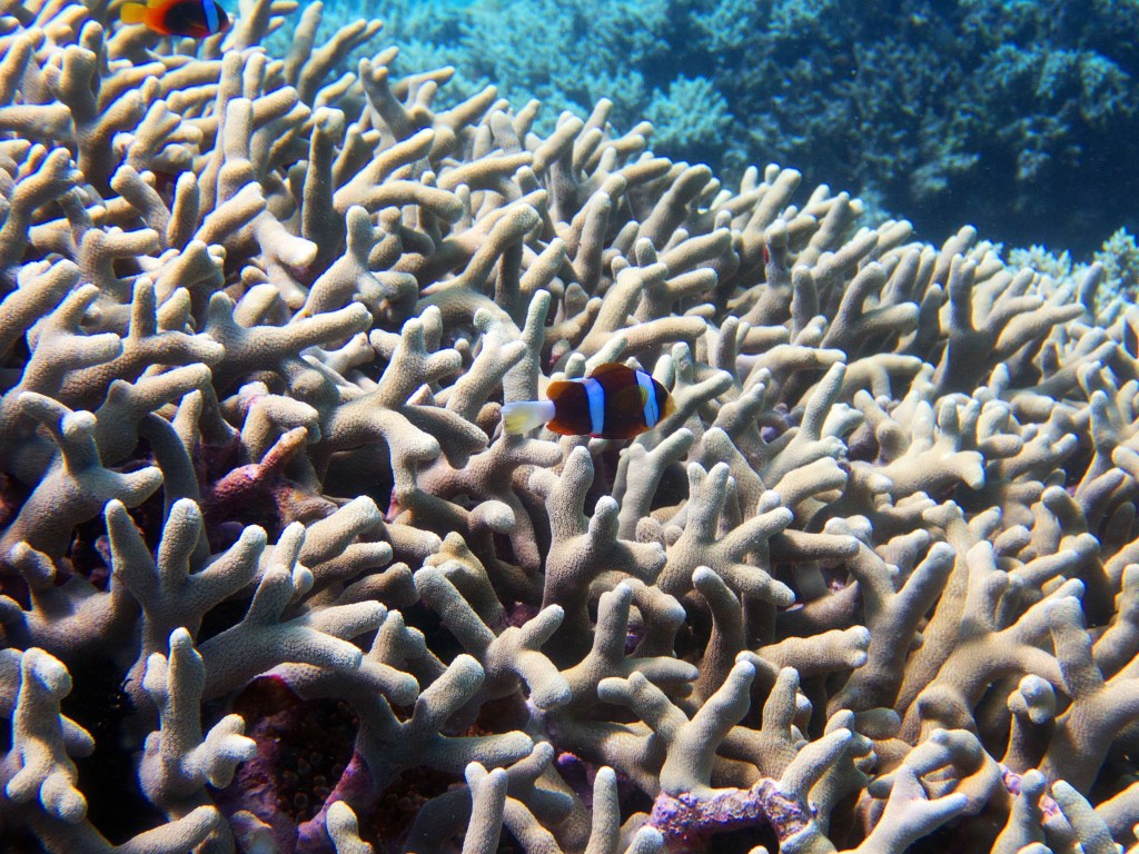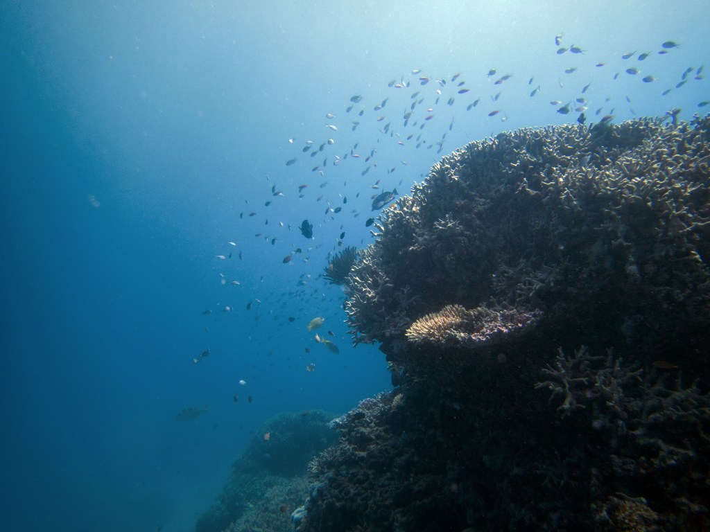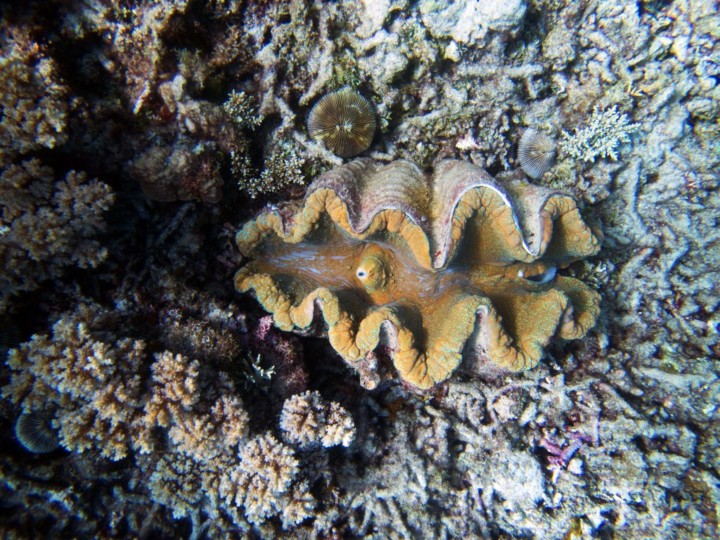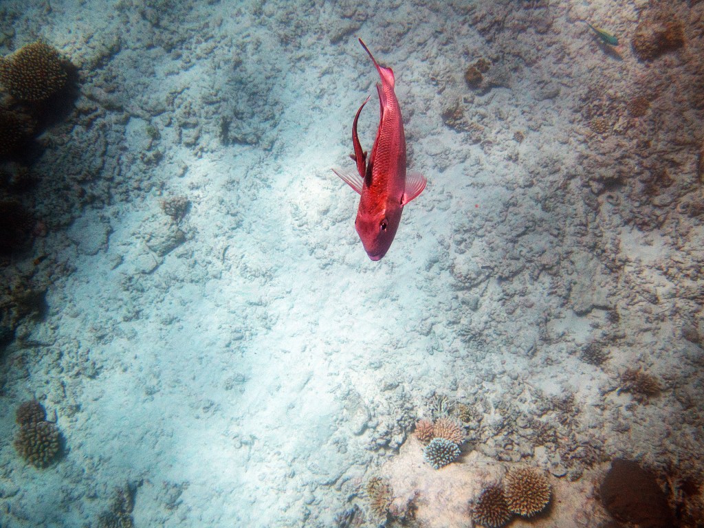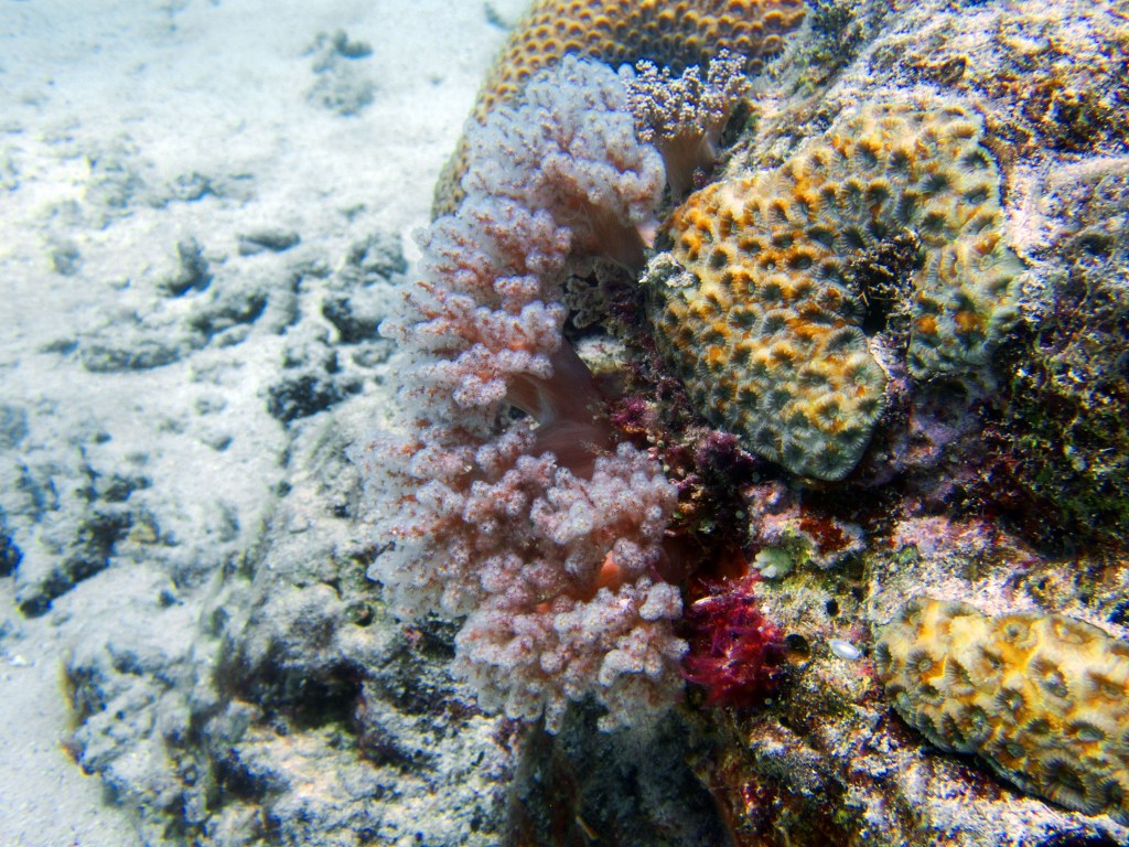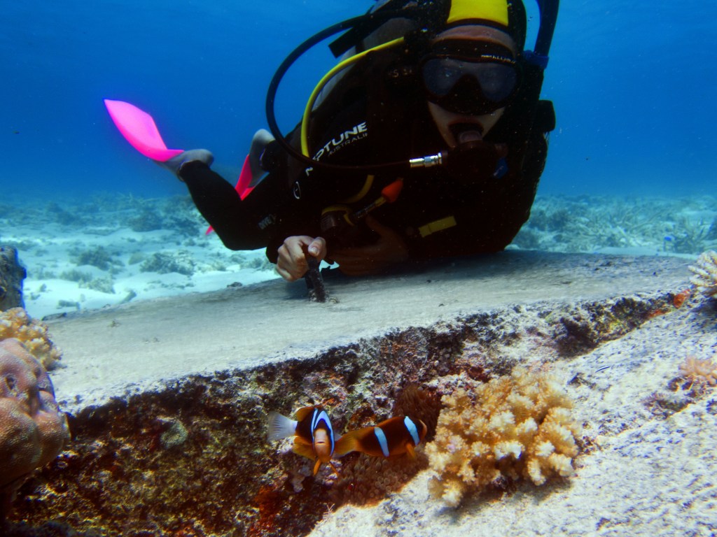 Nous croisons également pour la première fois des « Demoiselles domino » qui partage une anémone avec un poisson clown. Nous voyons également quelques Dory, murènes, nudibranches et plein d’autres. Arrivés à la fin de notre plongée, nous apercevons un minuscule poisson clown à collier. L’anémone dans lequel il vie n’est pas plus grande qu’une mandarine, je vous laisse imaginer la taille qu’il fait.