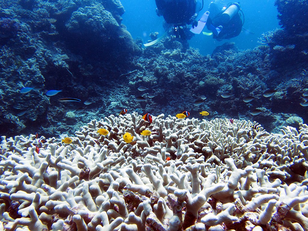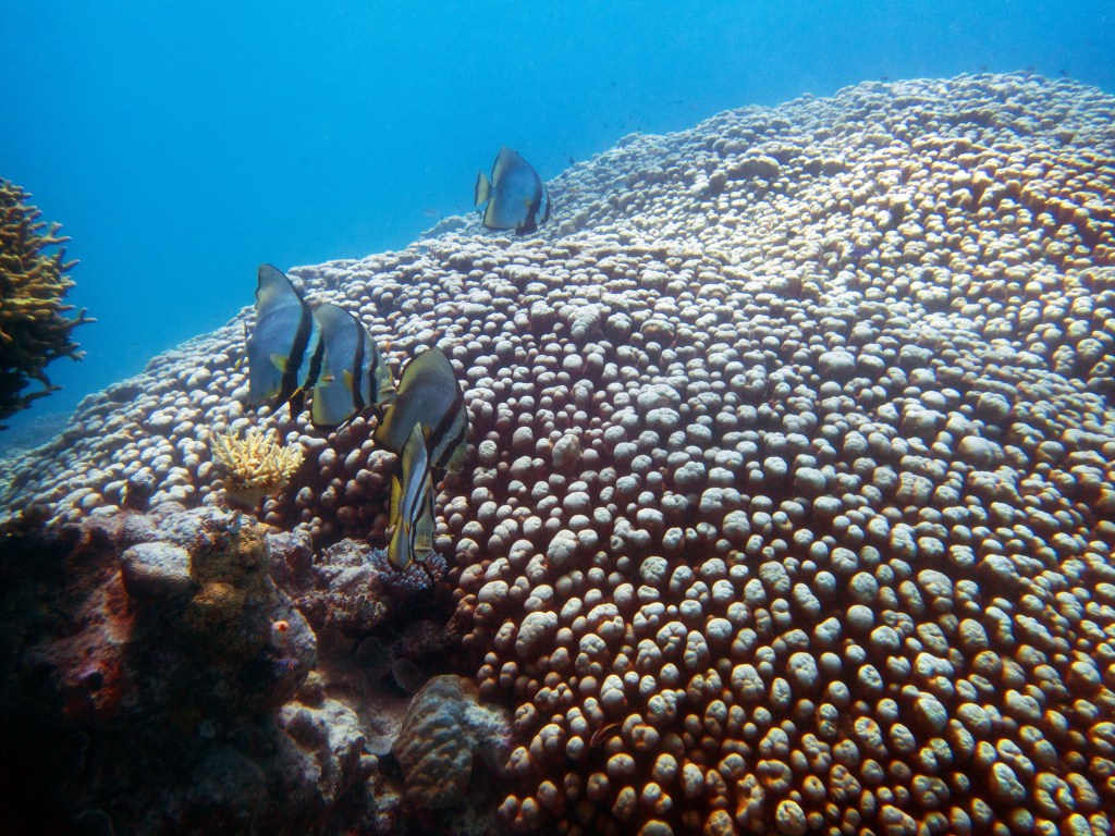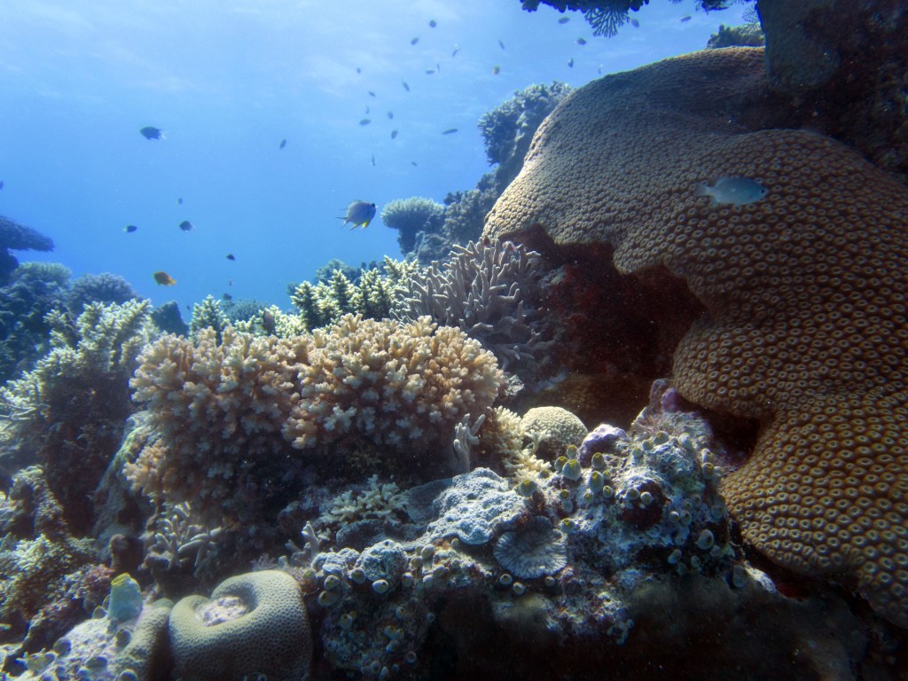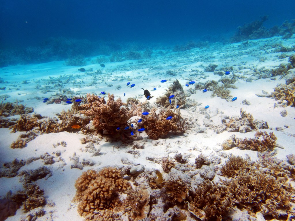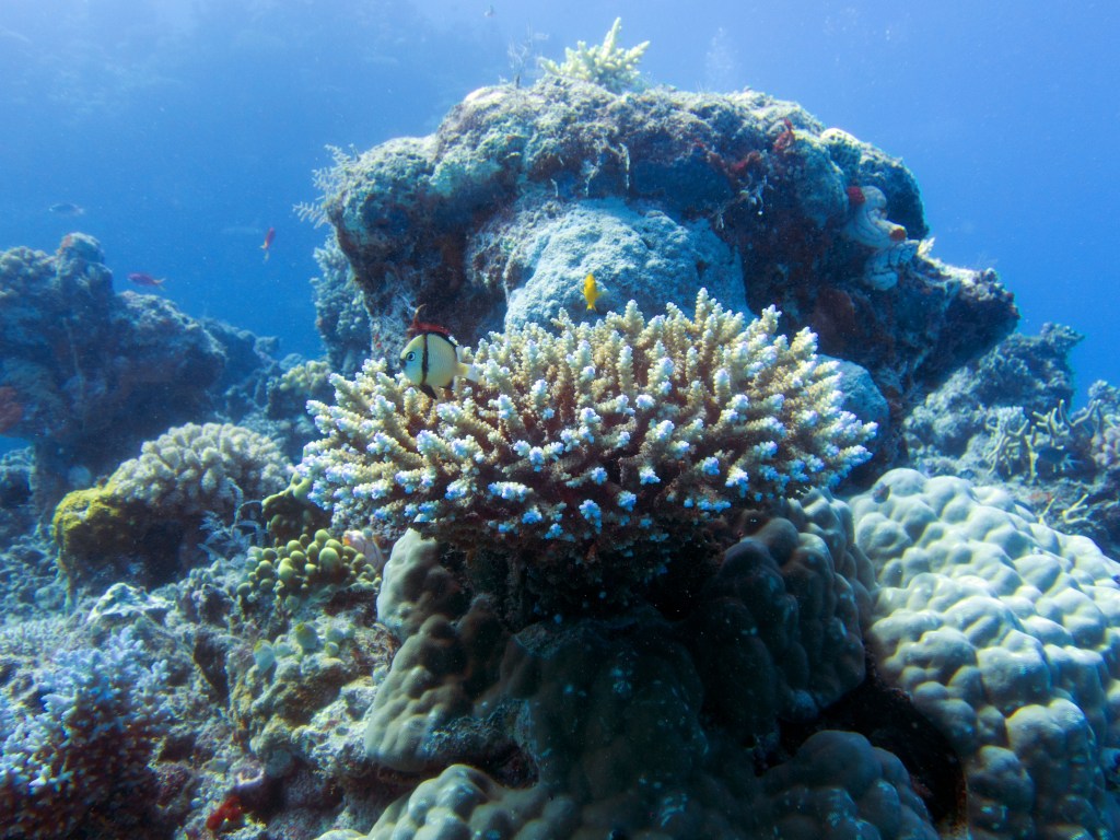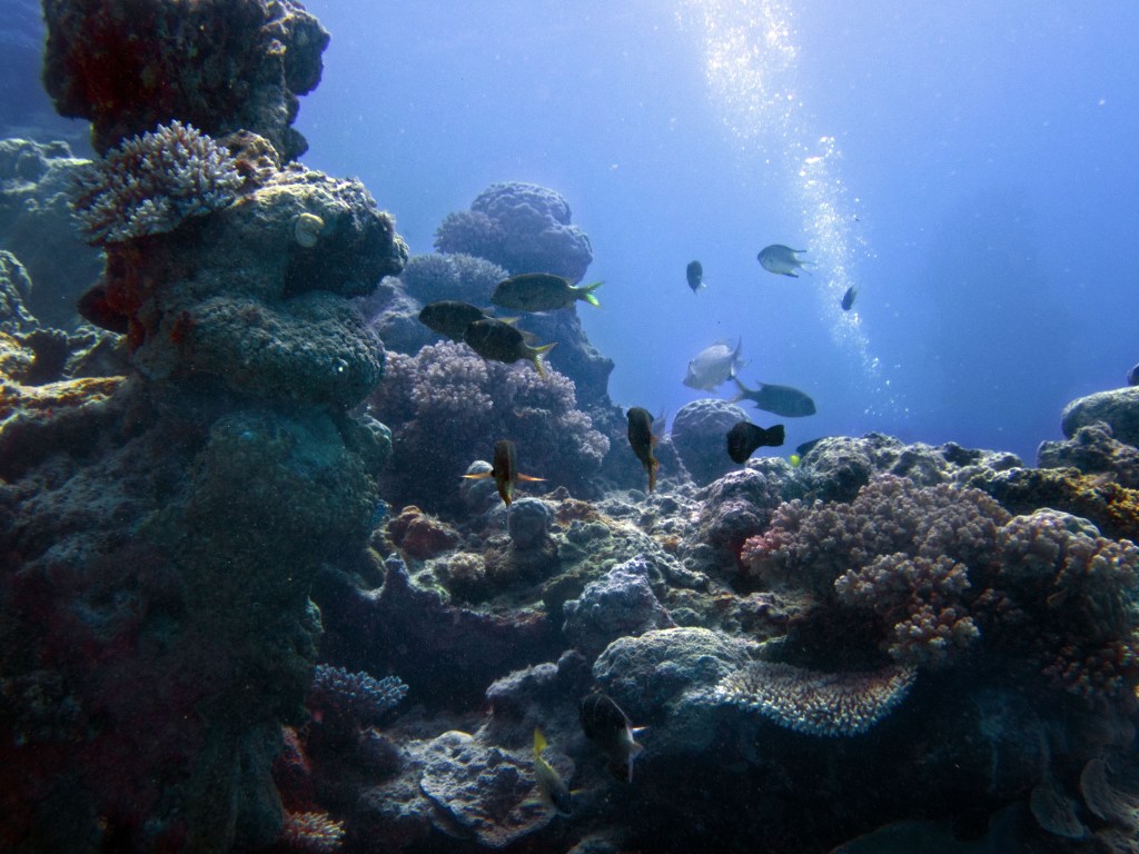 Nous croisons également pour la première fois des « Demoiselles domino » qui partage une anémone avec un poisson clown. Nous voyons également quelques Dory, murènes, nudibranches et plein d’autres. Arrivés à la fin de notre plongée, nous apercevons un minuscule poisson clown à collier. L’anémone dans lequel il vie n’est pas plus grande qu’une mandarine, je vous laisse imaginer la taille qu’il fait.
