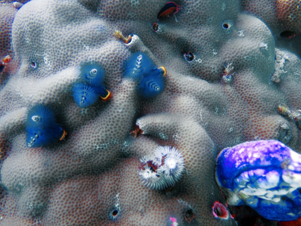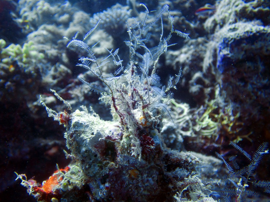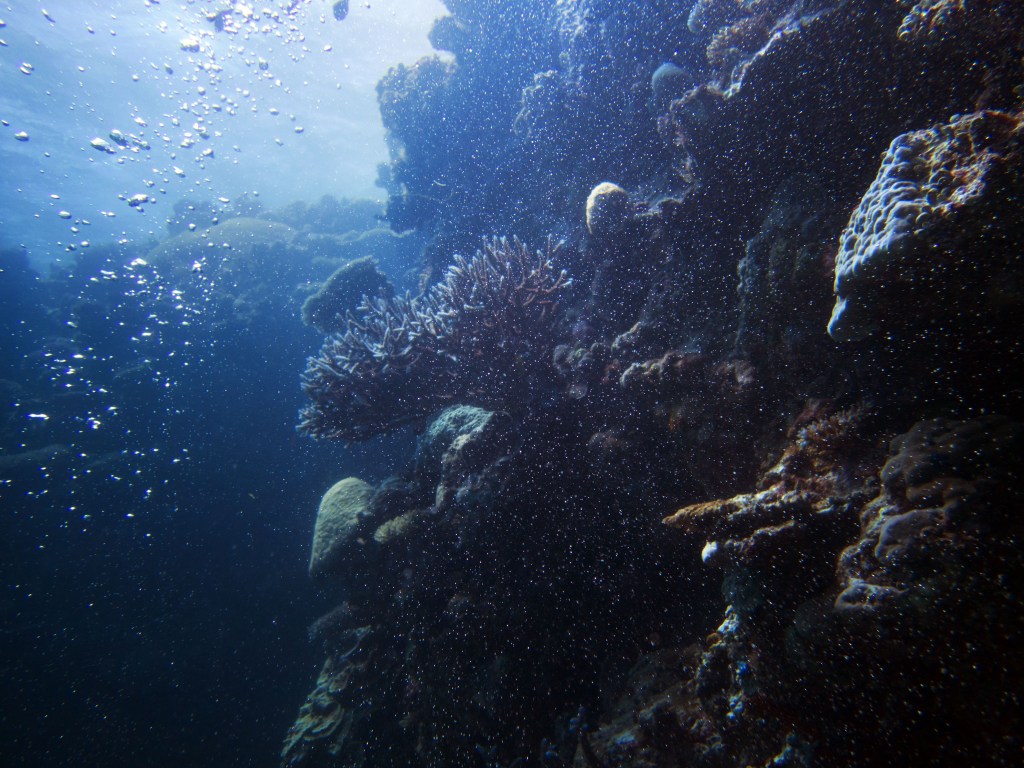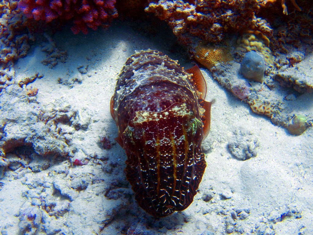 La première plongée que nous effectuons vers un endroit nommé Phills, Nous croisons une énorme quantité de poissons clown. Le récif est en plutôt bonne santé pour dire qu’il a été frappé il y a quelques années par un ouragan qui avait décimé une bonne partie des coraux. Nous croisons également une seiche qui s’empresse de partir à notre arrivée.