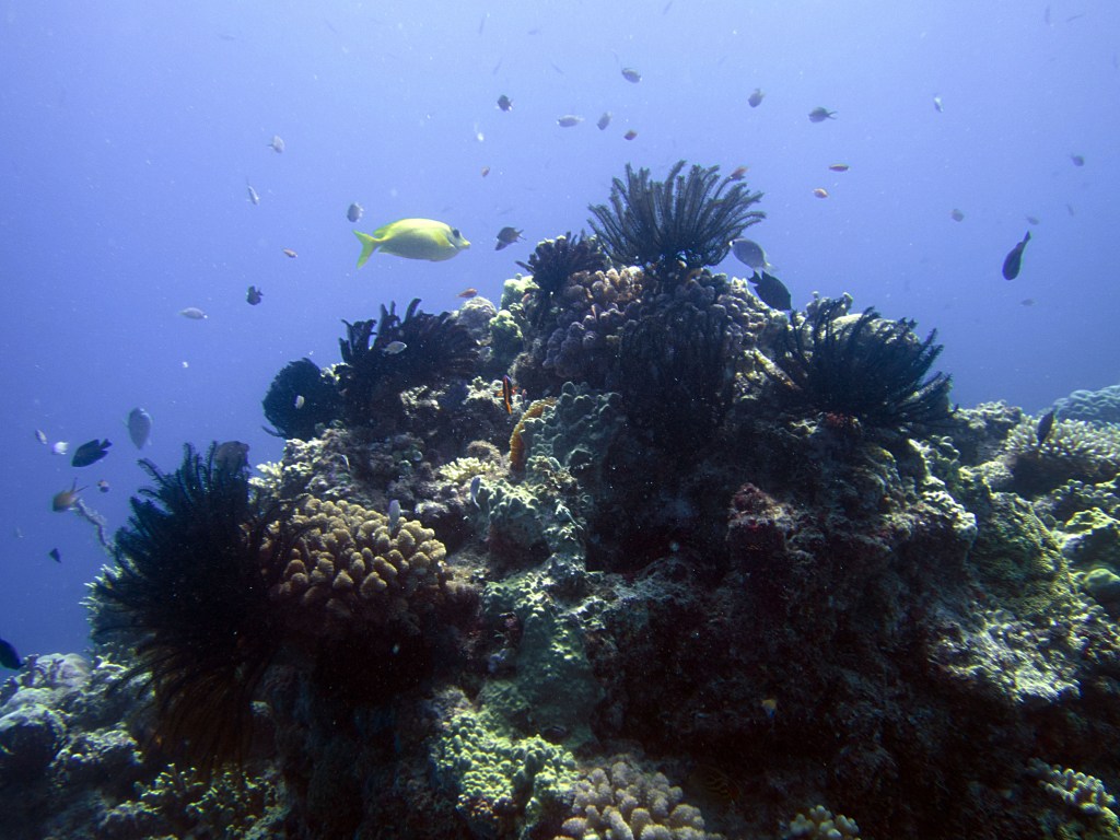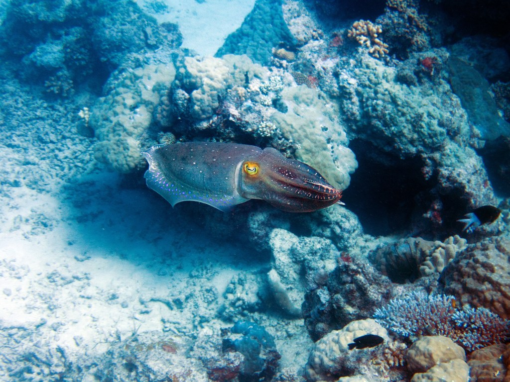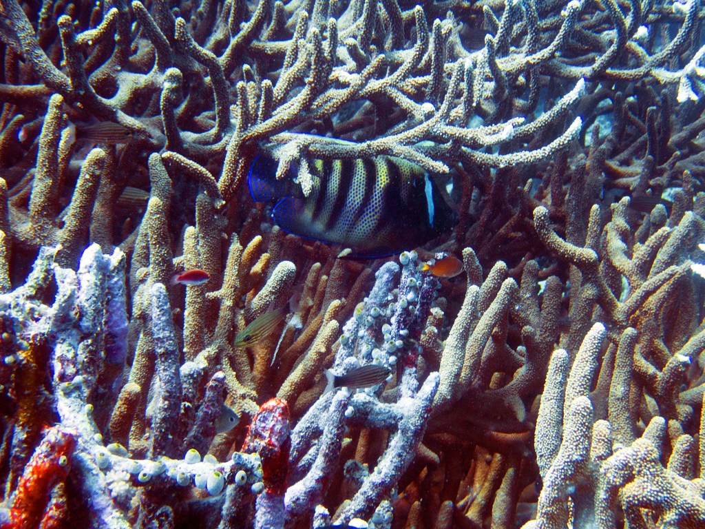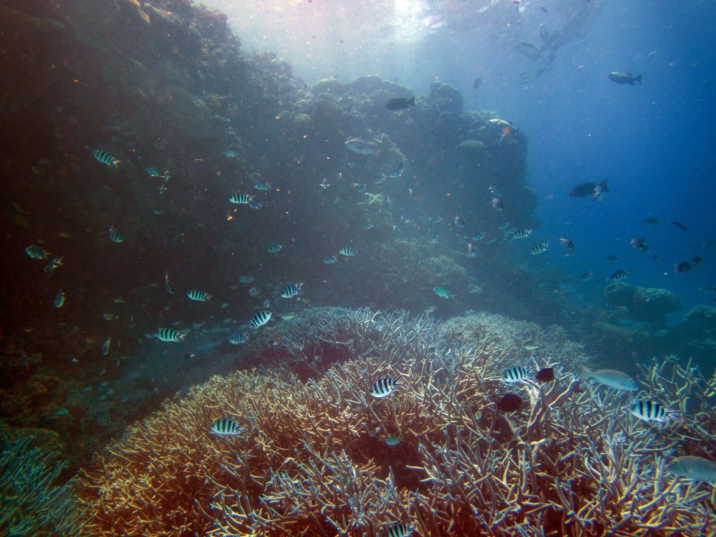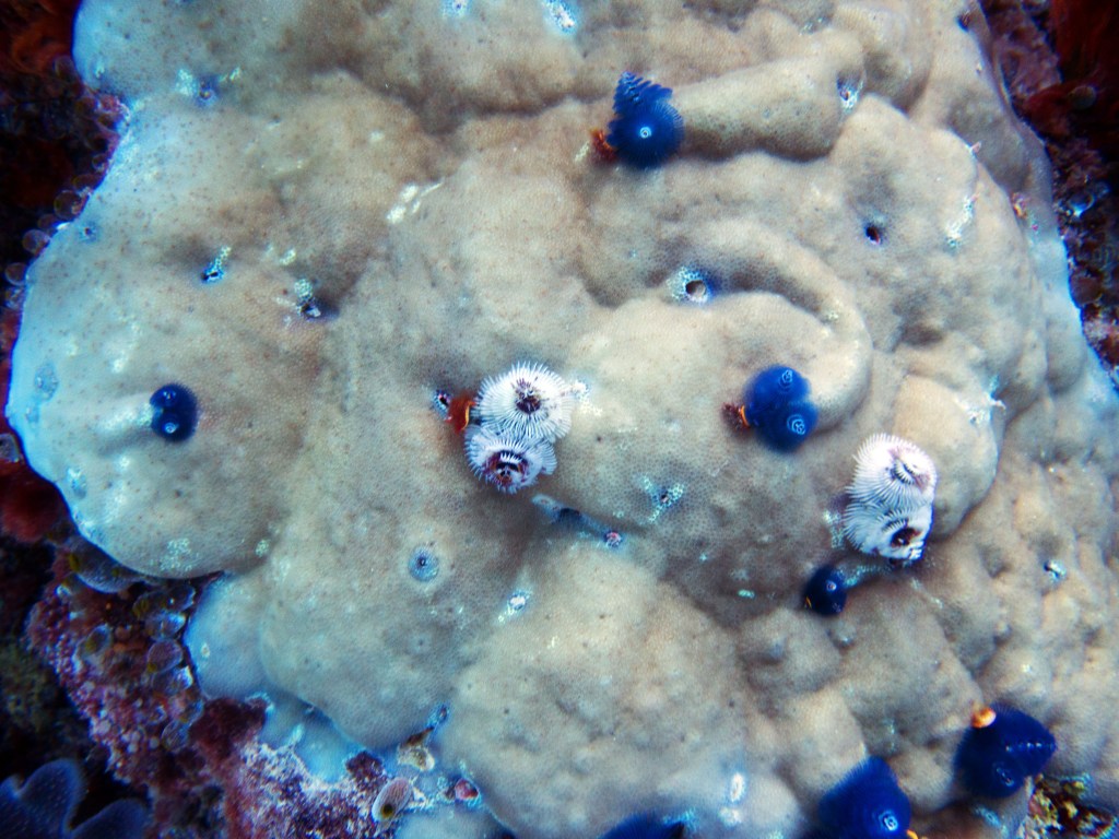 La première plongée que nous effectuons vers un endroit nommé Phills, Nous croisons une énorme quantité de poissons clown. Le récif est en plutôt bonne santé pour dire qu’il a été frappé il y a quelques années par un ouragan qui avait décimé une bonne partie des coraux. Nous croisons également une seiche qui s’empresse de partir à notre arrivée.