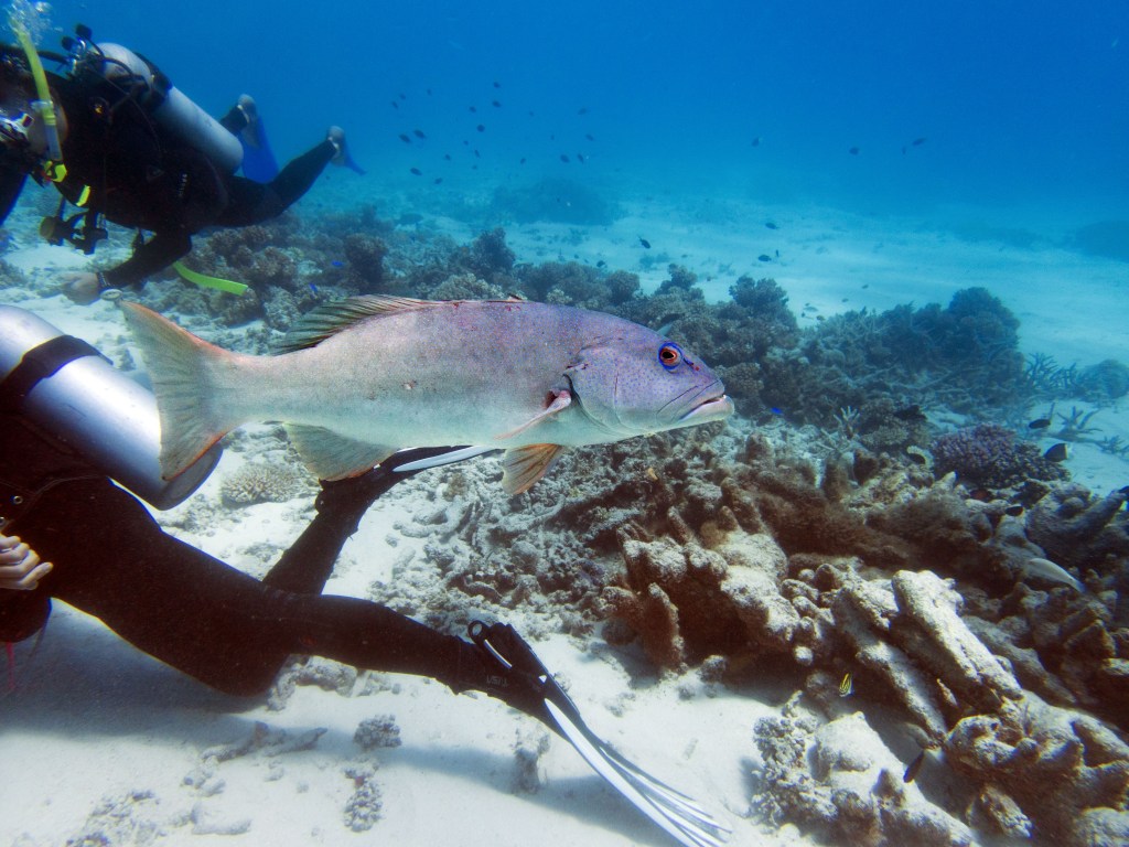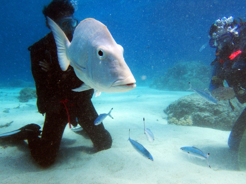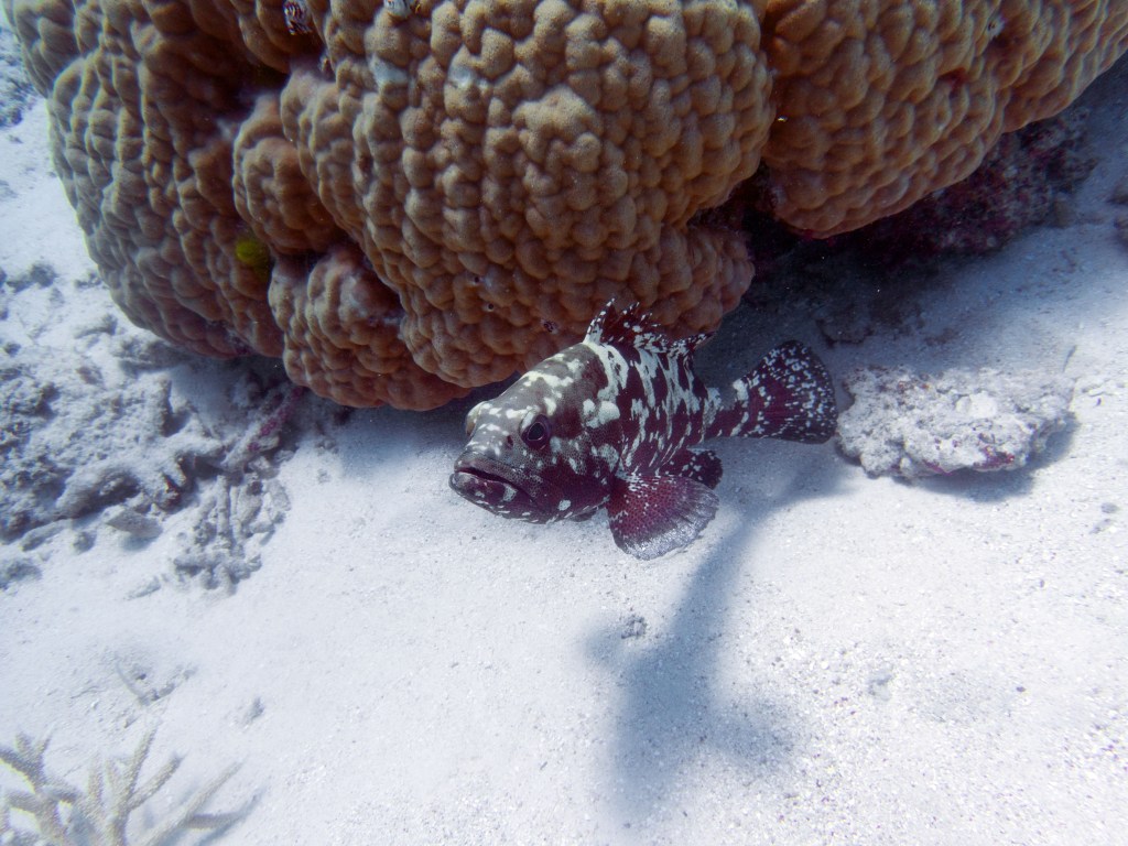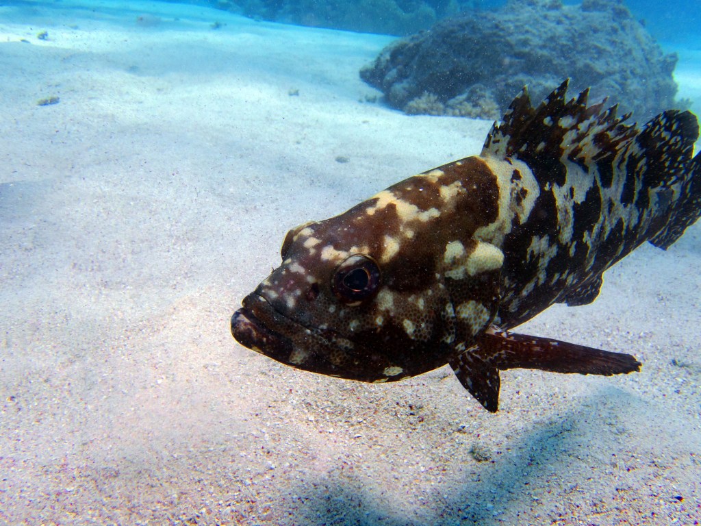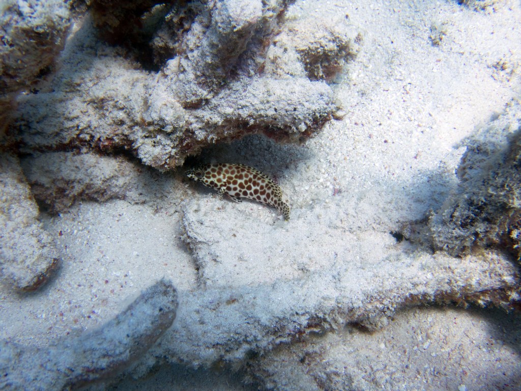 Castle rock est notre dernier site de plongée du jour. A peine arrivés au fond de l’eau que nous jouons avec un grouper, qui apparemment adore venir taquiner les plongeurs. C’est un peu comme un chien, il vient vers vous, attend que vous le poussiez avec le poing puis revient. Il faut toujours garder le poing fermé, car sinon vous risquez de perdre un doigt. Bien entendu il ne faut pas essayer de faire ça avec un autre grouper, celui-ci est vraiment particulier.