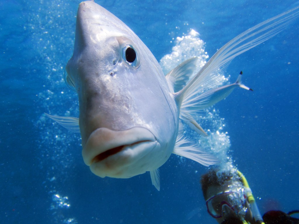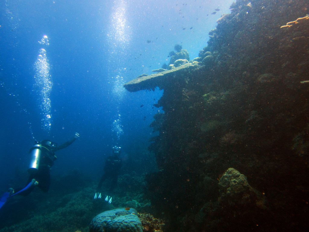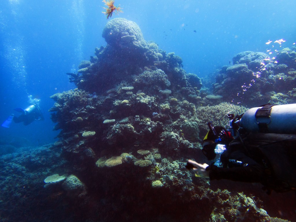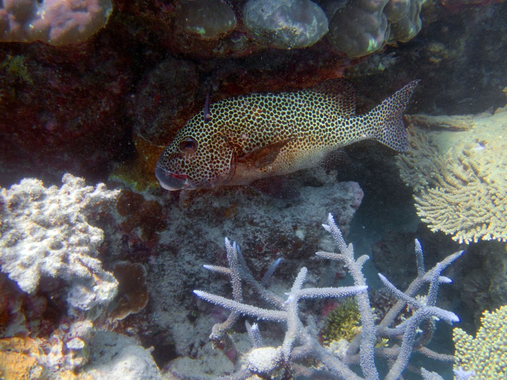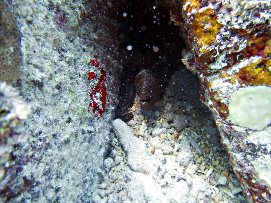 Castle rock est notre dernier site de plongée du jour. A peine arrivés au fond de l’eau que nous jouons avec un grouper, qui apparemment adore venir taquiner les plongeurs. C’est un peu comme un chien, il vient vers vous, attend que vous le poussiez avec le poing puis revient. Il faut toujours garder le poing fermé, car sinon vous risquez de perdre un doigt. Bien entendu il ne faut pas essayer de faire ça avec un autre grouper, celui-ci est vraiment particulier.